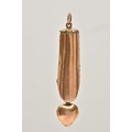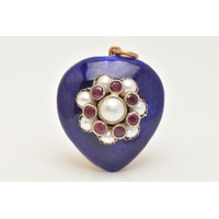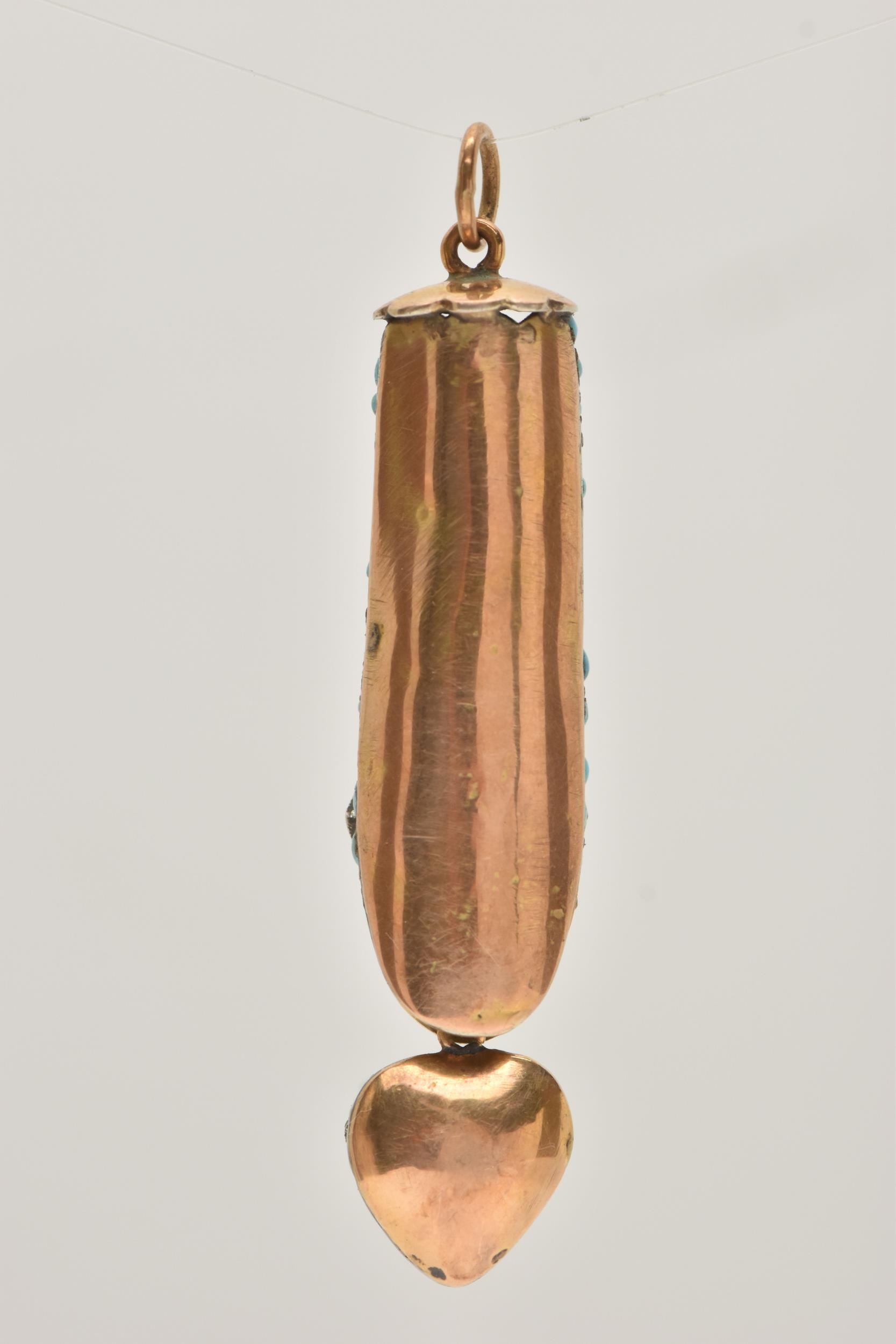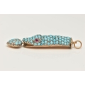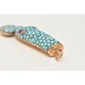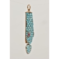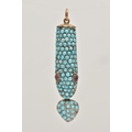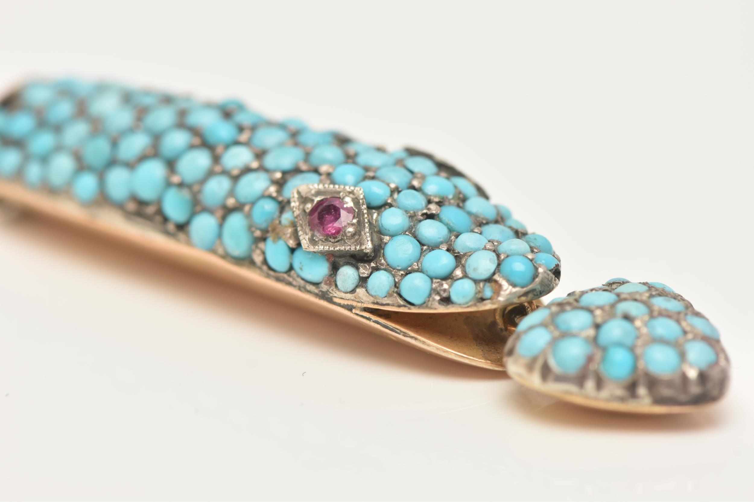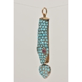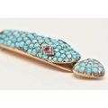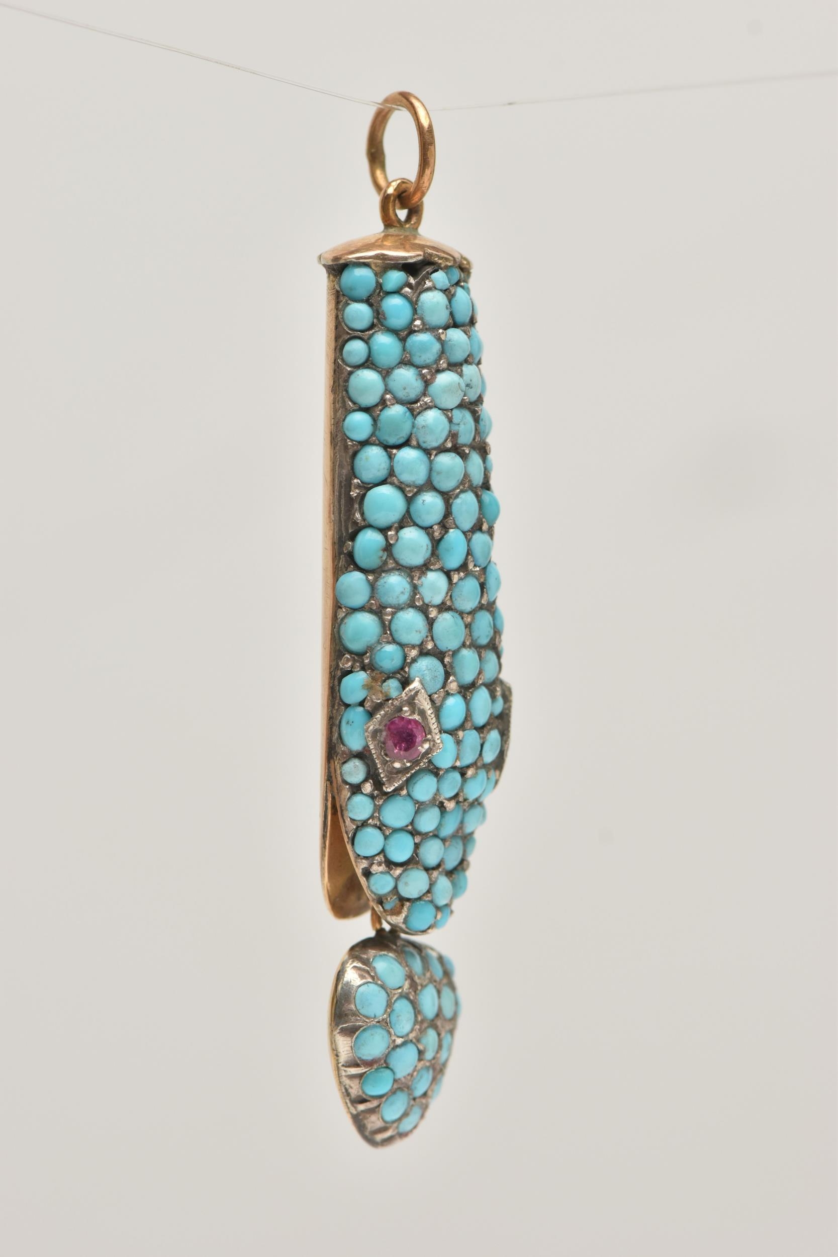 A TURQUOISE AND RUBY SNAKE PENDANT, snake head set with turquoise cabochon body and two circular cut ruby eyes, open mouth fitted with a heart dropper set with turquoise cabochons, in a white metal mount with a yellow metal reverse, unmarked, fitted with a jump ring for suspension, length including jump ring 60mm, approximate gross weight 9.7 grams (condition report: general light wear, all stones secure, light surface scratches but overall condition good)