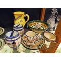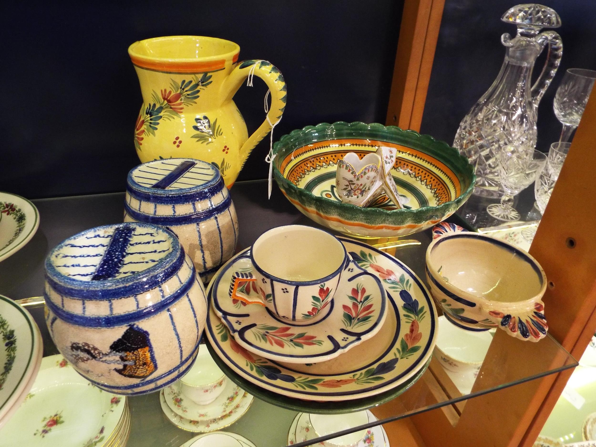 A selection of Quimper barrels, yellow jug, porringer, cup and saucer, plates and small vase