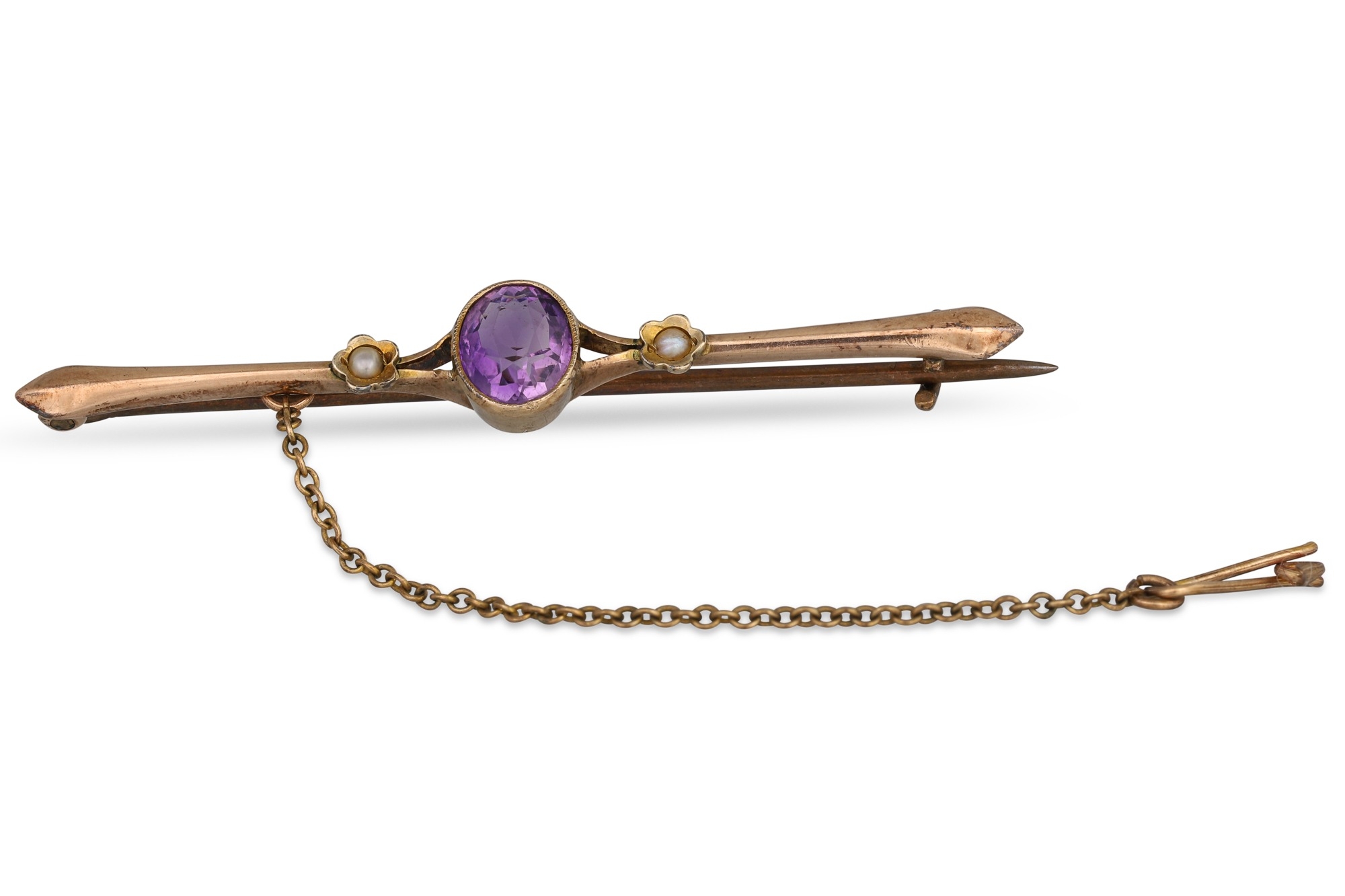 AN ANTIQUE AMETHYST AND SEED PEARL BAR BROOCH, mounted in 9ct gold