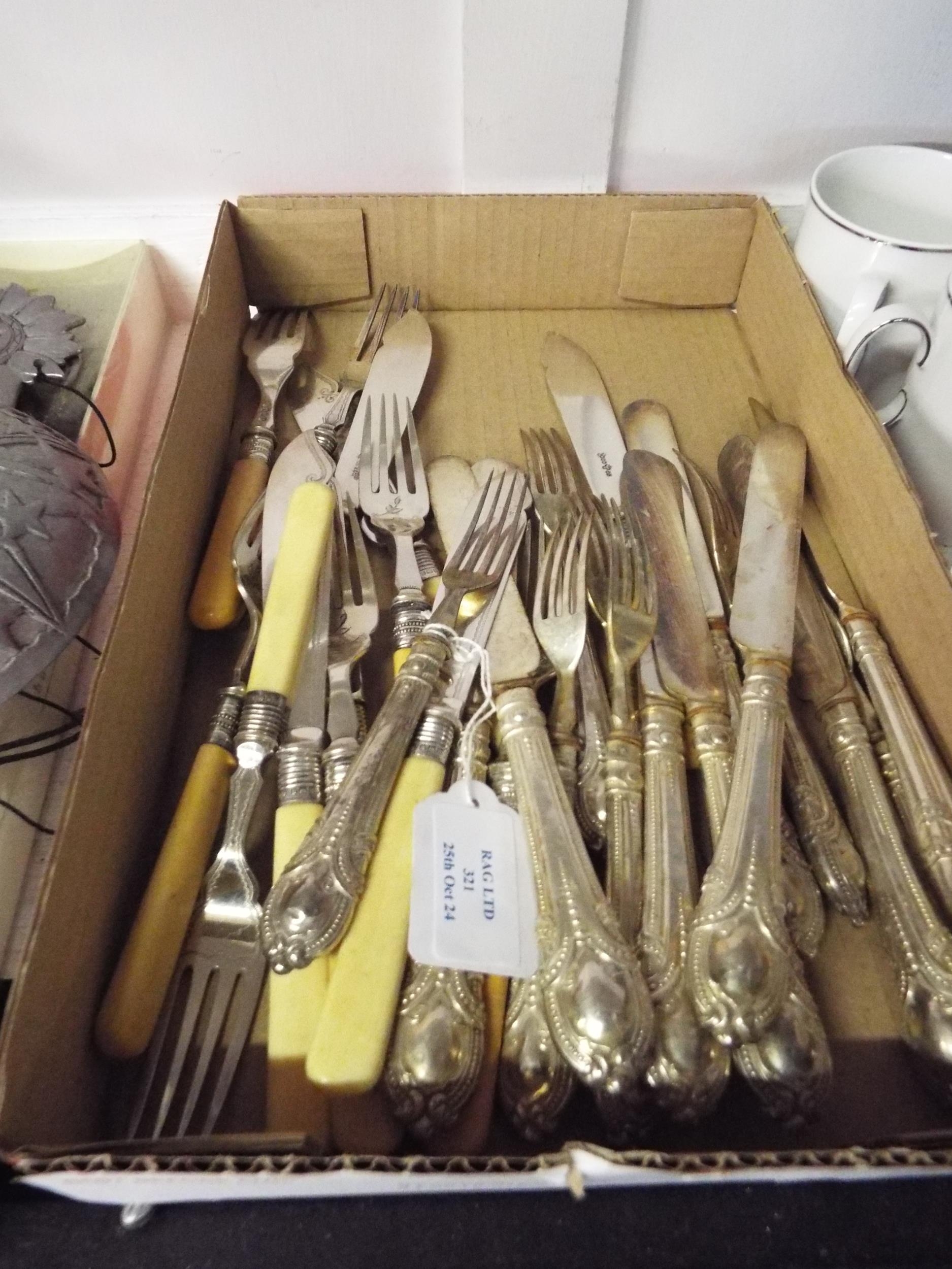 A set of six bone handle fish cutlery and a set of white metal dessert cutlery