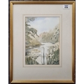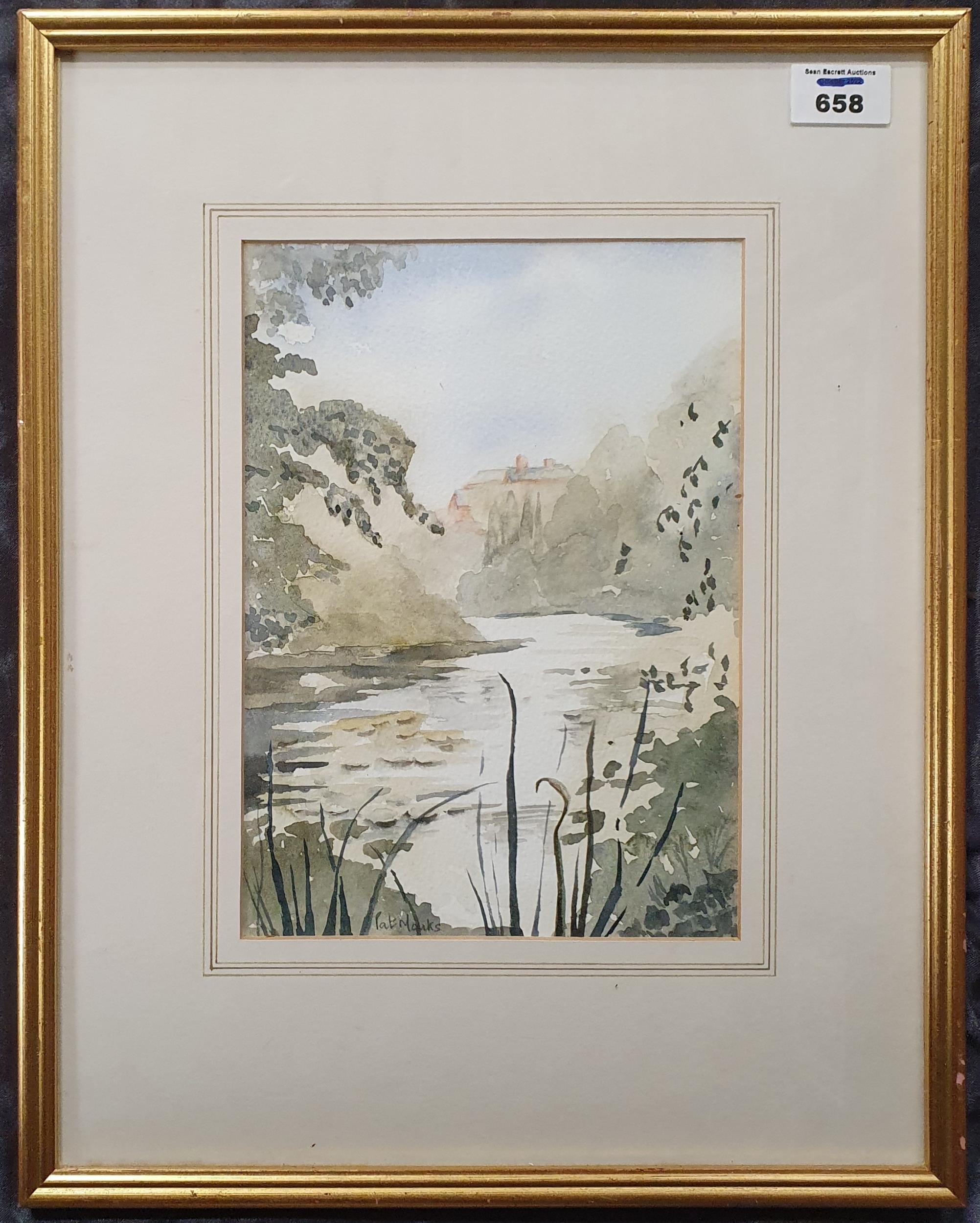 A Watercolour of a Lake with house in the foreground. Signed LR Pat Monks.