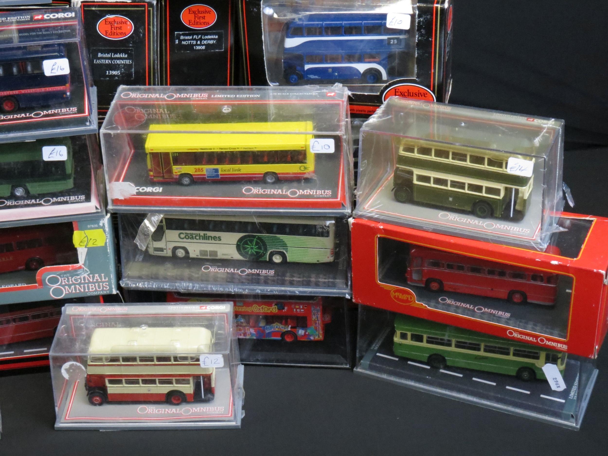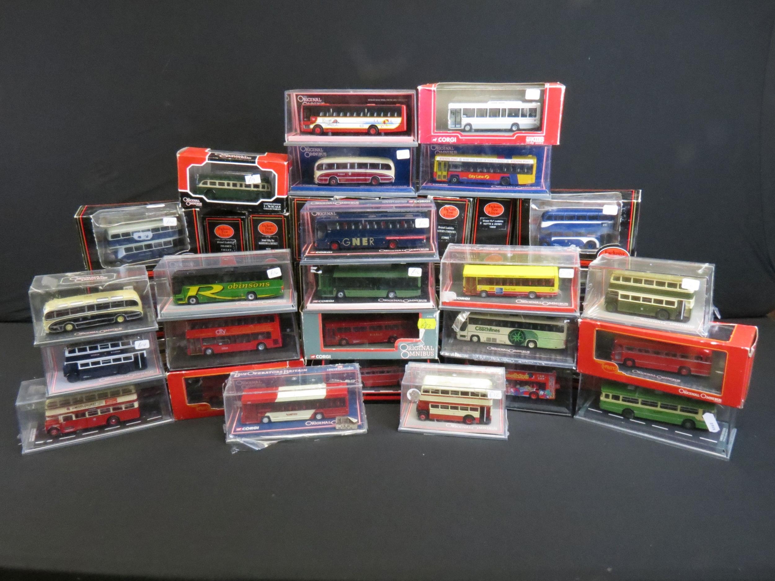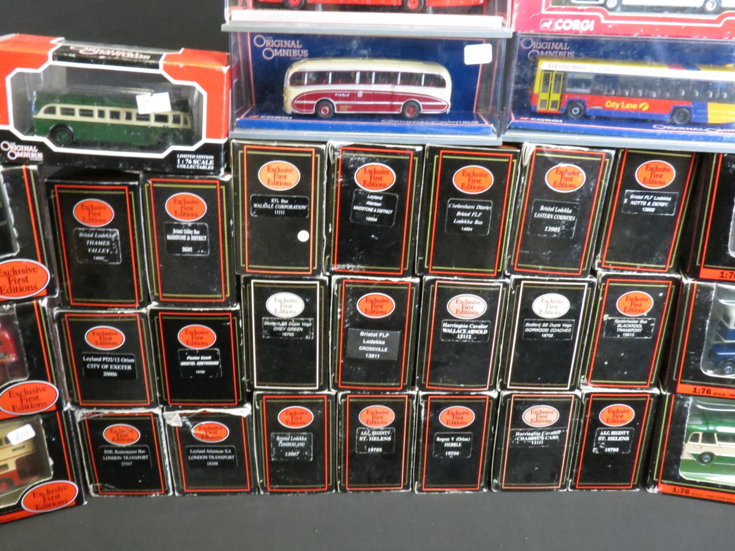 50 Boxed / cased 1/76 scale diecast model buses to include 27 x EFE Exclusive First Editions, 20 x Corgi Original Omnibus featuring Limited Edition and Bus Operators In Britain models, 2 x Creative Master Northcord Ltd Creative Masters models including UKBUS0004 and 1 x Corgi KMB model, all diecast ex, boxes / cases gd-vg overall with cracks in a couple of cases (2 Boxes)