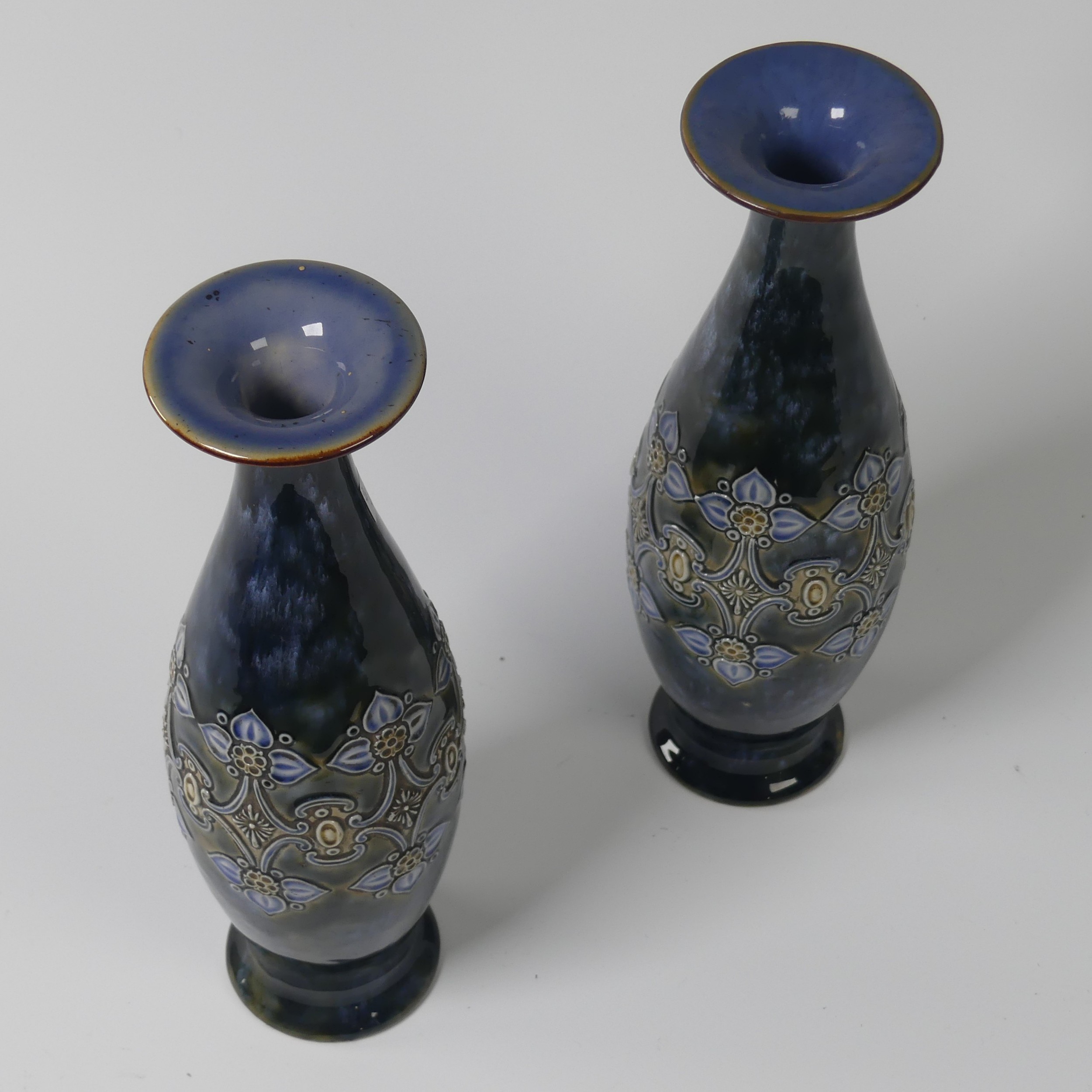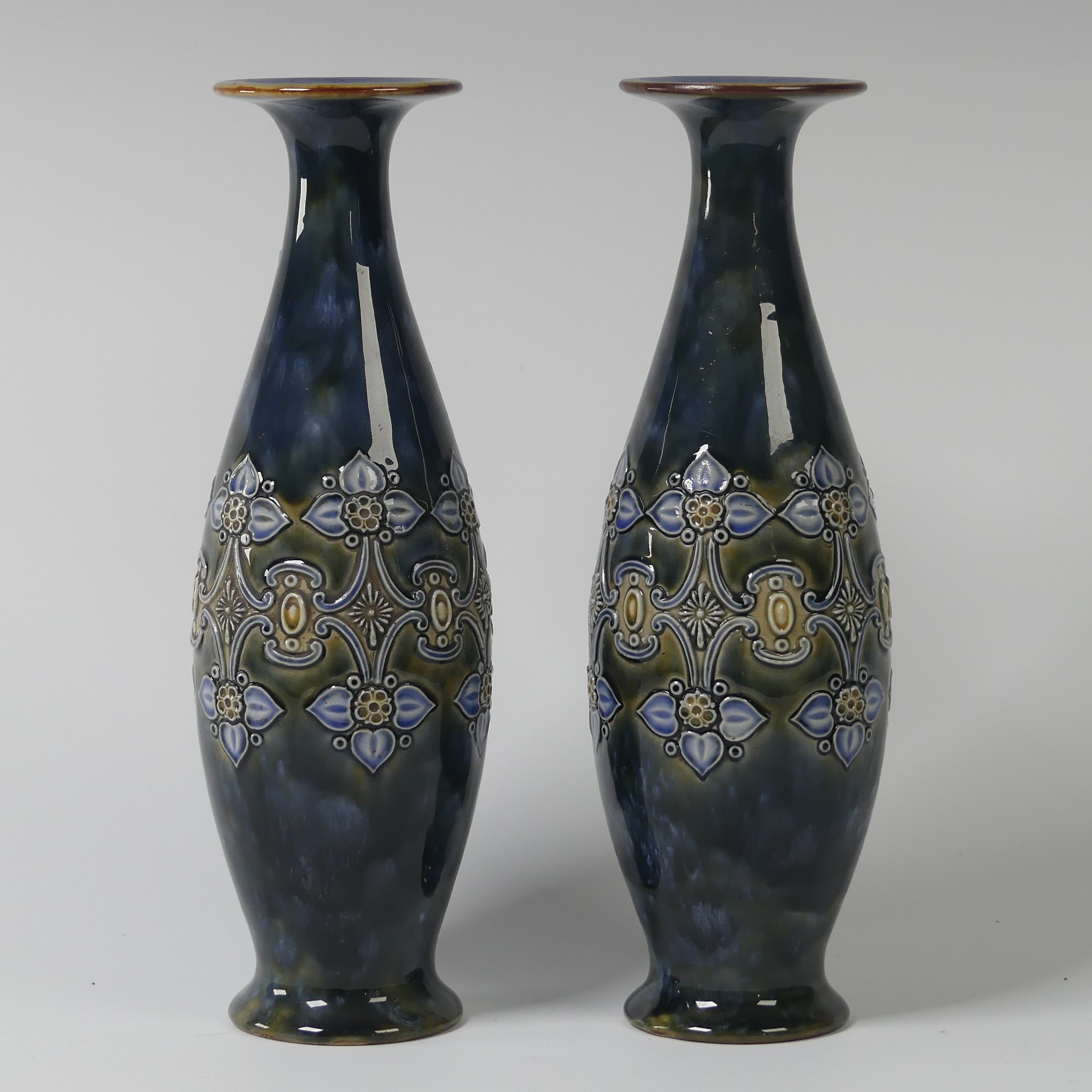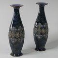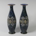 A pair of Royal Doulton Vases, early 20th century, decorated in coloured enamels, impressed mark to base, no.'6222', 27.5cm high (2)