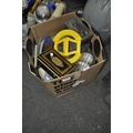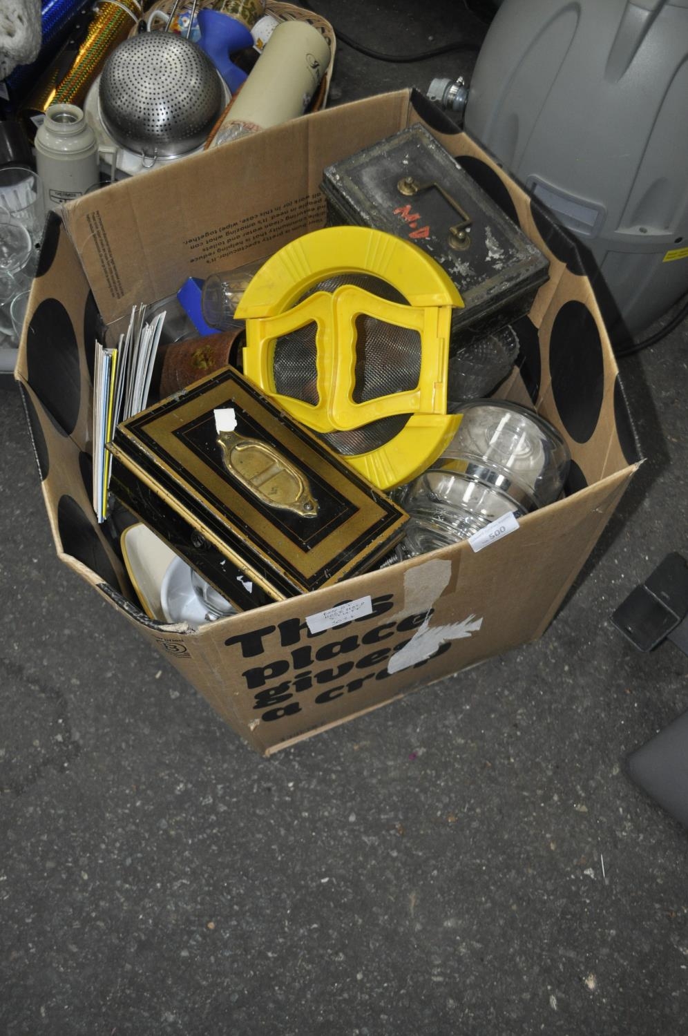 BOX OF HOUSEHOLD STUFF INC CASH BOX, GLASS JARS, POSTCARDS ETC