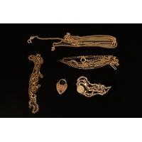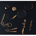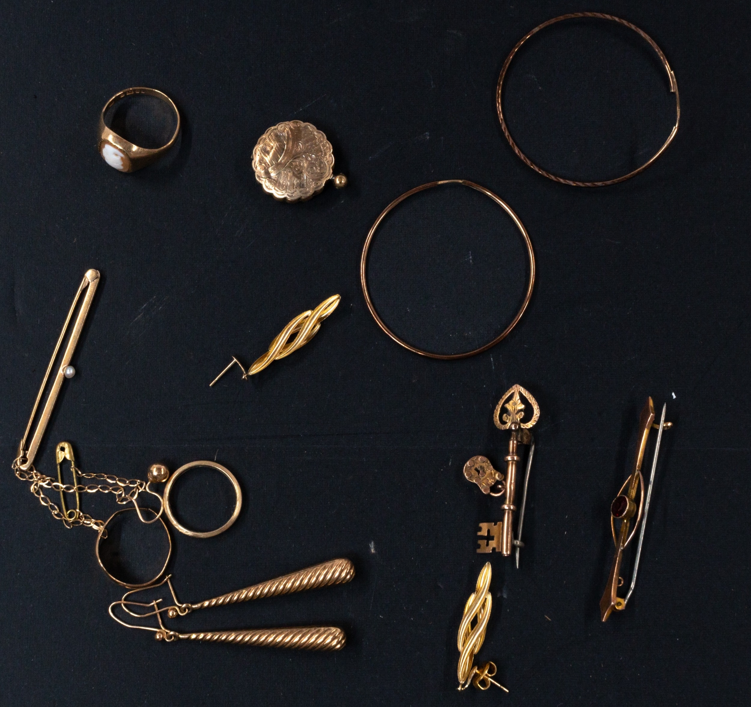 Jewellery: A collection of 9ct gold jewellery, including four pairs of earrings, three brooches, three rings, total weight 17.8g. Plus a round rolled gold locket.