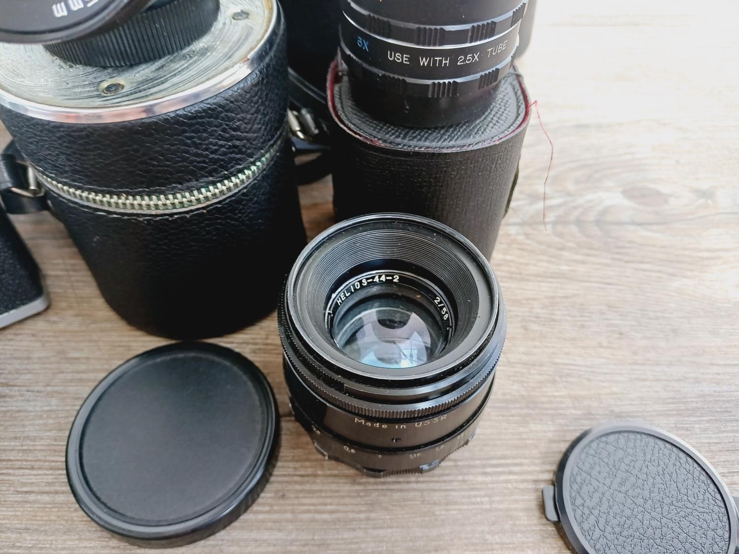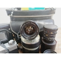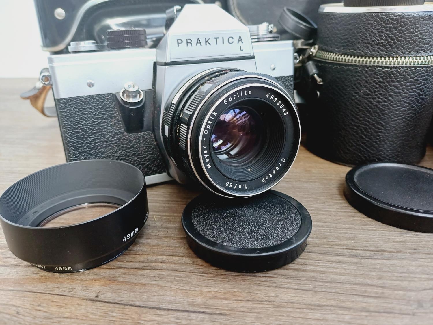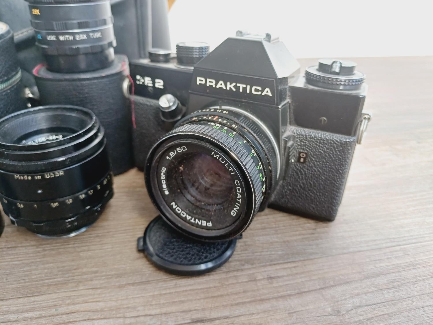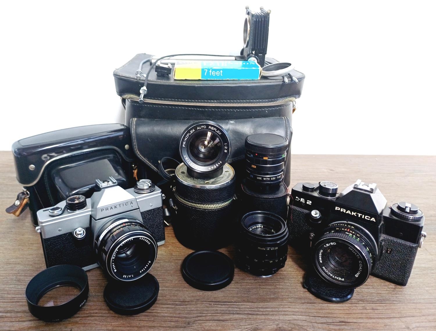 A camera bag containing two Pentacon Praktica M42-mount 35mm SLR cameras, one L fitted with Meyer-Optik Oreston 1.8/50 lens and one EE2 fitted with Pentacon electric 1.8/50 lens, KMZ Helios-44-2 2/58 M42 mount lens, cased Prinzflex 1:2.8 35mm auto reflex M42 mount lens etc.