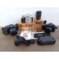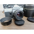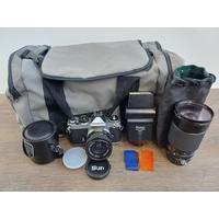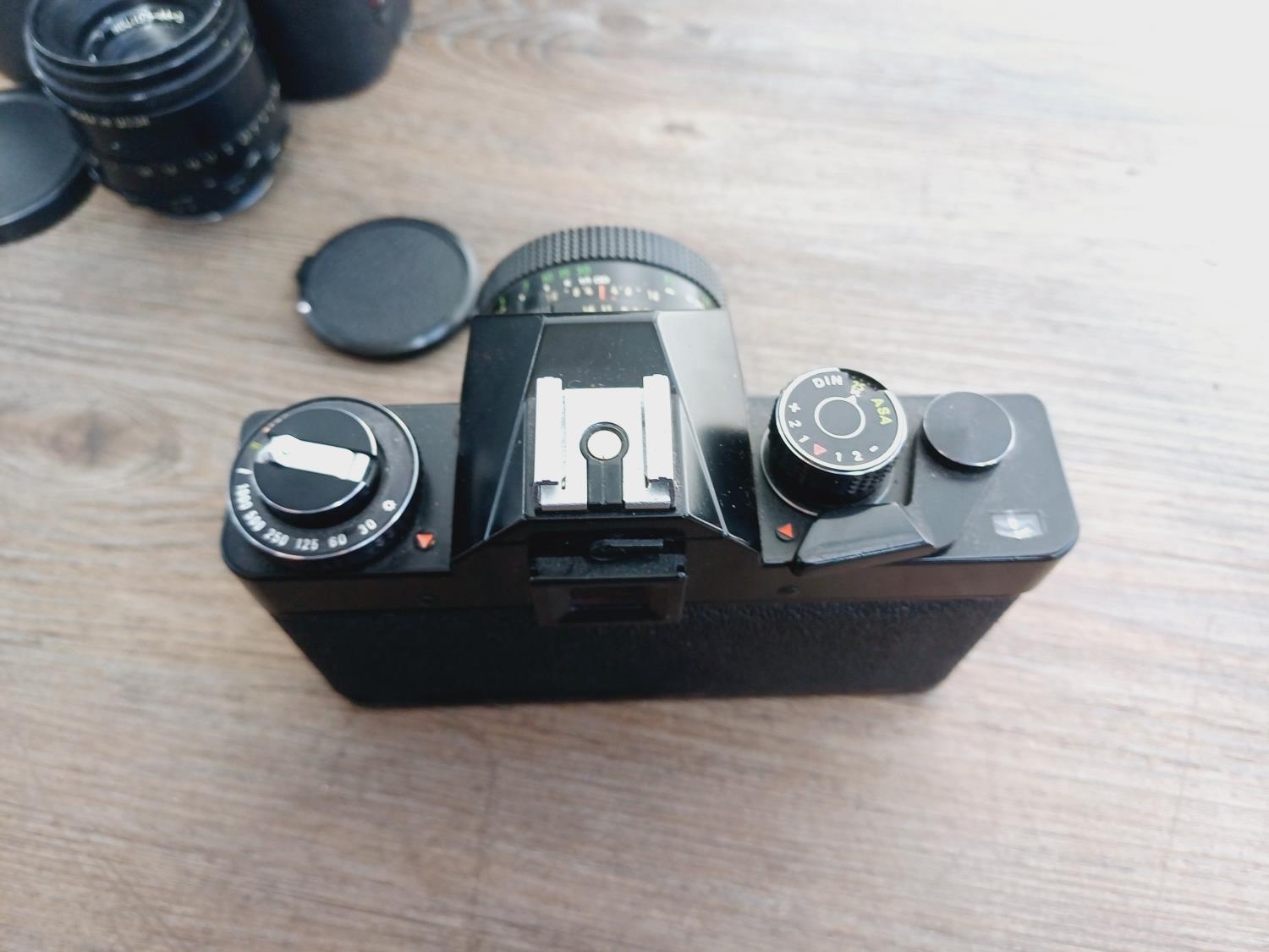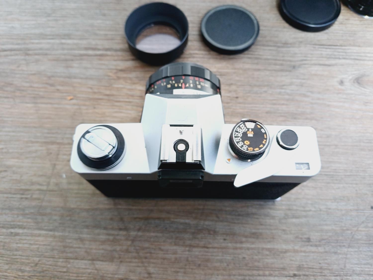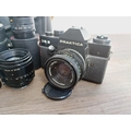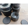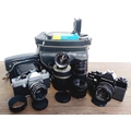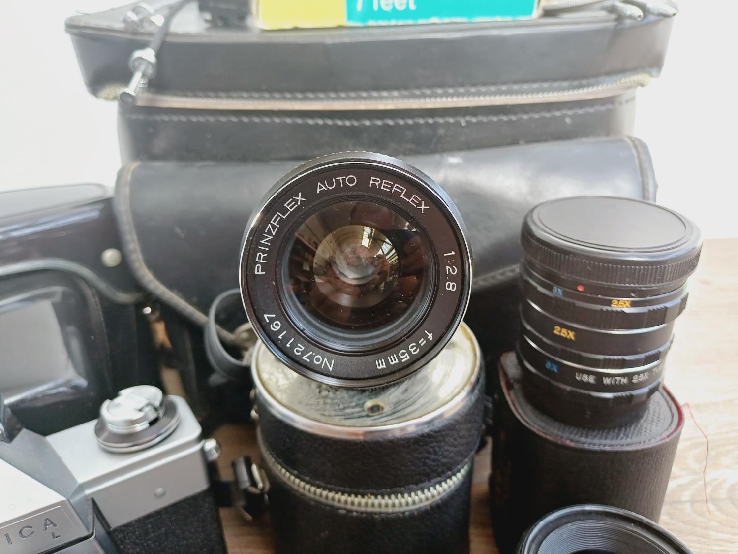 A camera bag containing two Pentacon Praktica M42-mount 35mm SLR cameras, one L fitted with Meyer-Optik Oreston 1.8/50 lens and one EE2 fitted with Pentacon electric 1.8/50 lens, KMZ Helios-44-2 2/58 M42 mount lens, cased Prinzflex 1:2.8 35mm auto reflex M42 mount lens etc.