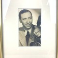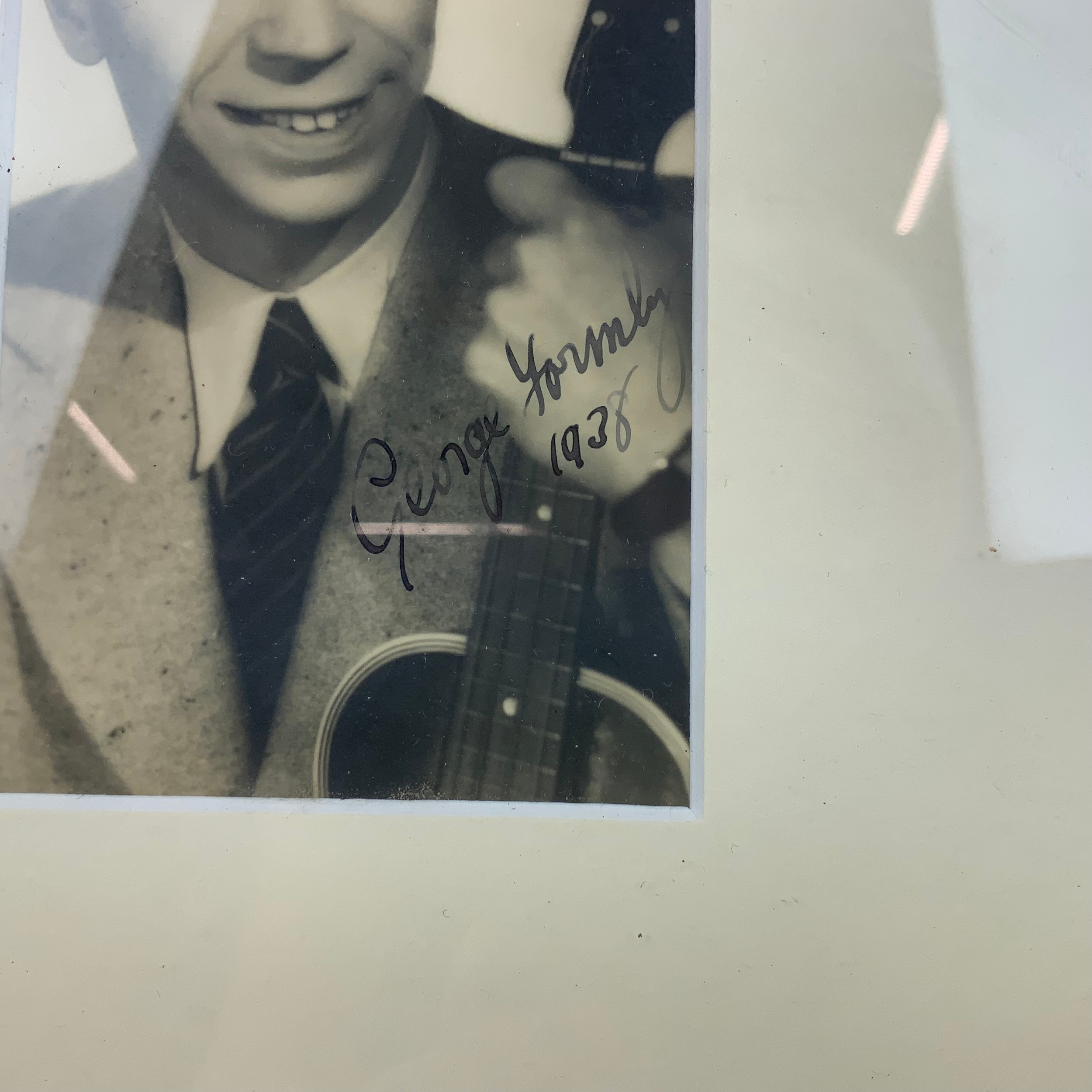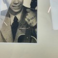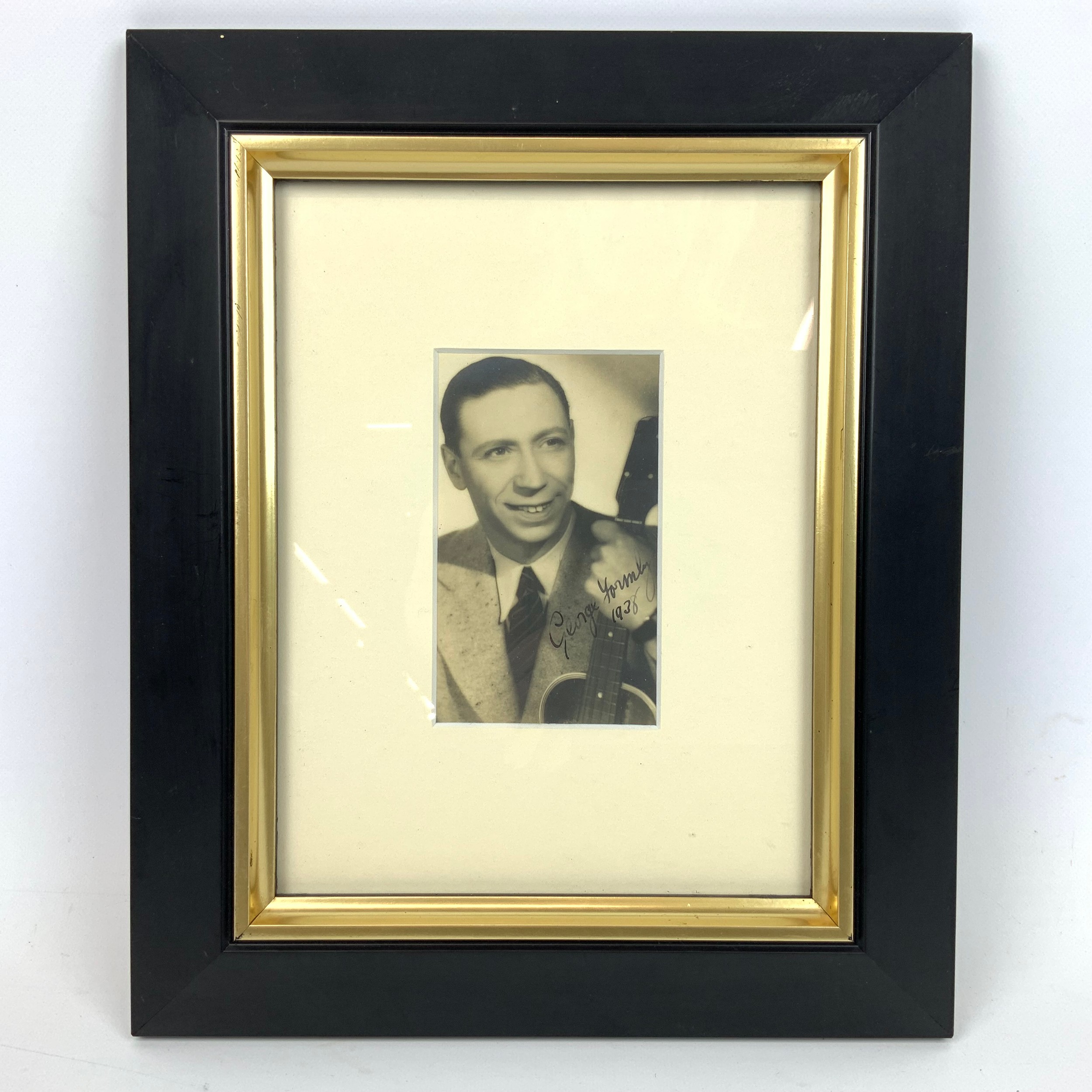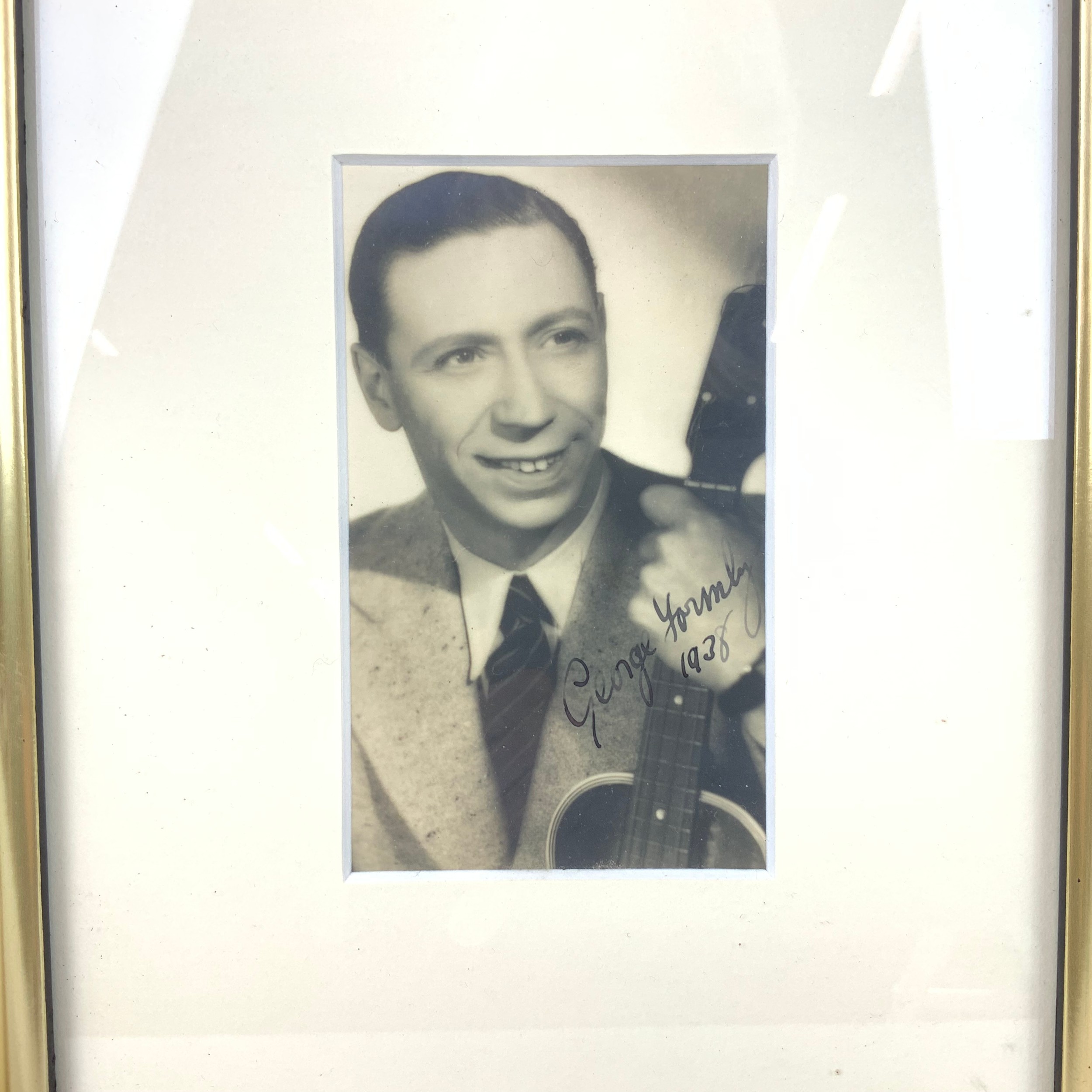 A George Formby signed black and white photograph, inscribed in ink and dated 1938, 7.5cm x 12cm
