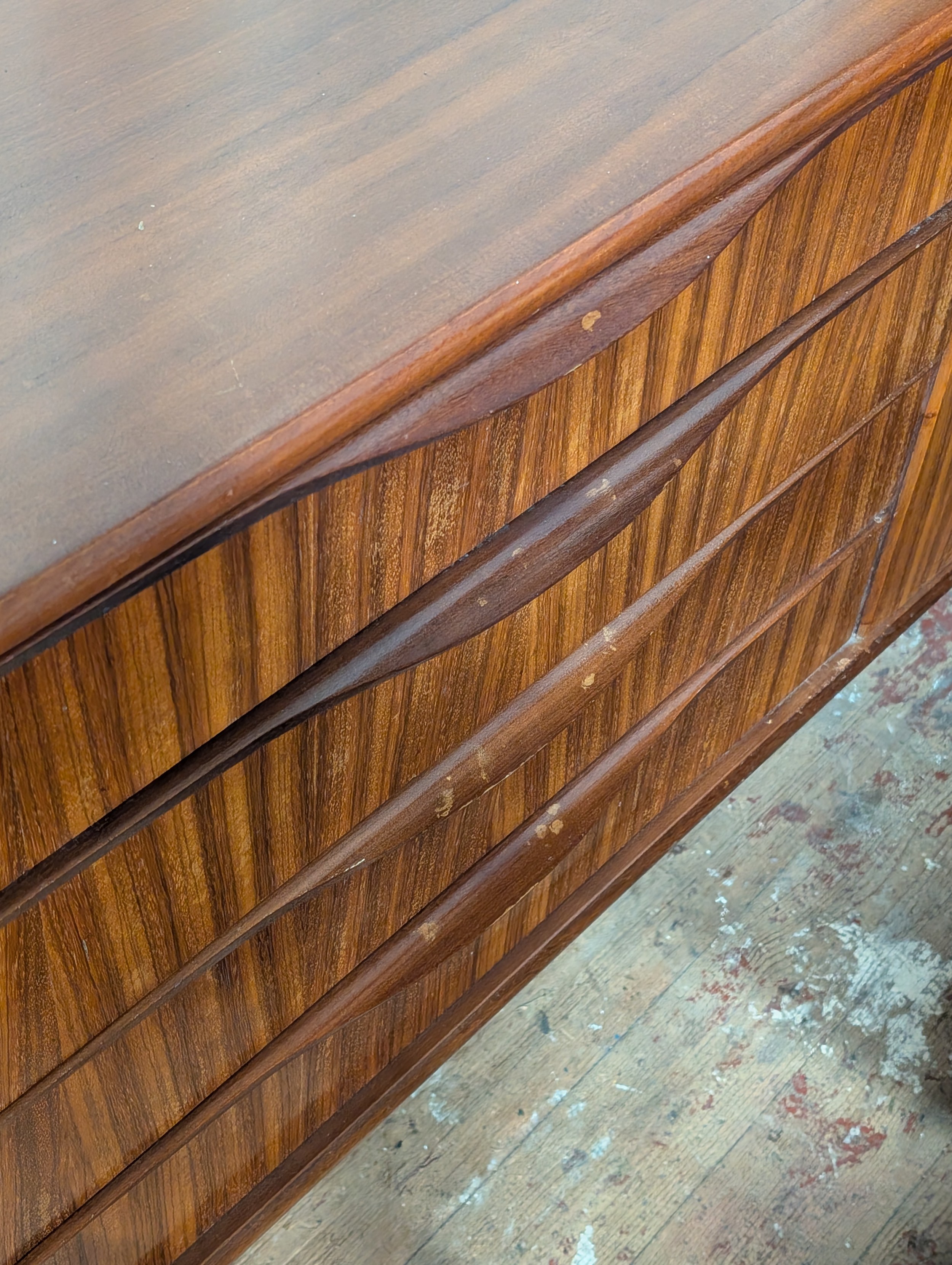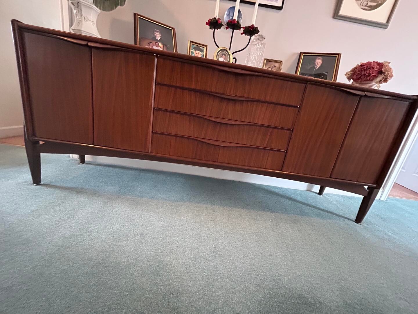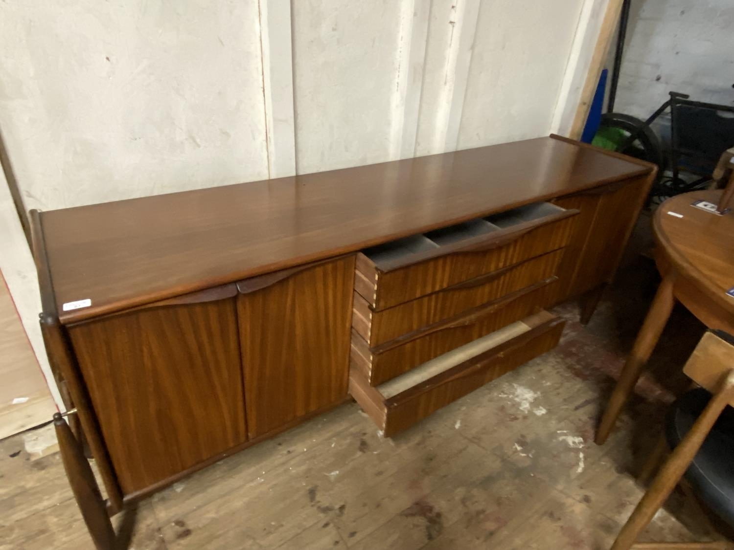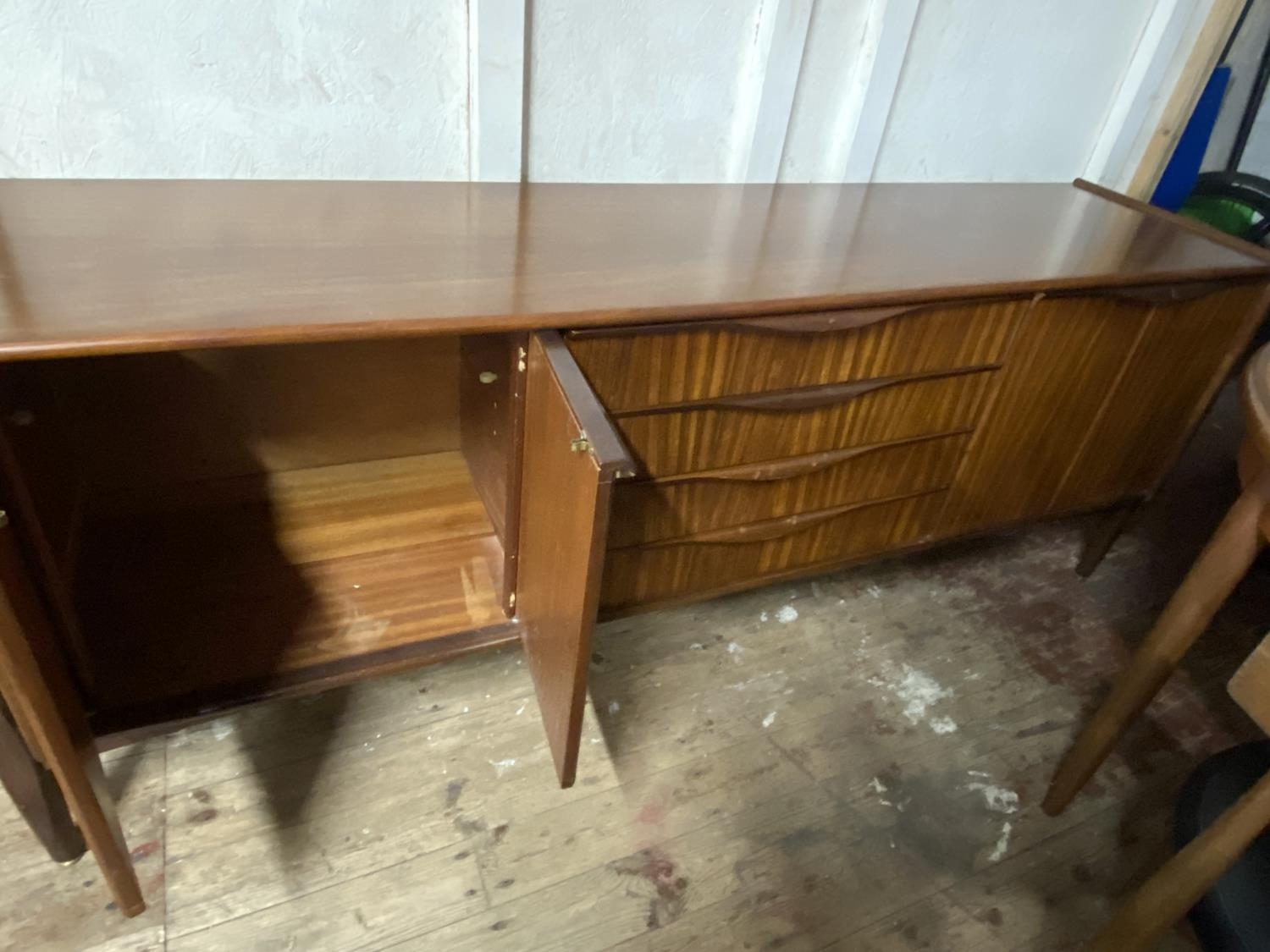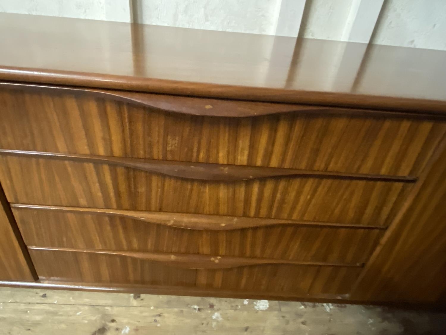 A vintage G-Plan teak sideboard with four central draws and two end cupboards. 185cm x 45cm x 77cm. Collection only.