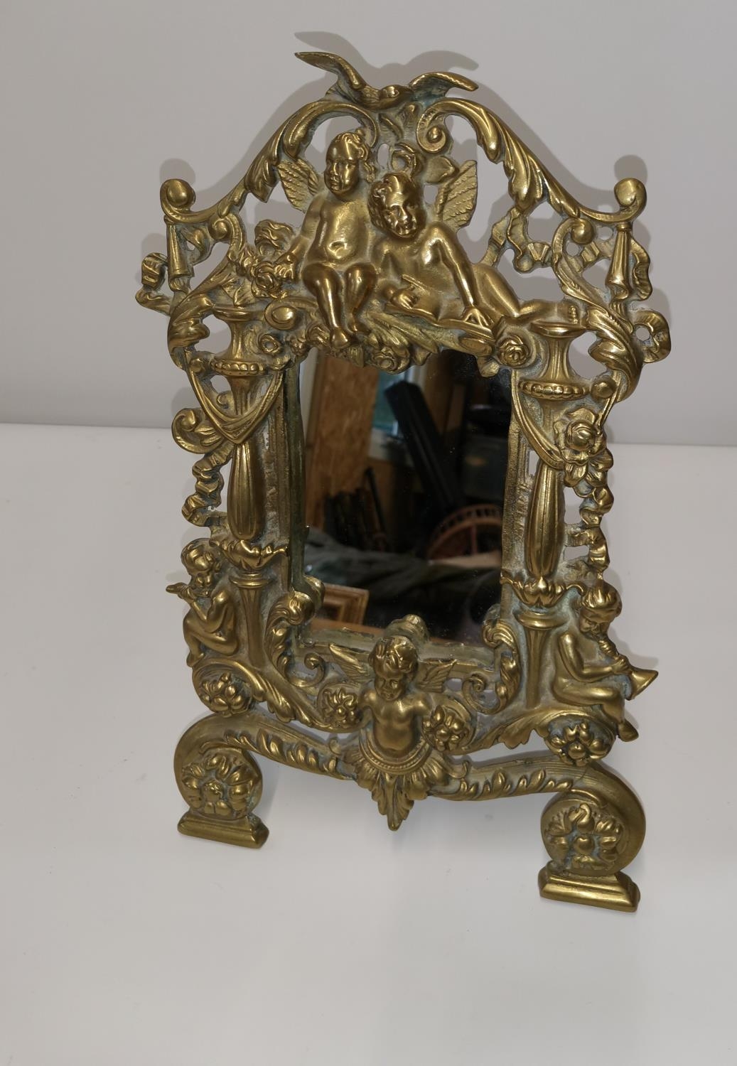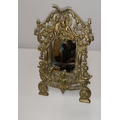 20th century brass frame mirror decorated with cherubs 35 cms x 24 cms