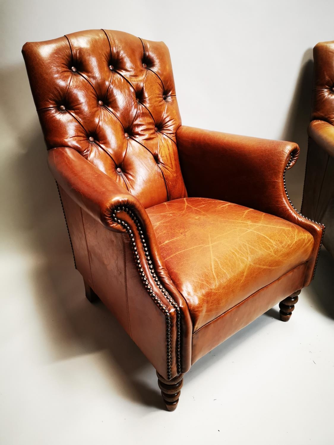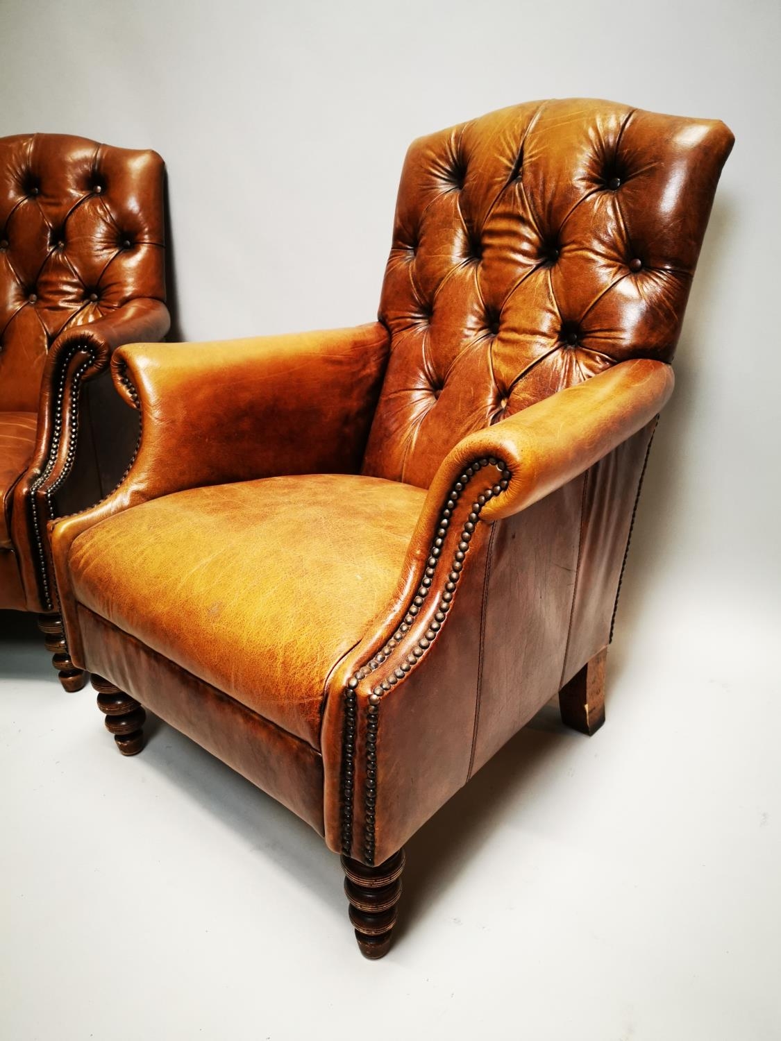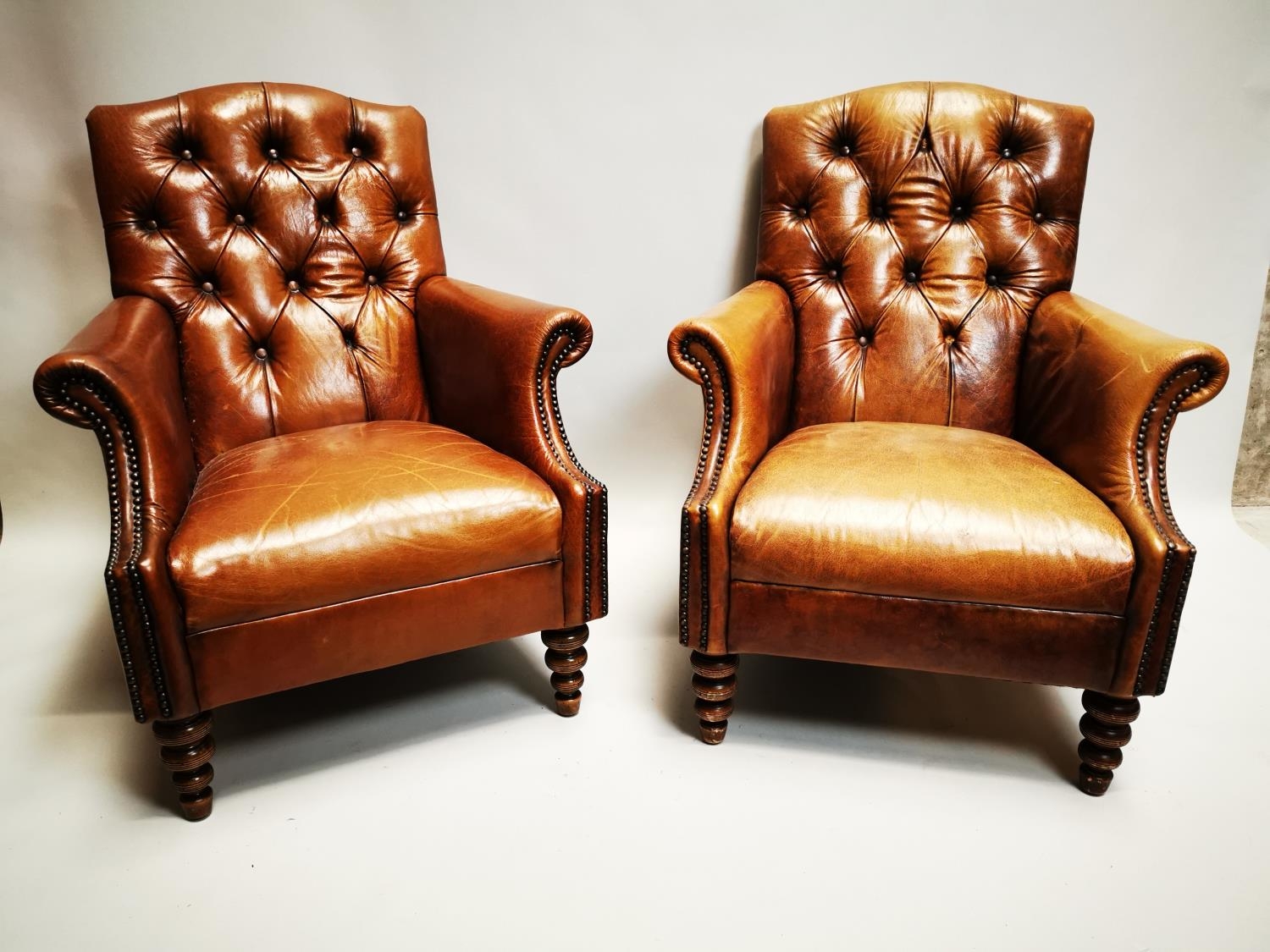 Pair of exceptional quality hand died English leather deep buttoned arm chairs on turned walnut legs {97 cm H x 76 cm W x 79 cm D}.