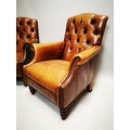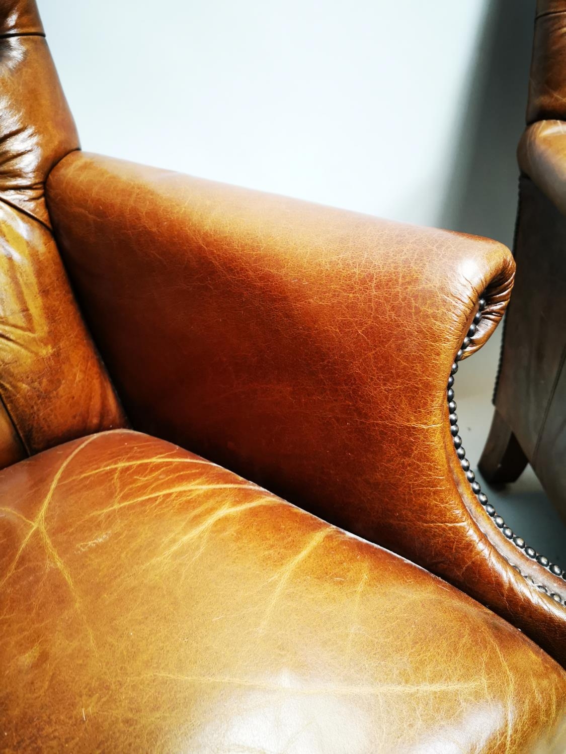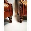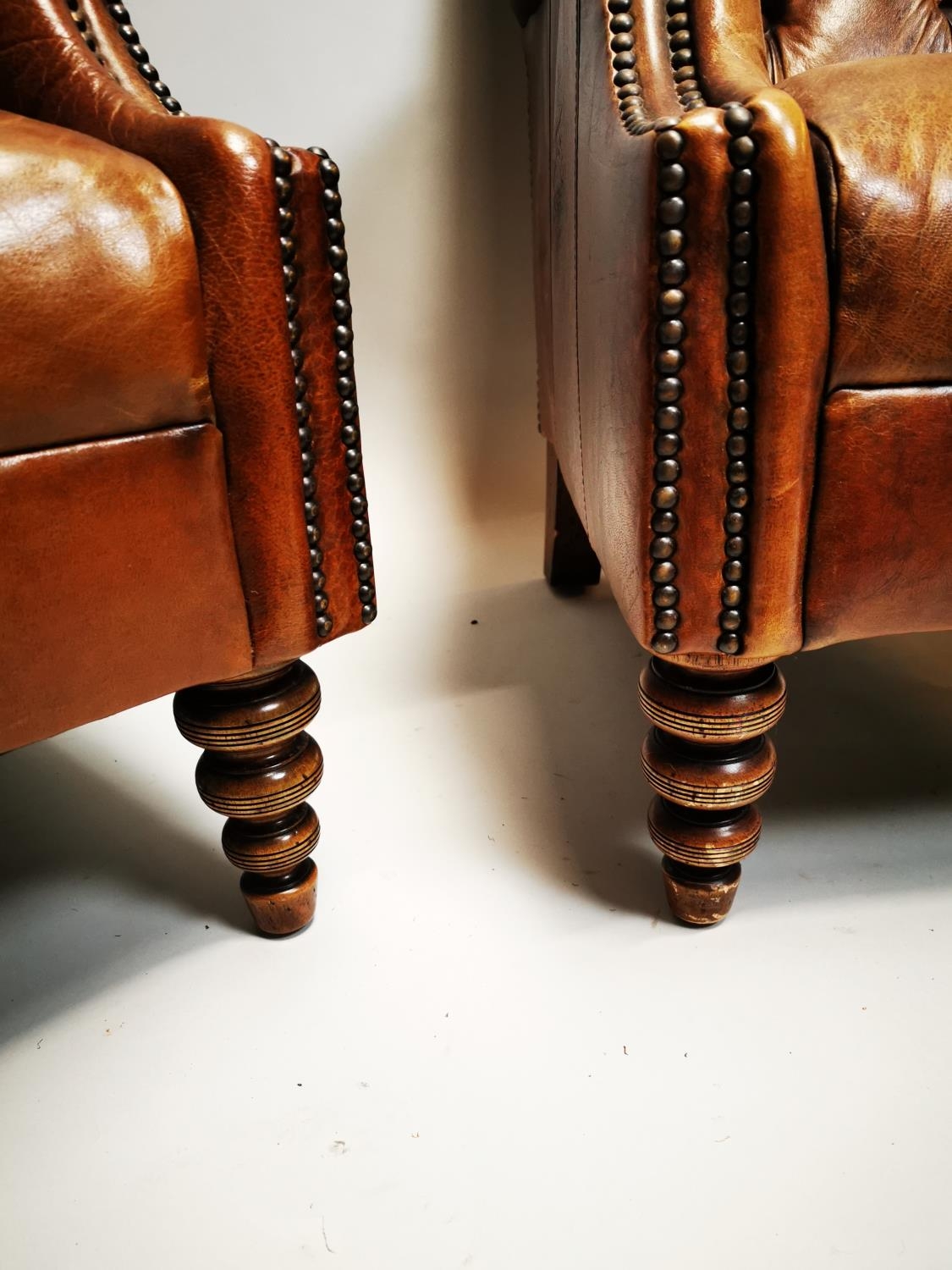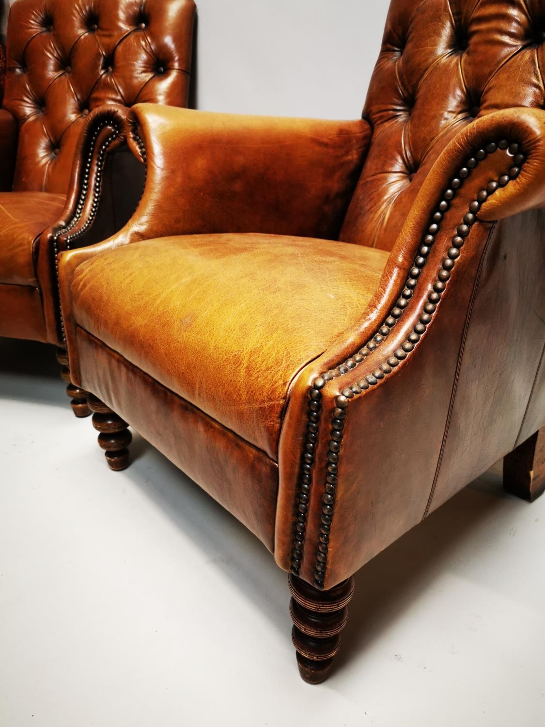 Pair of exceptional quality hand died English leather deep buttoned arm chairs on turned walnut legs {97 cm H x 76 cm W x 79 cm D}.