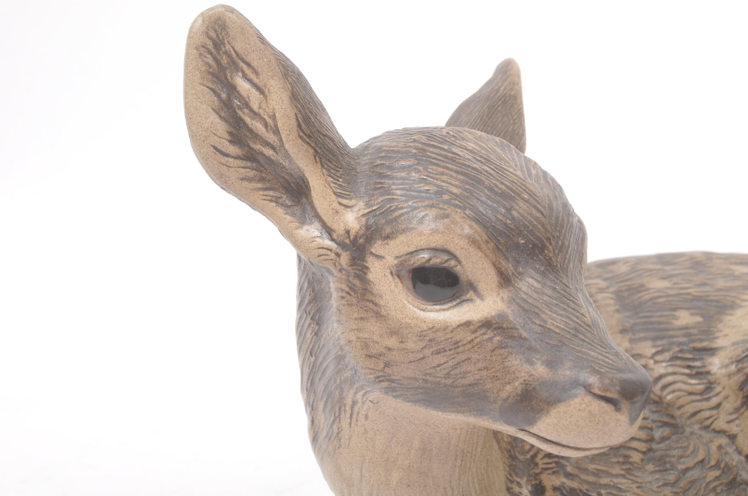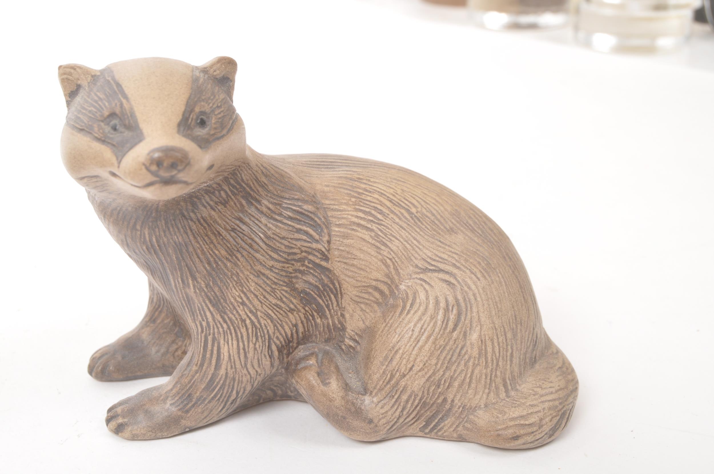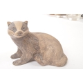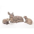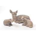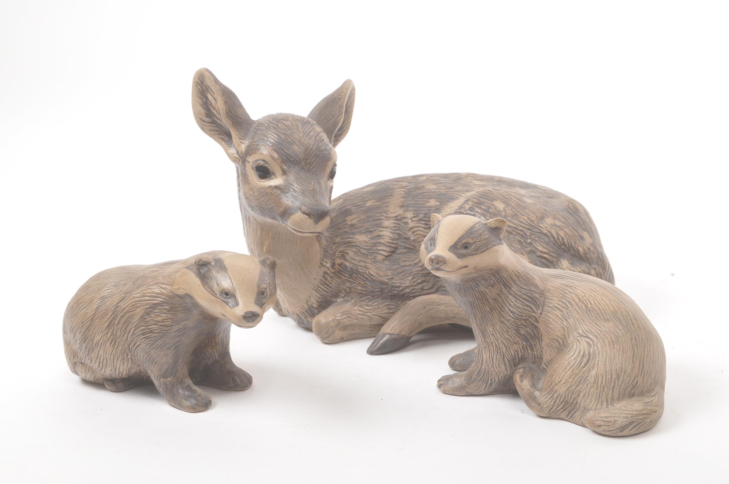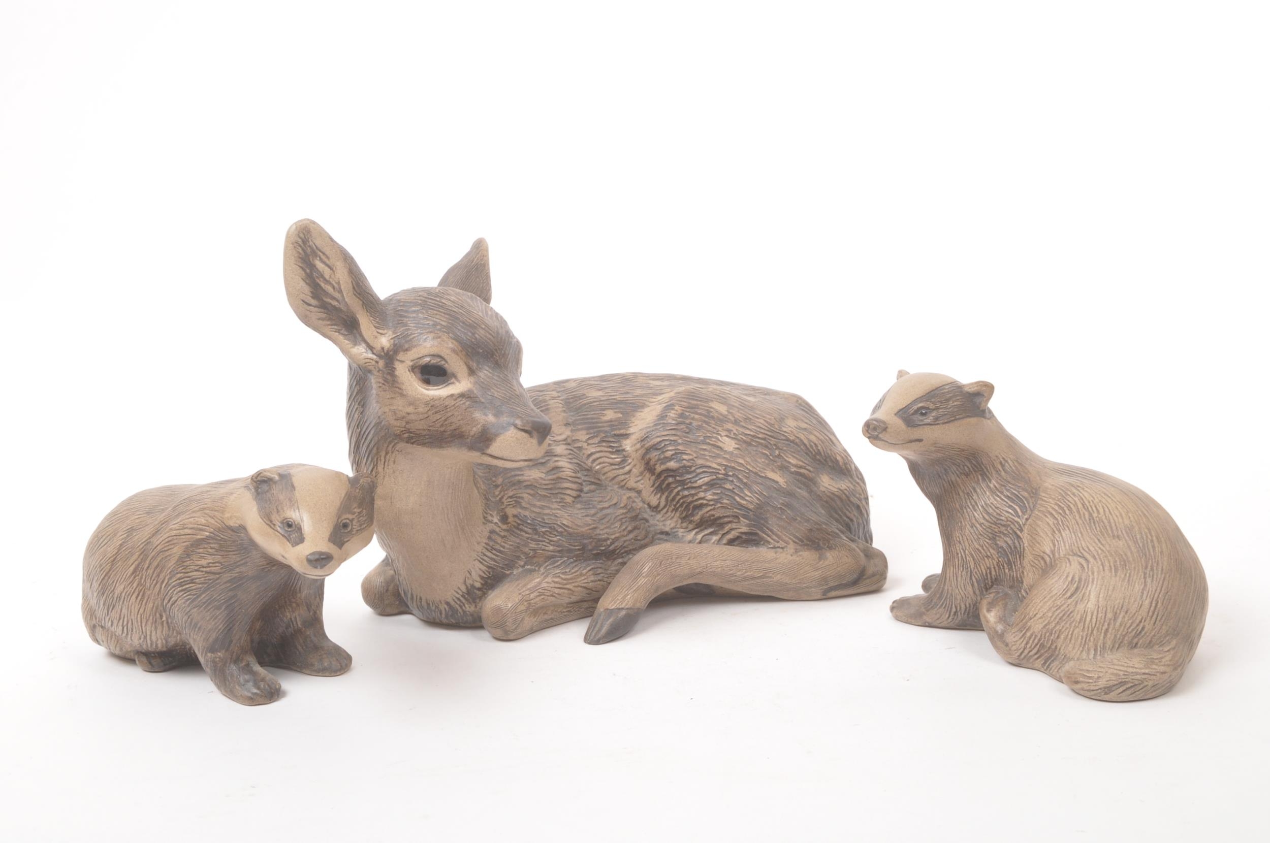 Poole pottery - 20th century - A large hand made figure of a fawn and two smaller figure badgers with textured markings in muted tones. Makers mark to the base. Approximate measurements: 18cm x 22cm
