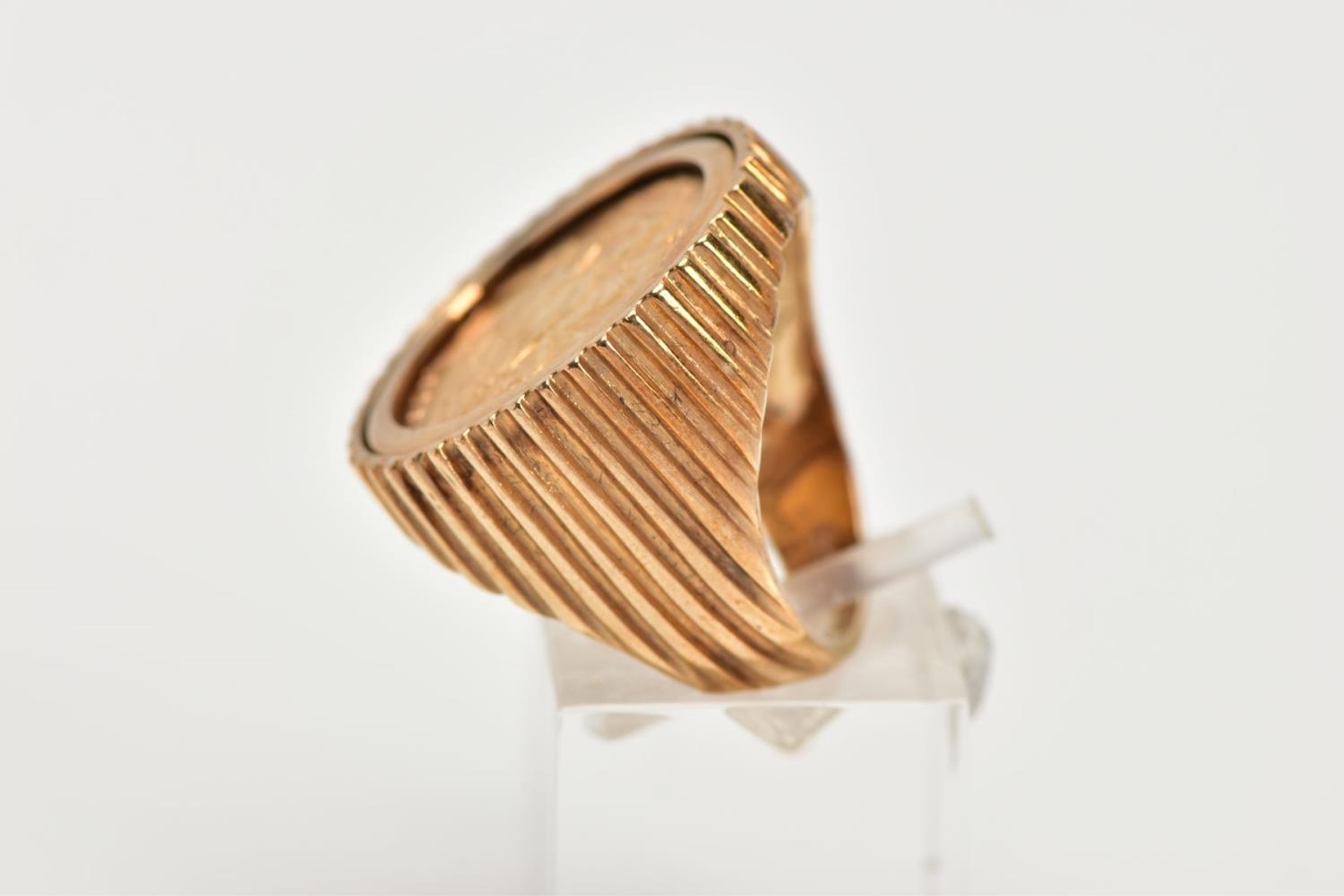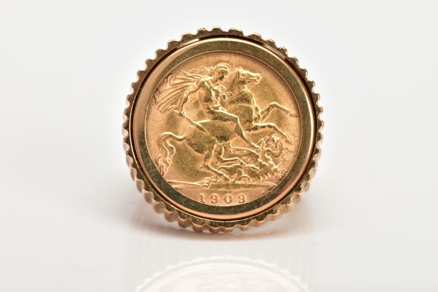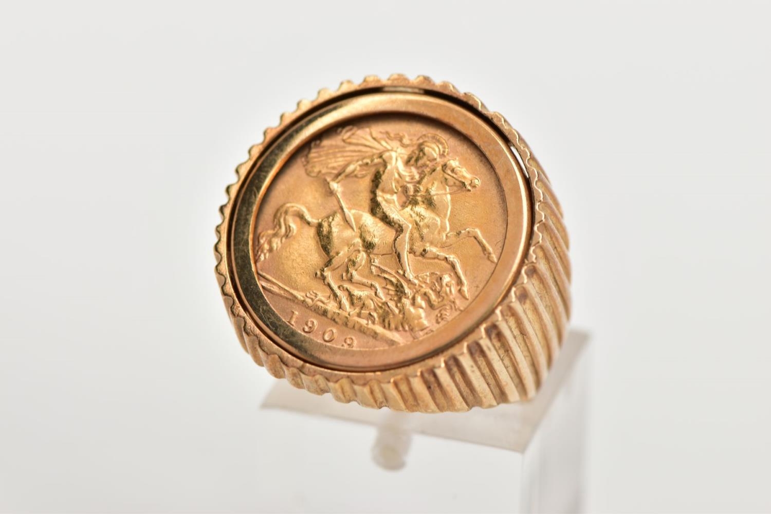 A MOUNTED EDWARDIAN HALF SOVEREIGN RING, sovereign depicting King Edward VII, obverse depicting George and the dragon dated 1909, within a 9ct gold collet mount, textured rim and shoulders, hallmarked 9ct gold London 1969, ring size K, approximate gross weight 10.9 grams (Condition report: overall condition good, general light wear)