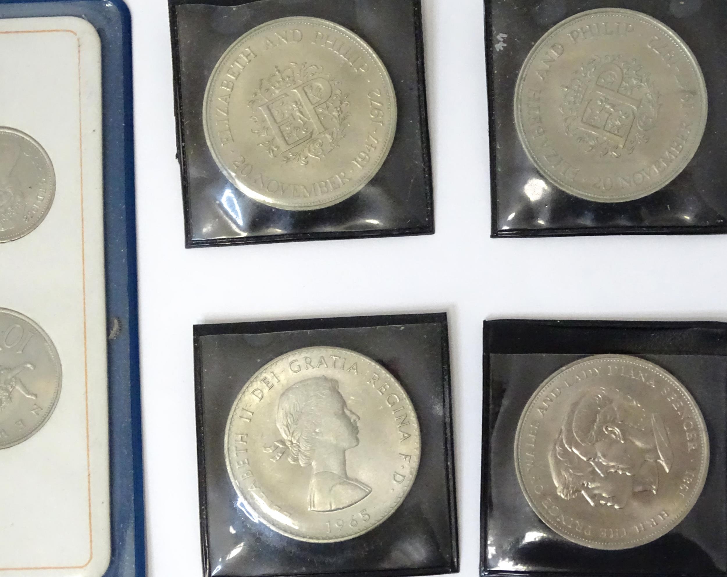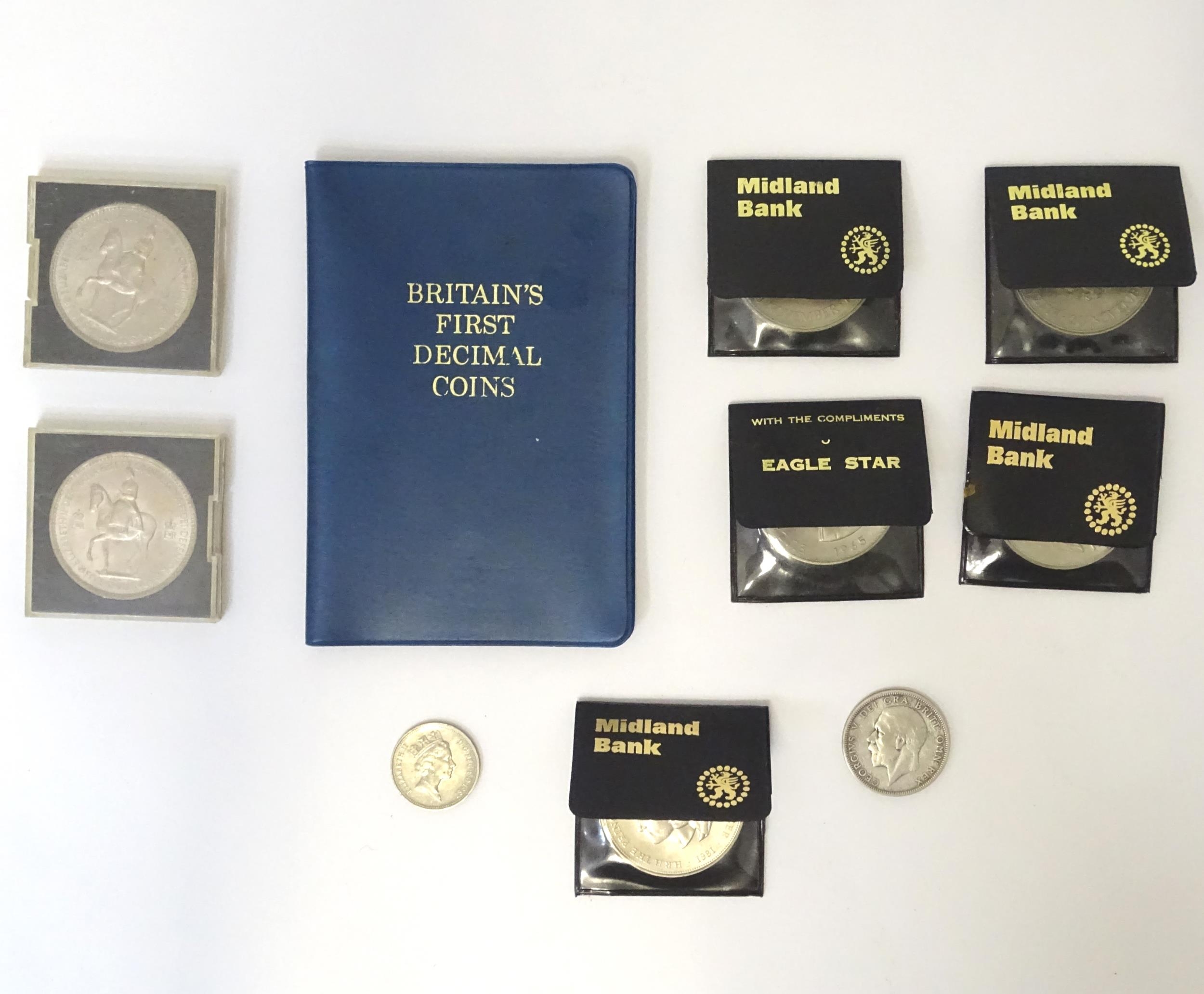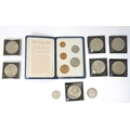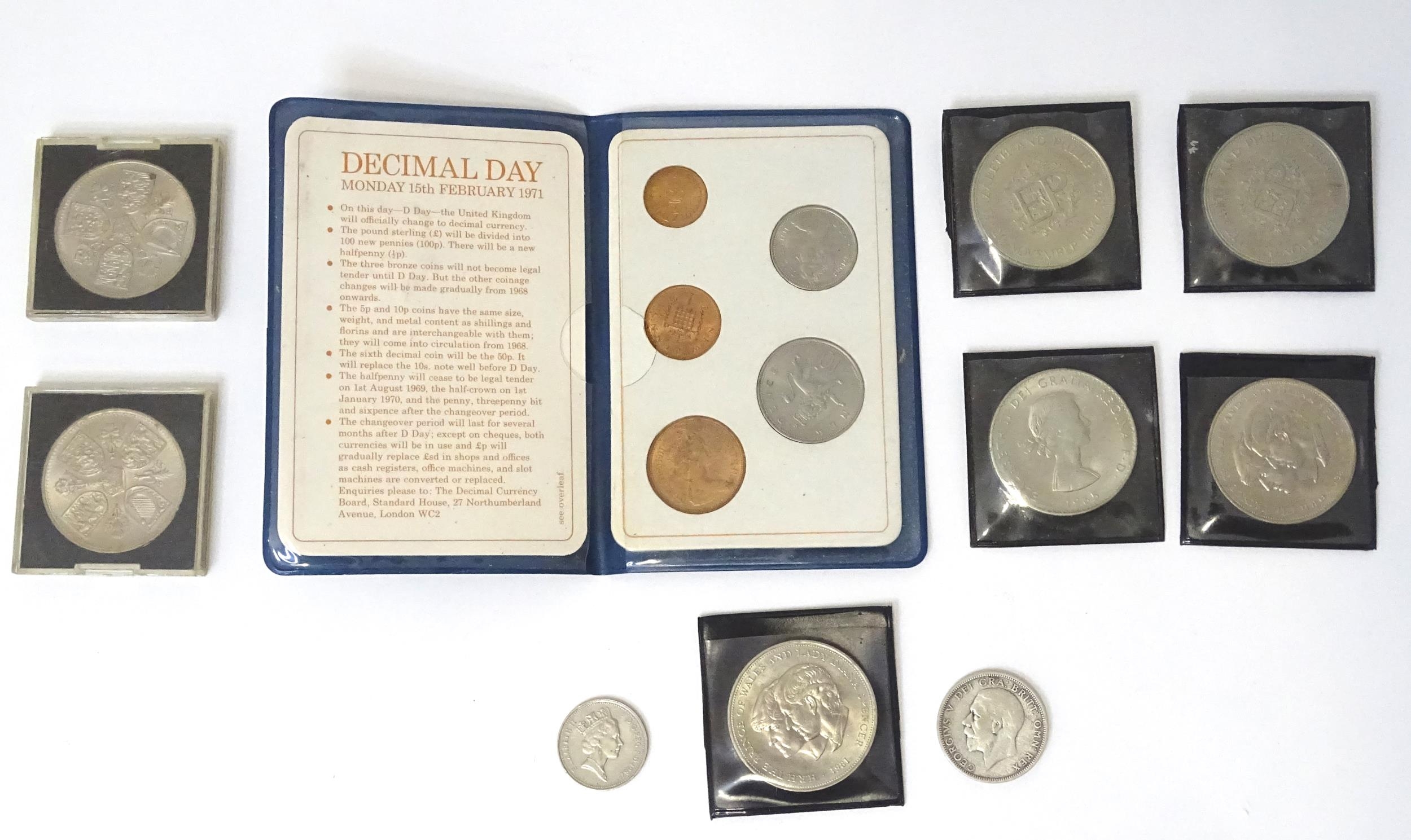 A quantity of 20thC coins, comprising a 1929 George V florin, seven Queen Elizabeth II crowns, a 1987 5p piece and a 1971 decimal set.