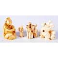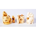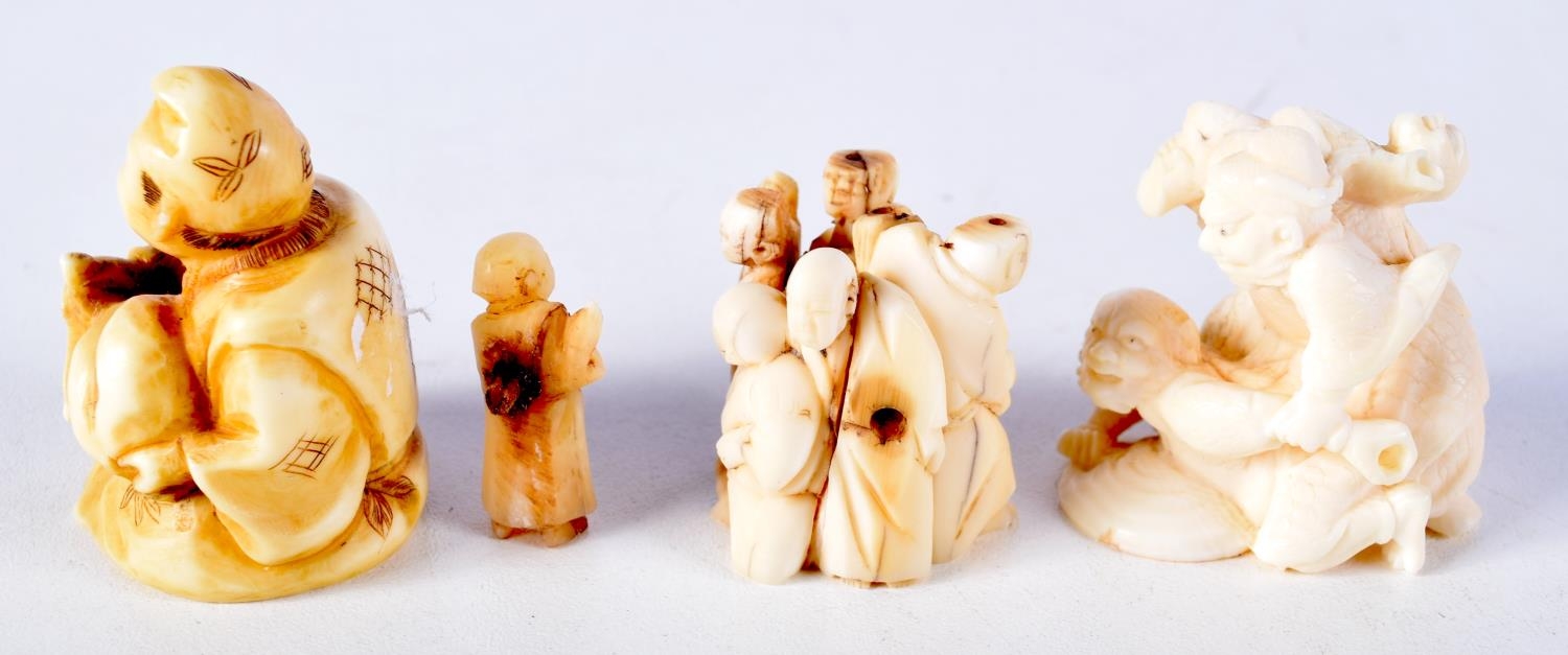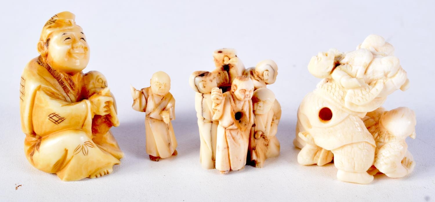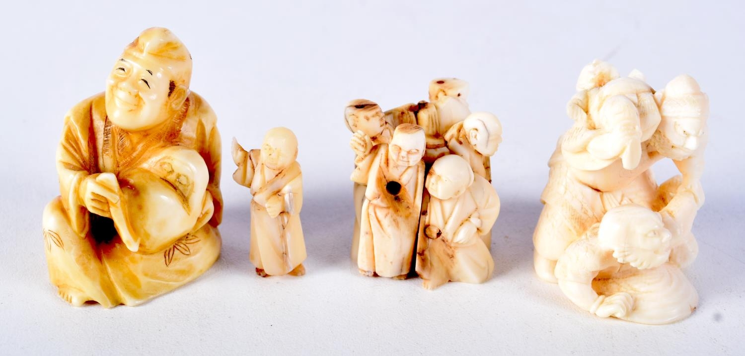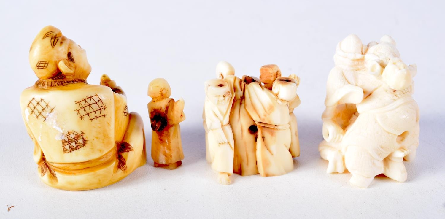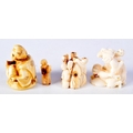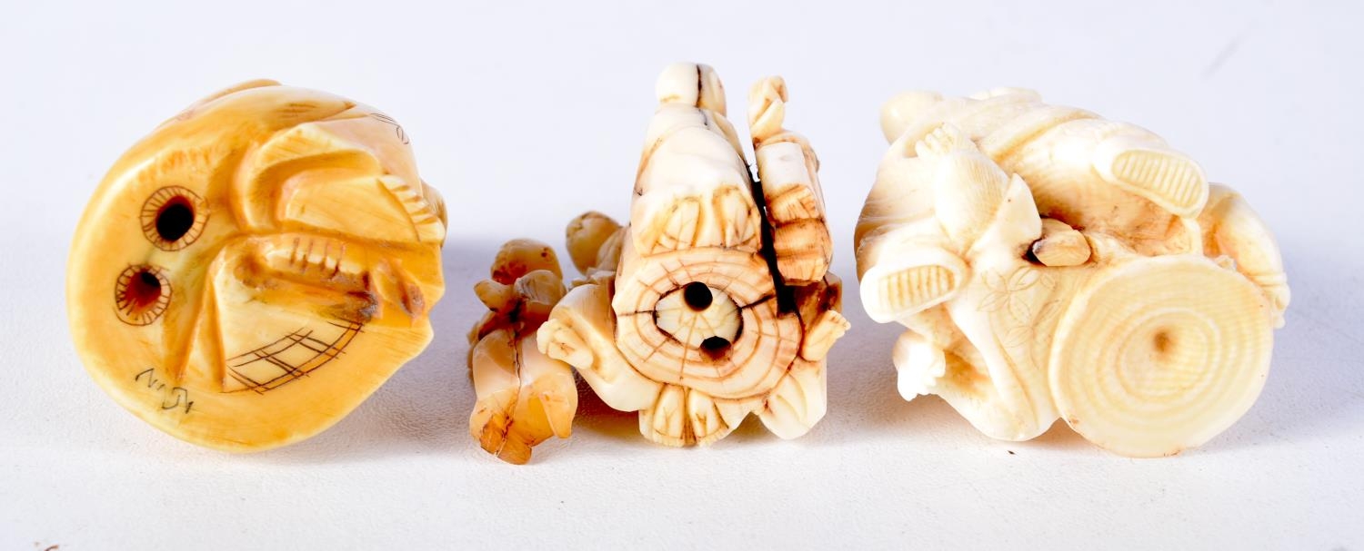 A 19TH CENTURY JAPANESE MEIJI PERIOD CARVED IVORY NETSUKE together with two similar okimono. Largest 4 cm x 3 cm. (3)