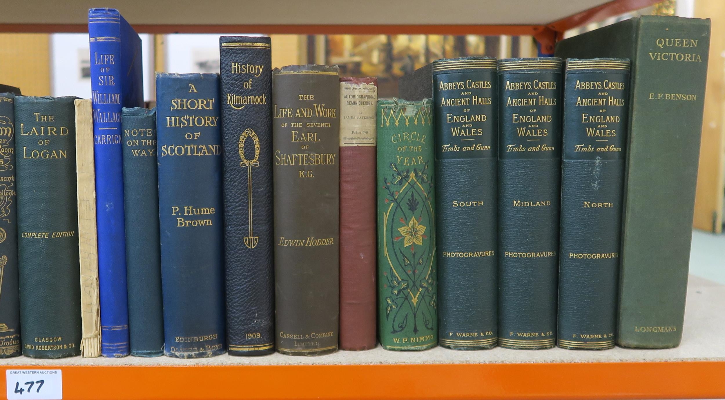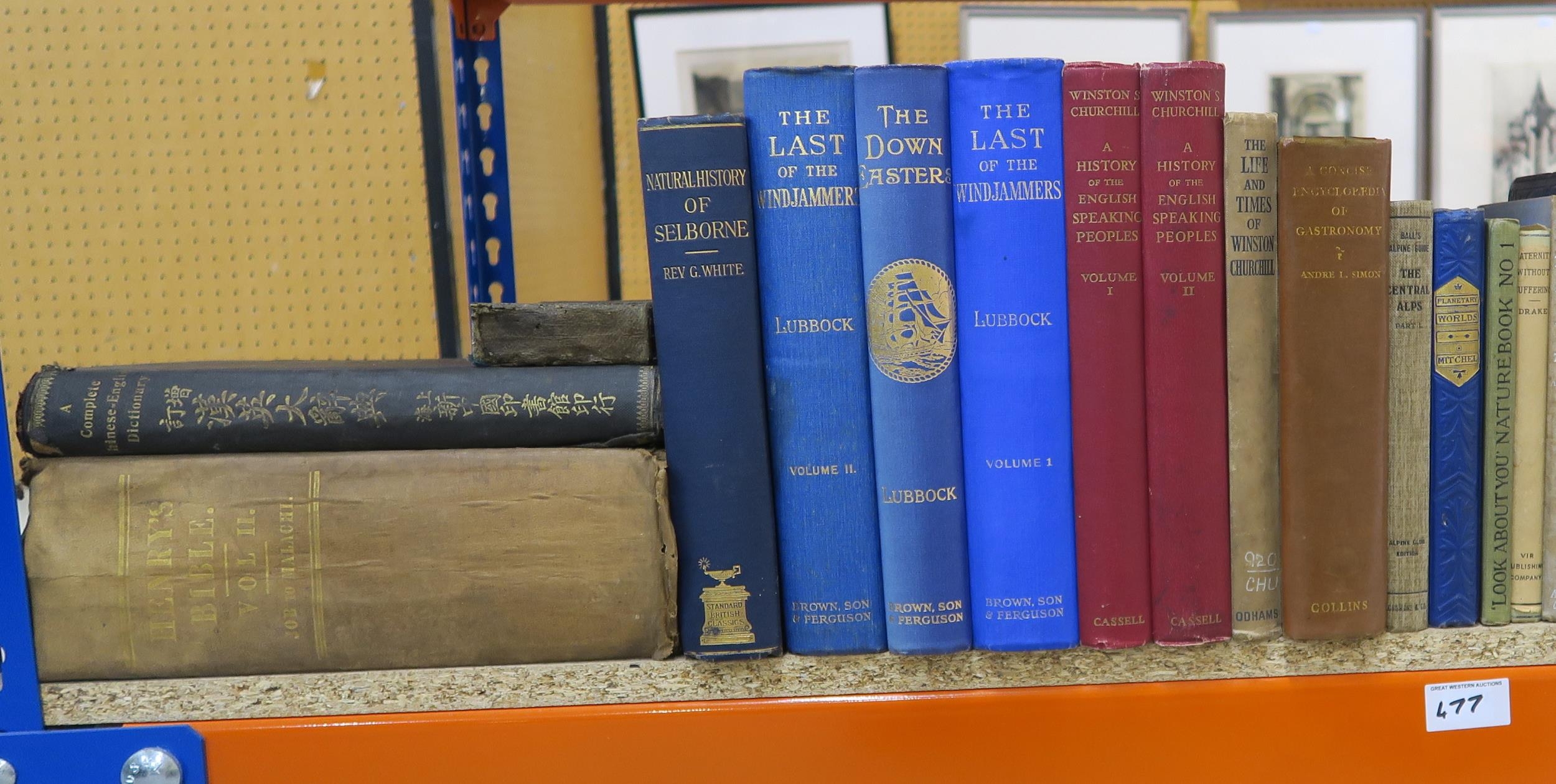 Three shelves of mixed volumes, largely classic literature, Scottish historical, maritime and academic interest, with titles to include Last of the Windjammers in two volumes and The Down Easters by Lubbock, The History of Kilmarnock by Archibald MacKay (5th ed., inscribed by the author), Autobiographical Reminiscences by James Paterson (Maurice Ogle pub., Glasgow, 1871) etc.