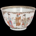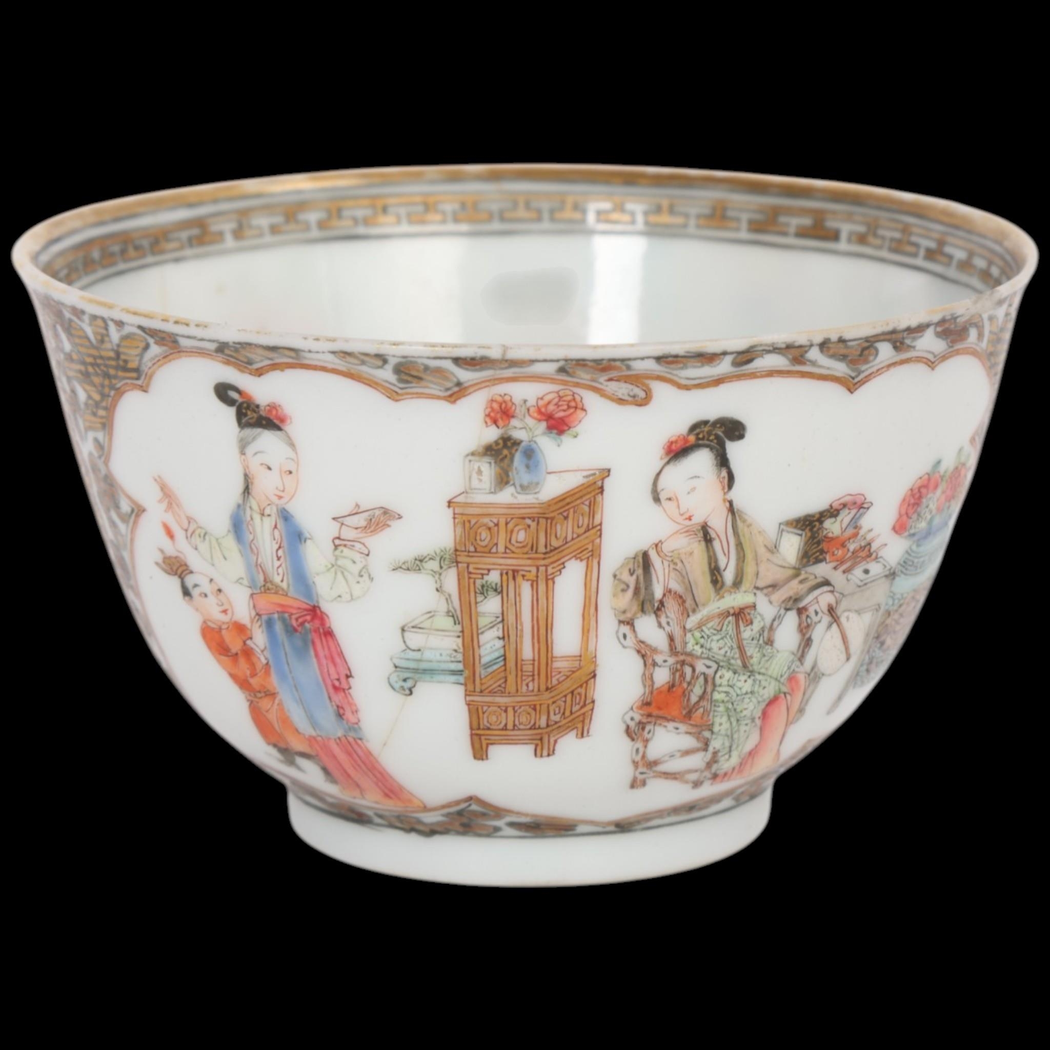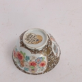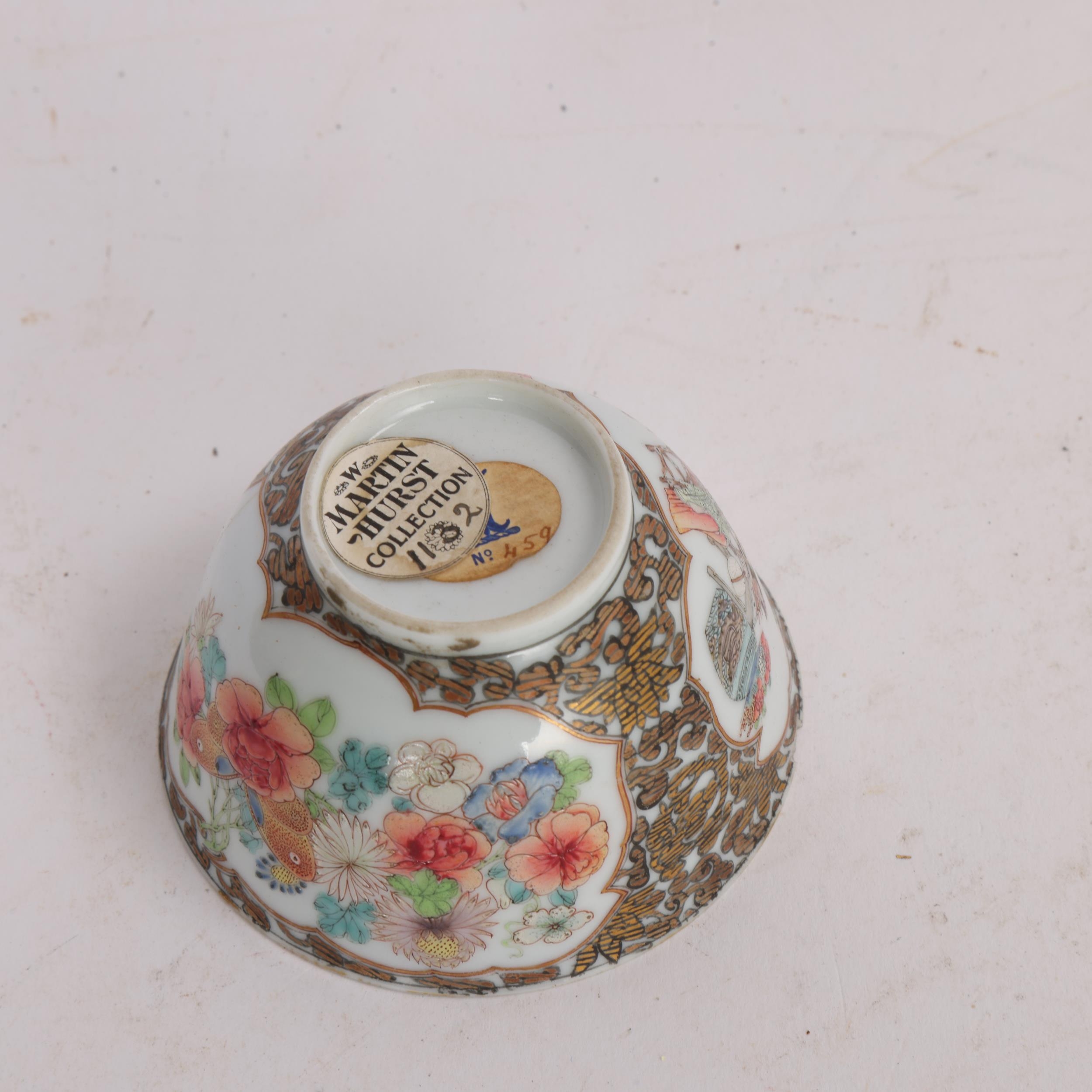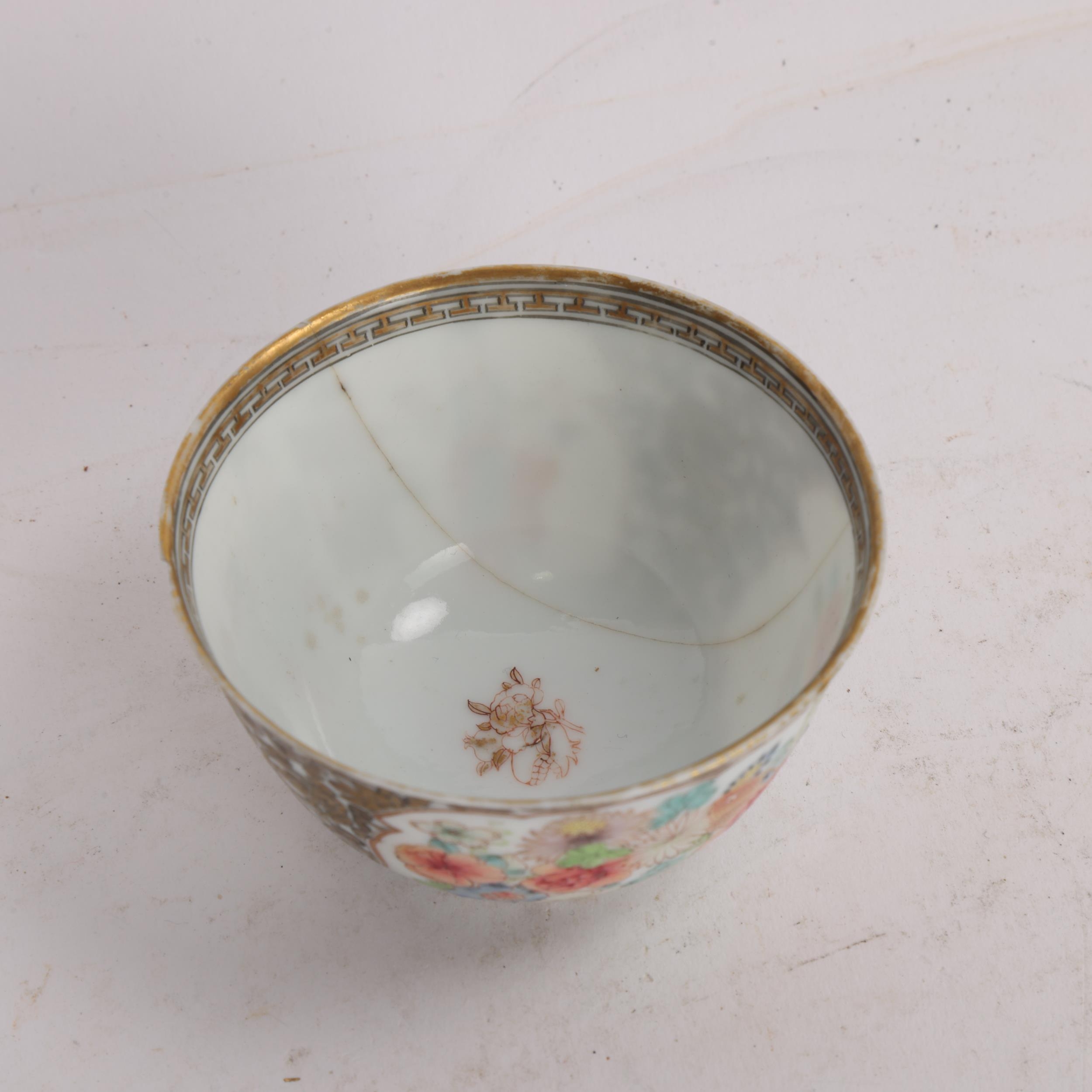 An 18th century Chinese tea bowl, with enamelled panels of flowers and figures and gilded detail, label to base "Martin Hurst Collection 1132" over another older label, A/F, diameter 7cm