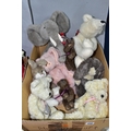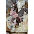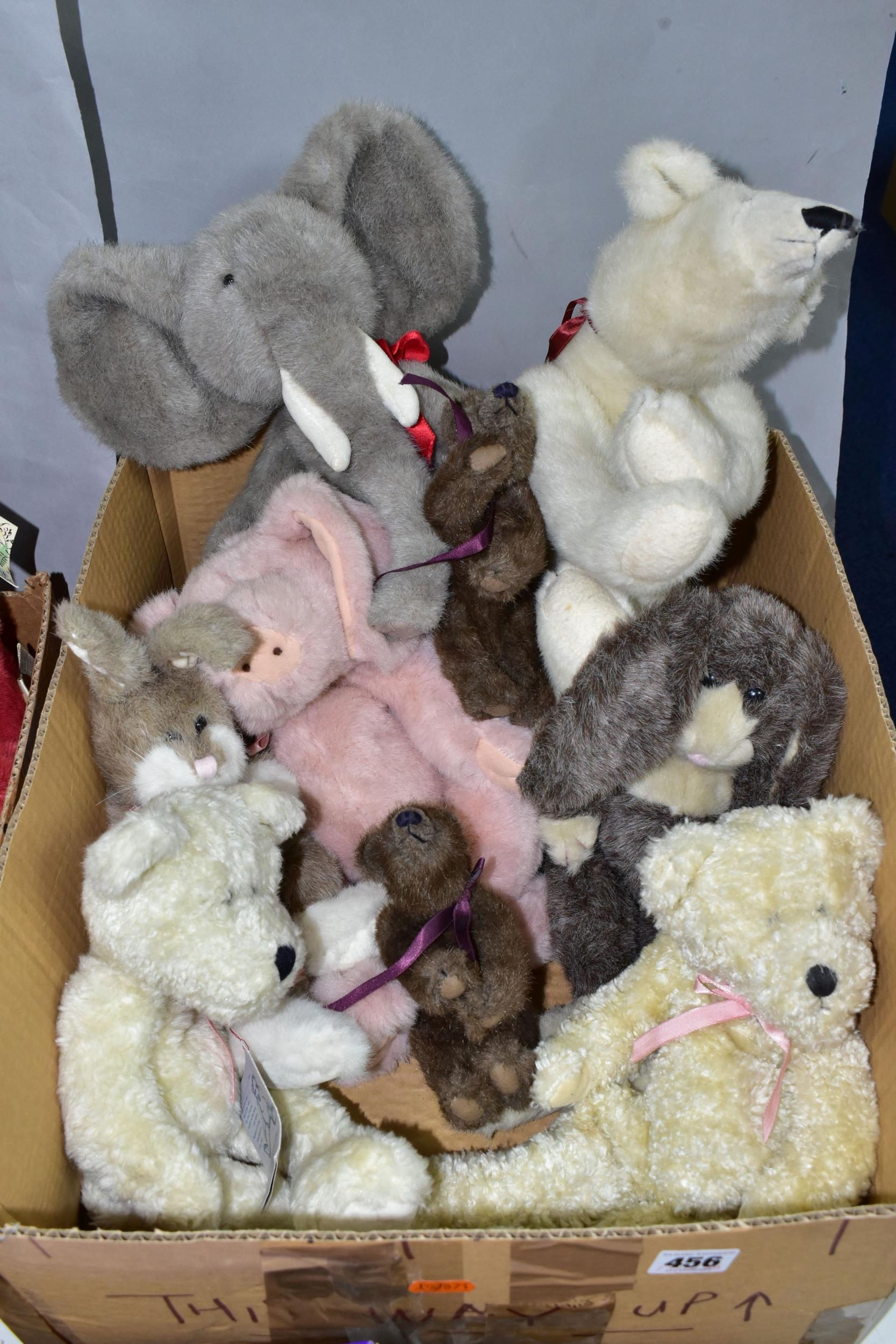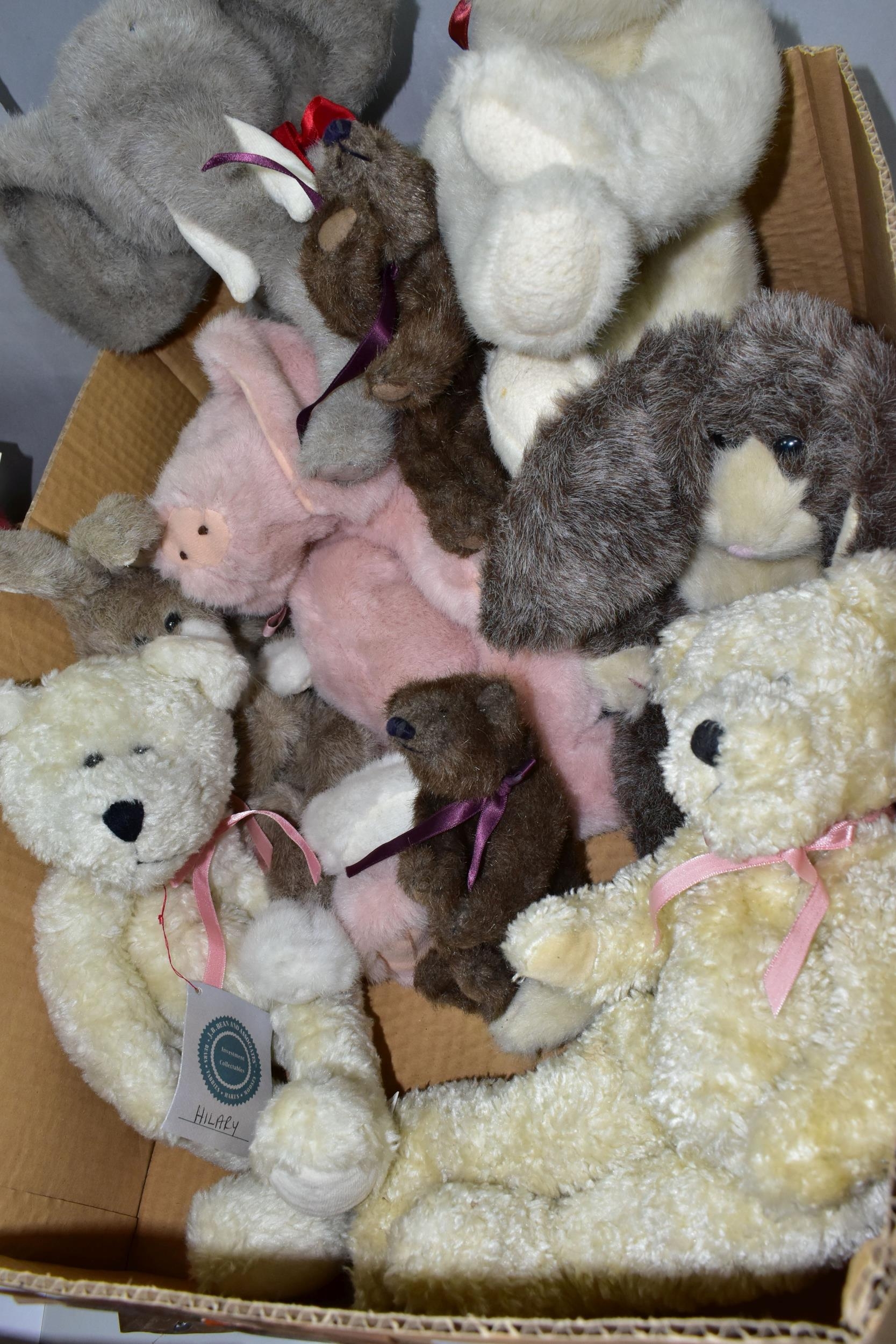 A BOX OF BOYDS BEARS' TEDDIES AND SOFT TOYS, comprising JB Bean and Associates 'Hilary' bear, two small standing brown bears, a pale cream jointed teddy, a polar bear (a little wear to nose), two rabbits, a pig and an elephant (1 box)