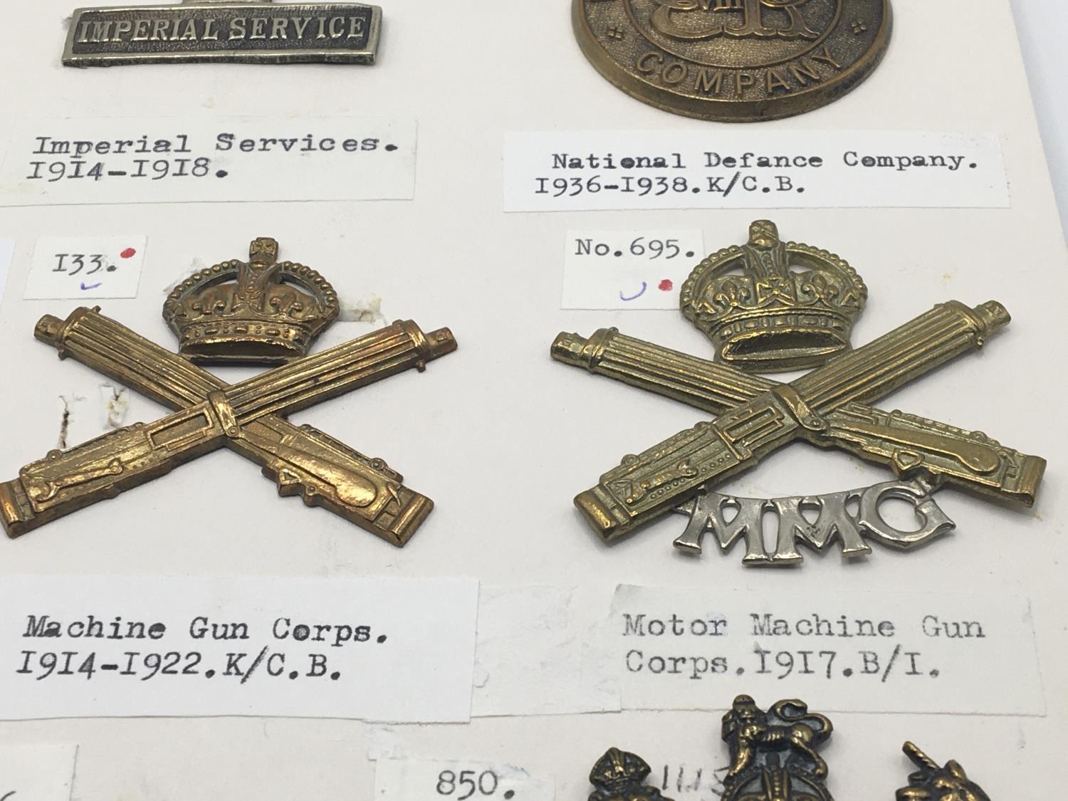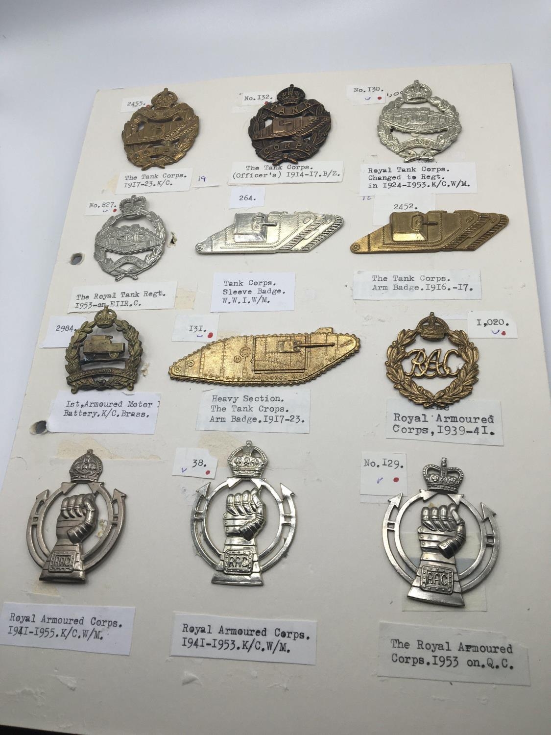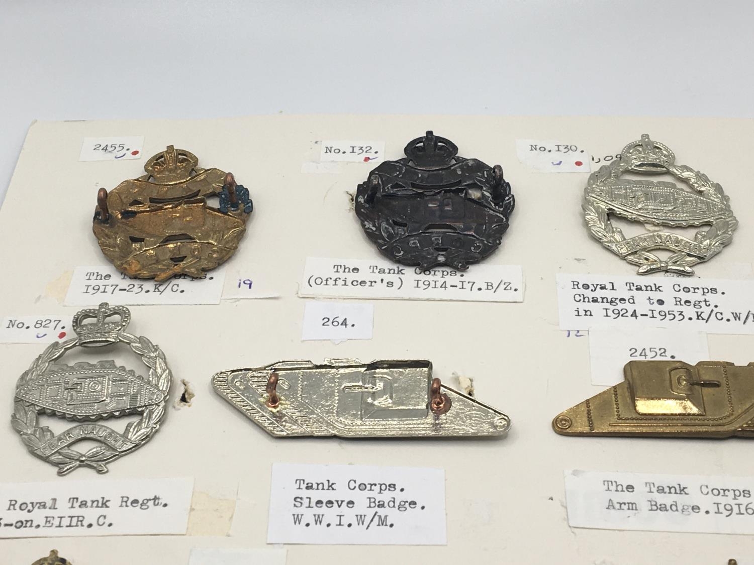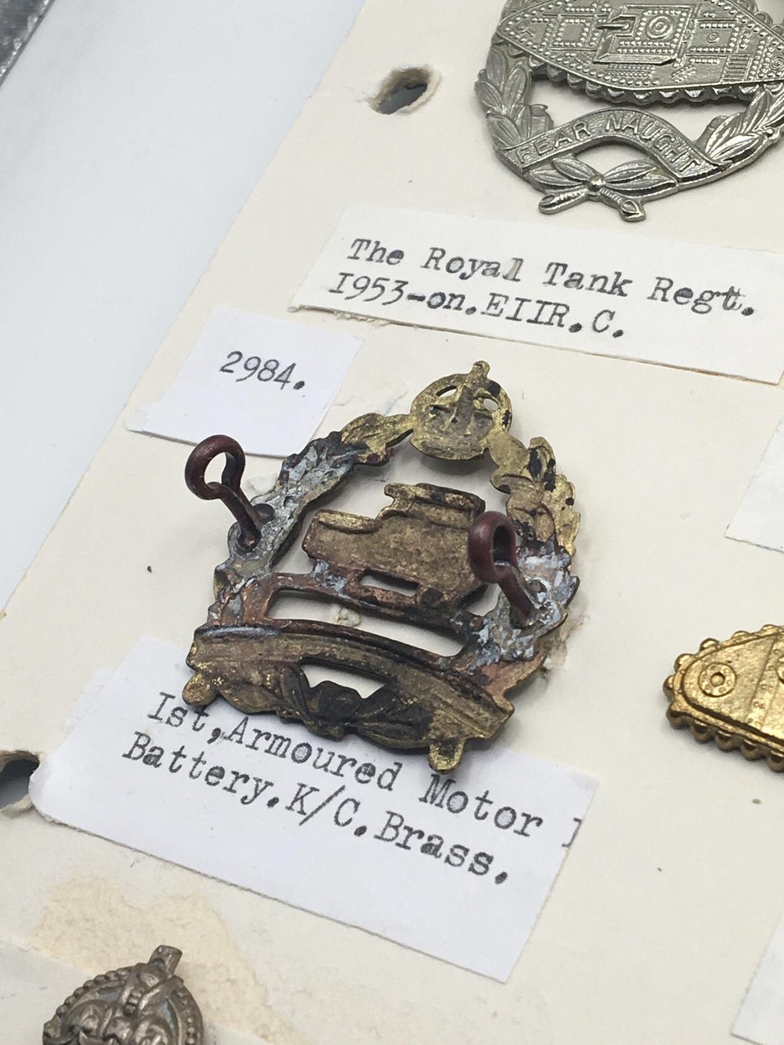 A collection of Military cap badges including a rare Ist Armoured Motor Battery badge First World War tank badges and a card of Machine gun Corps badges (2)