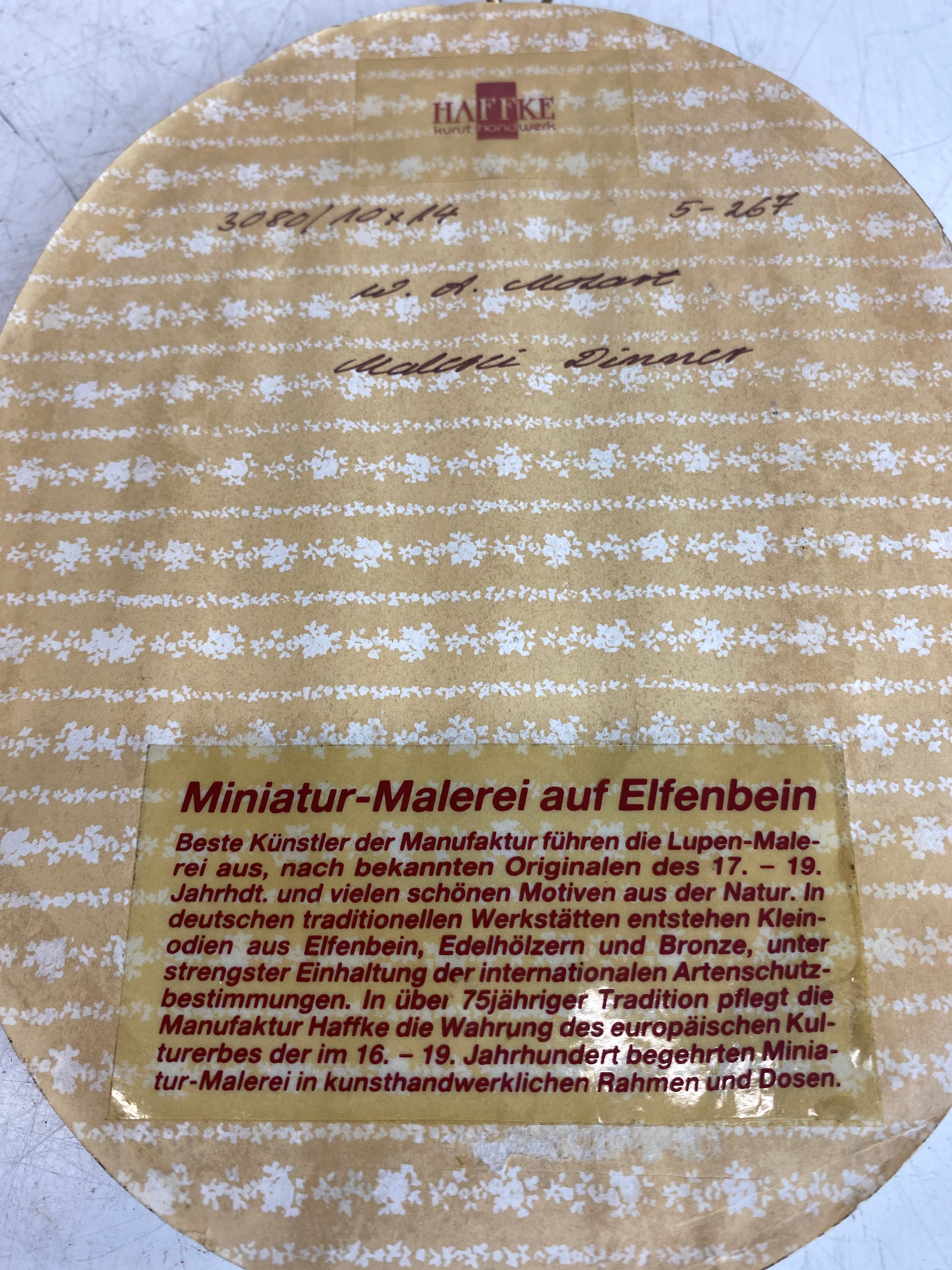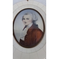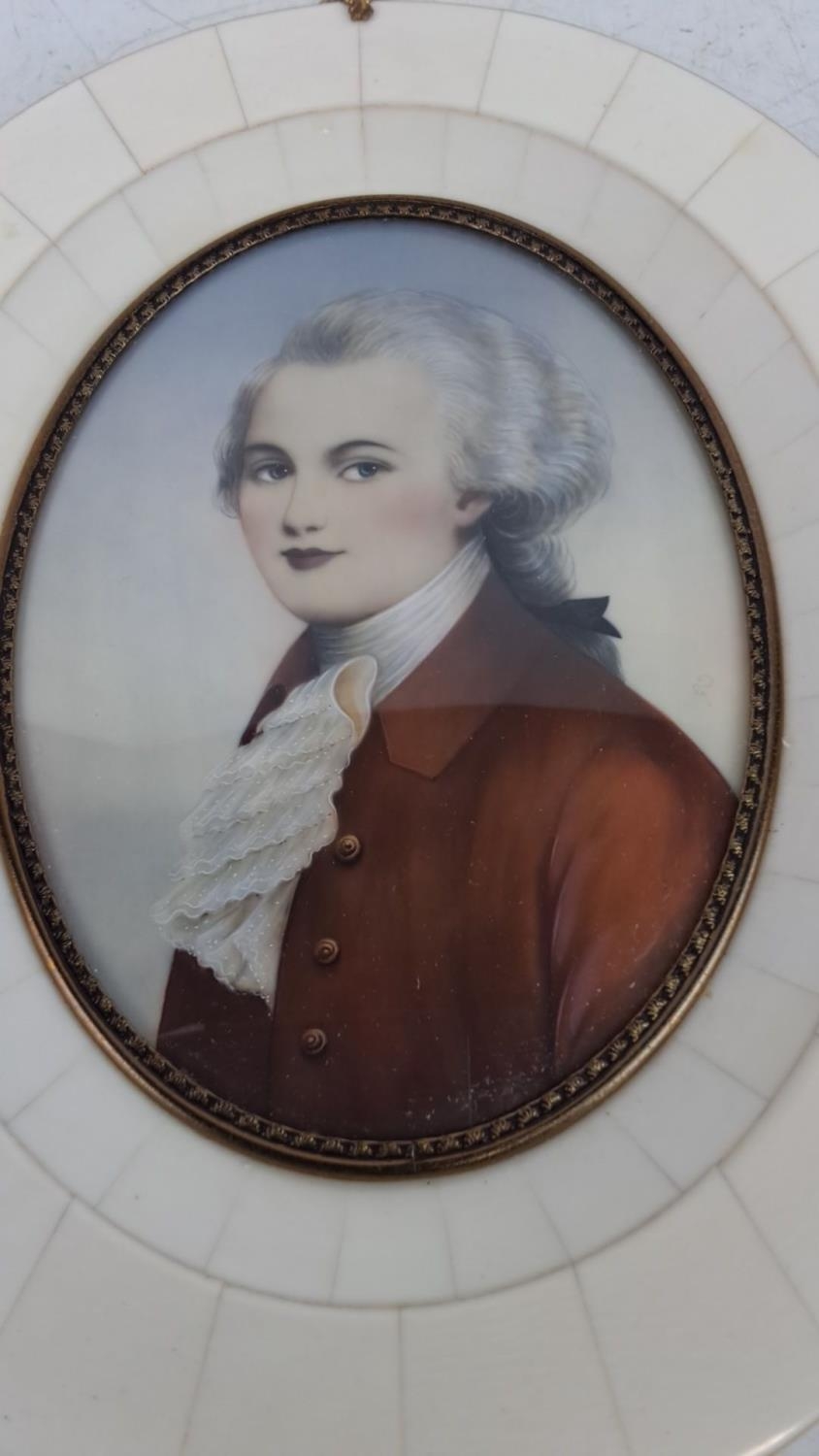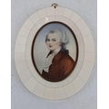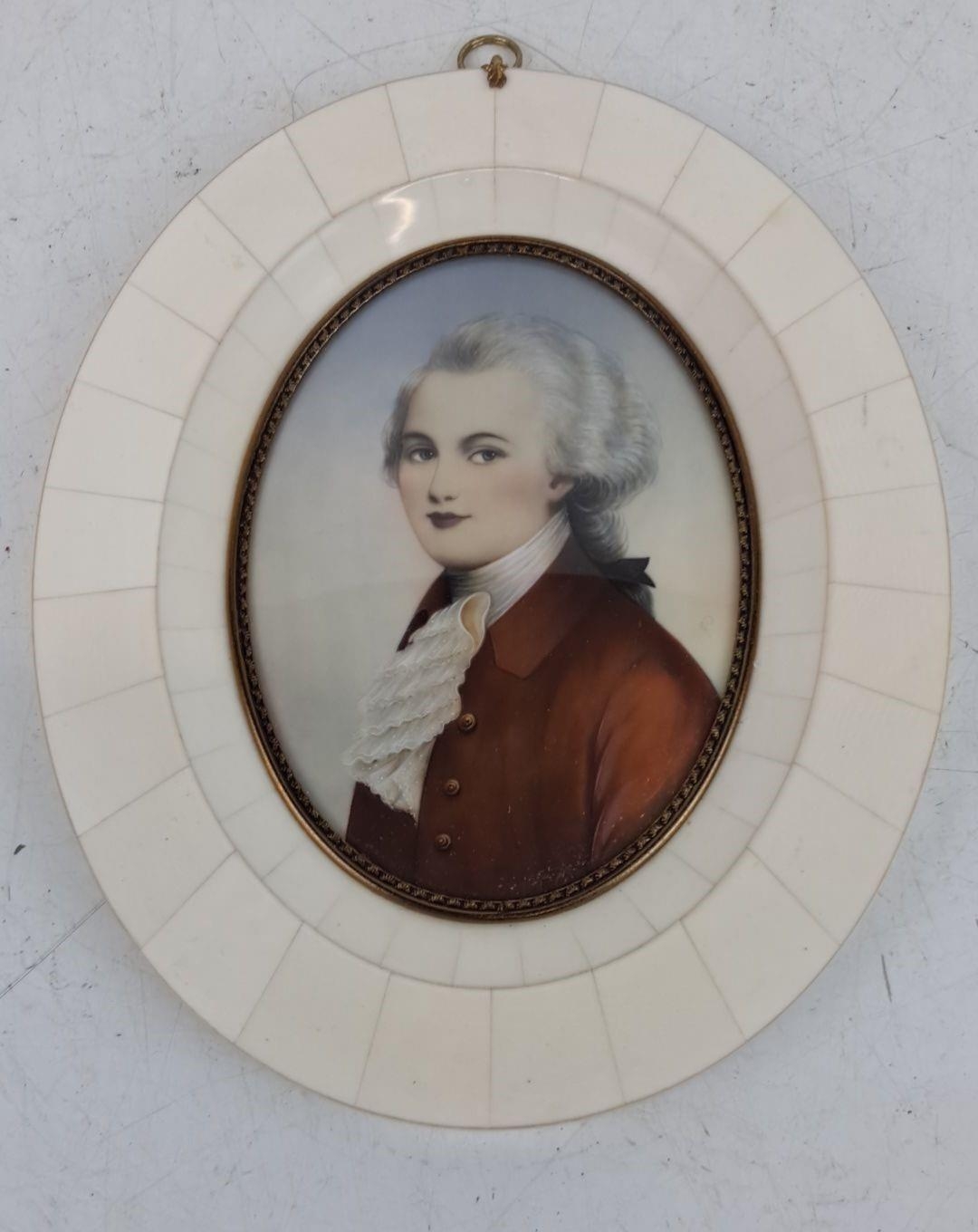 Large Antique German Oval portrait miniature, Encased in a bone frame with brass trim, early 19th century, measuring 17.5cm x 21.5cm.