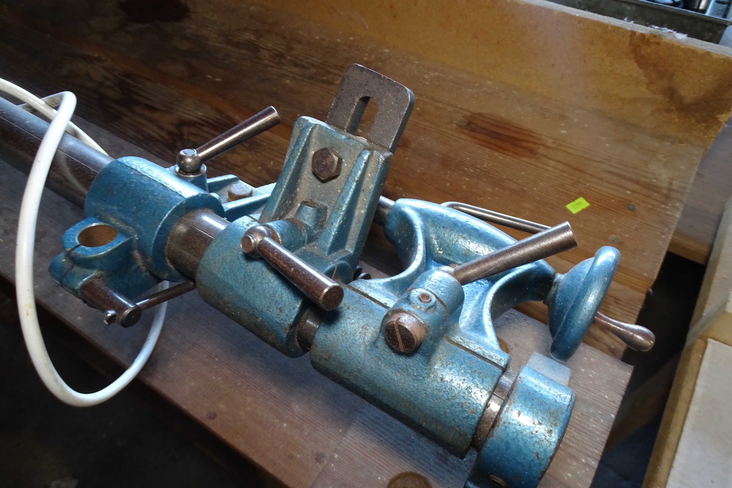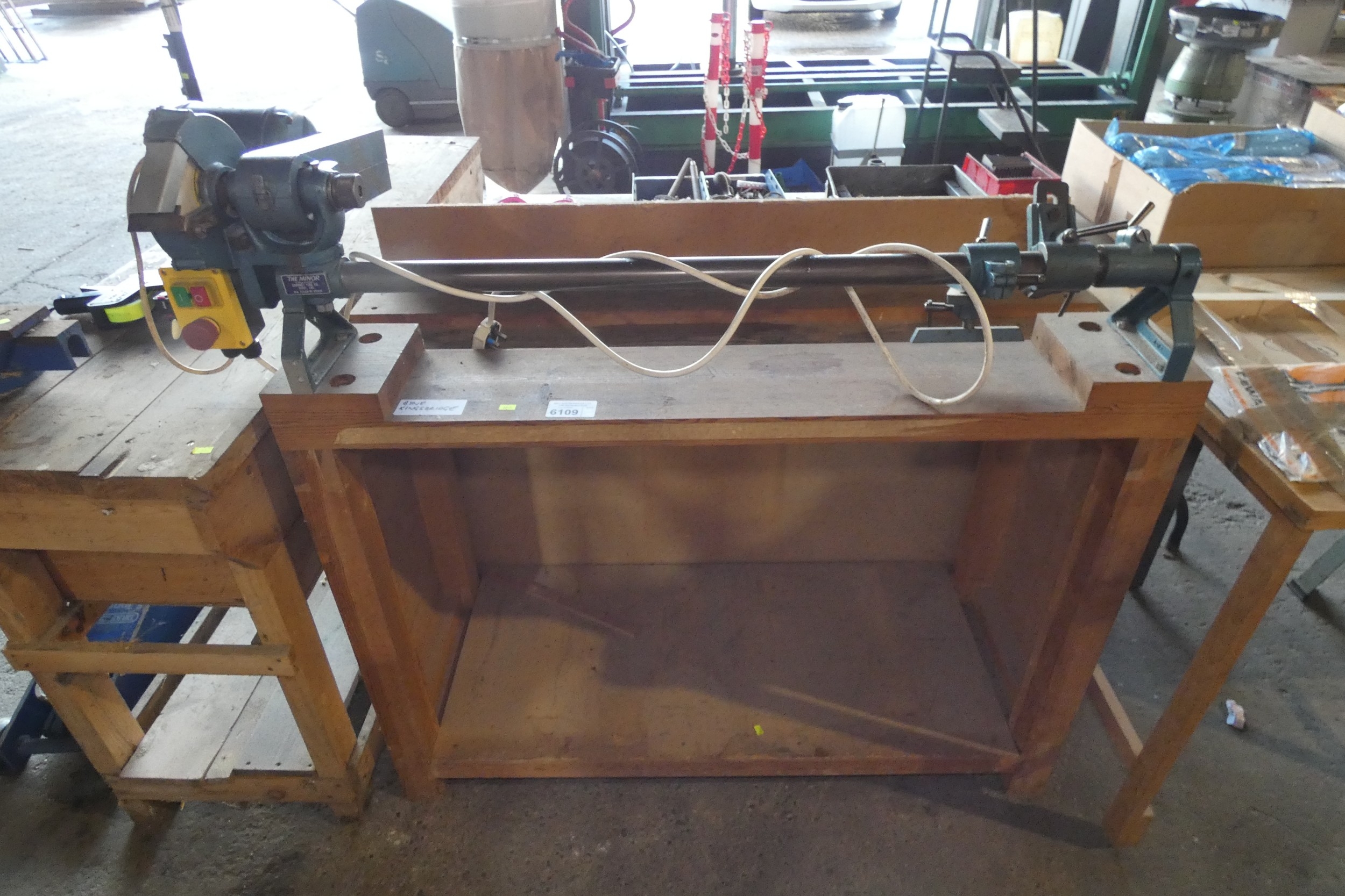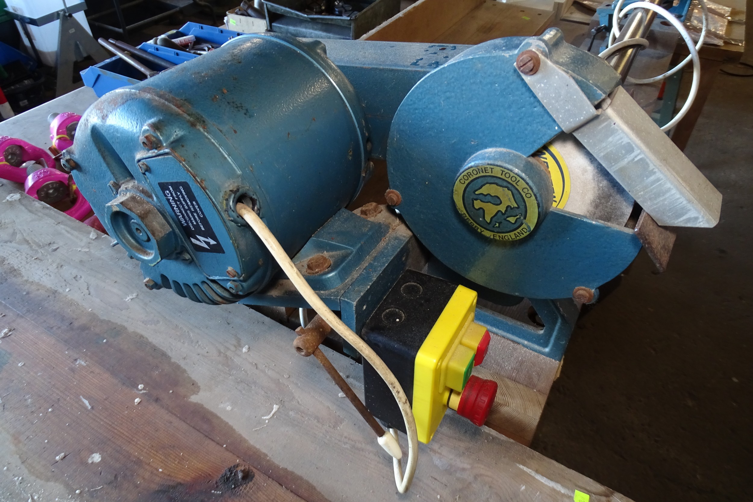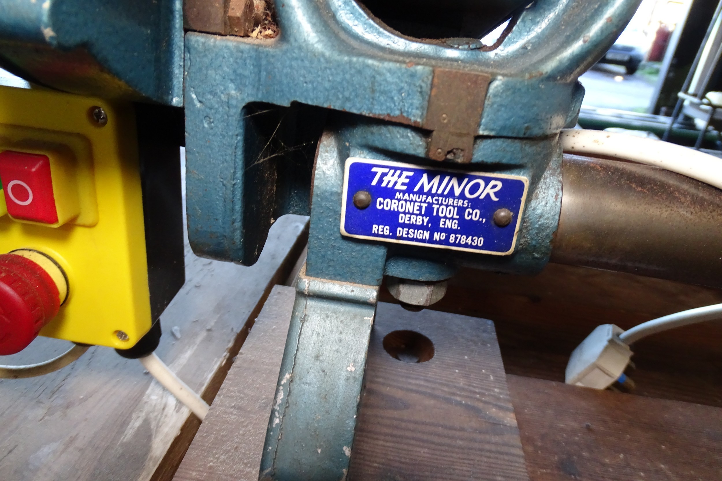 1 x Coronet Minor wood turning lathe 240v mounted on a wooden bench. This lathe is also fitted with a grinding wheel