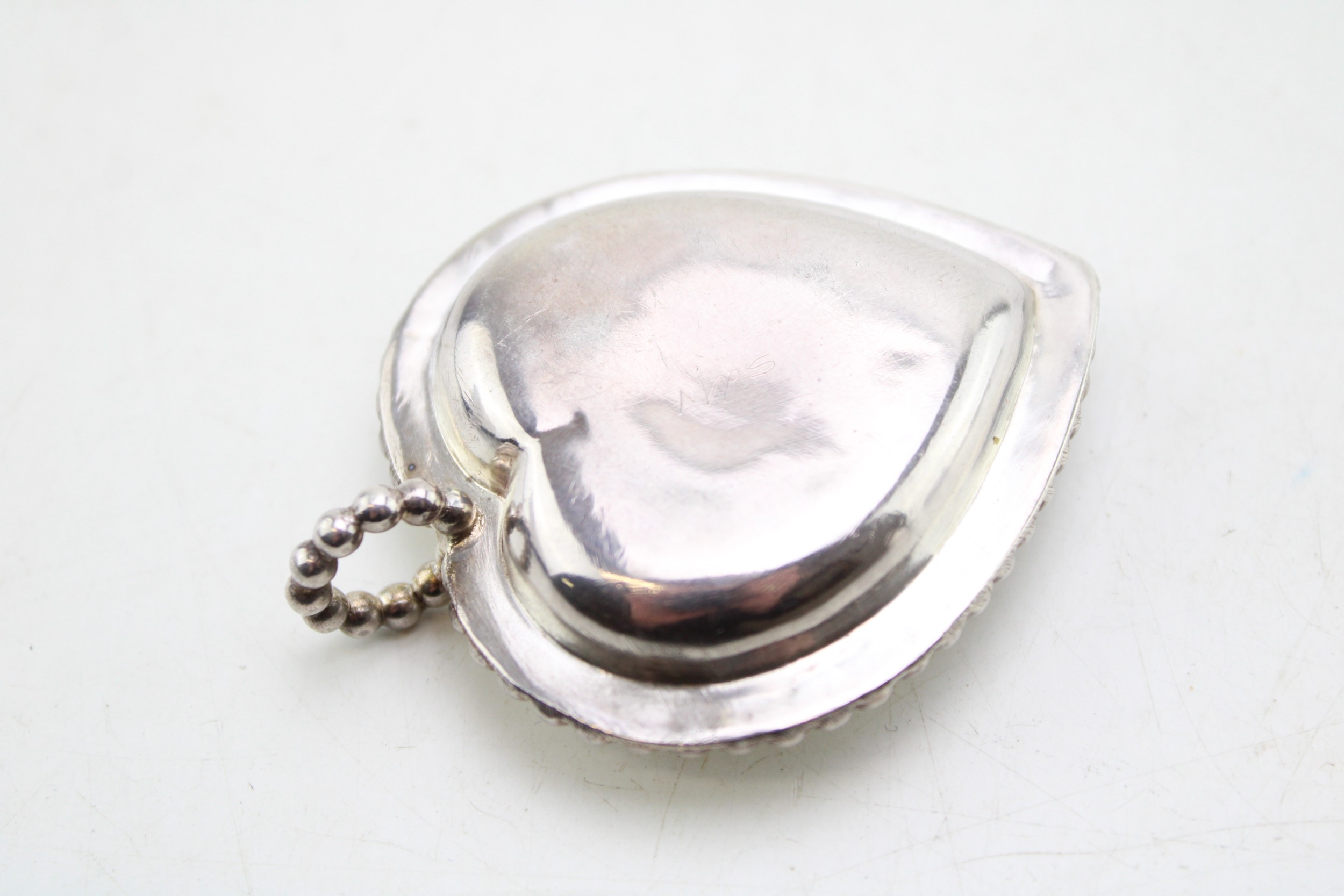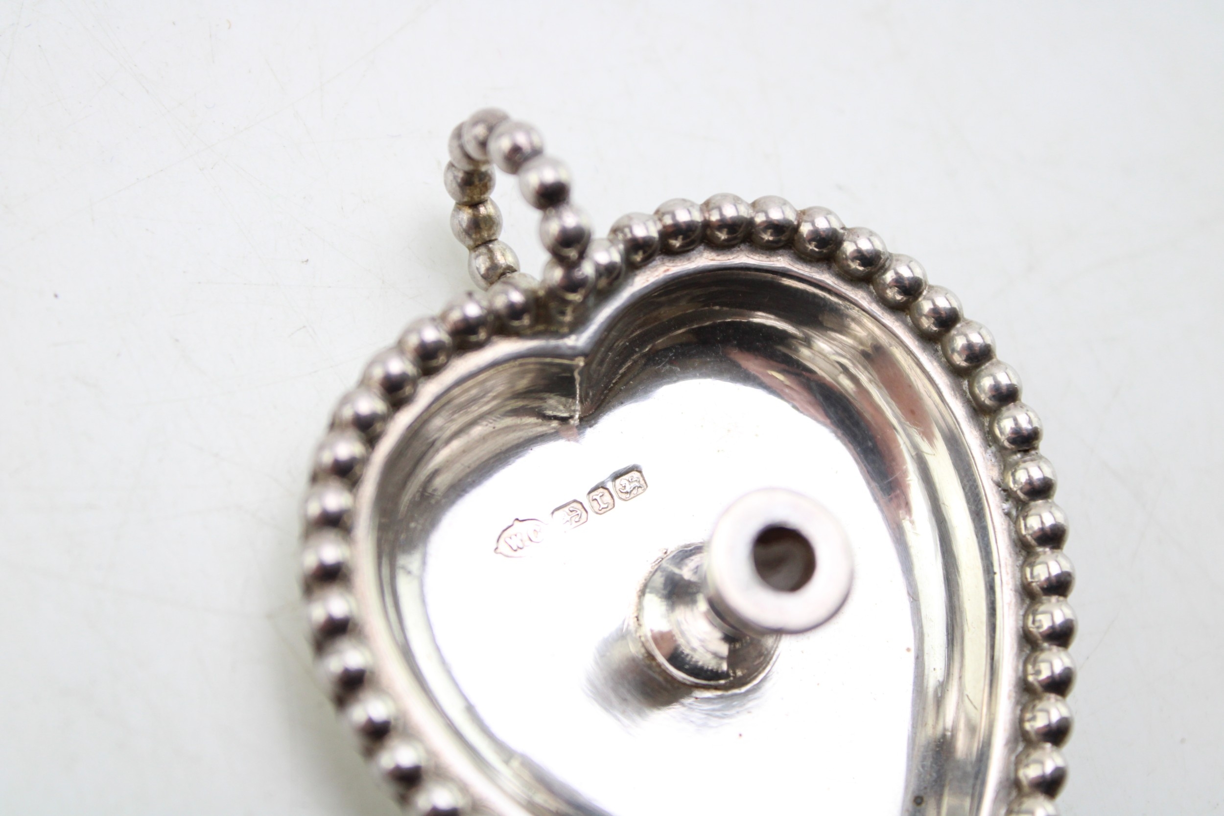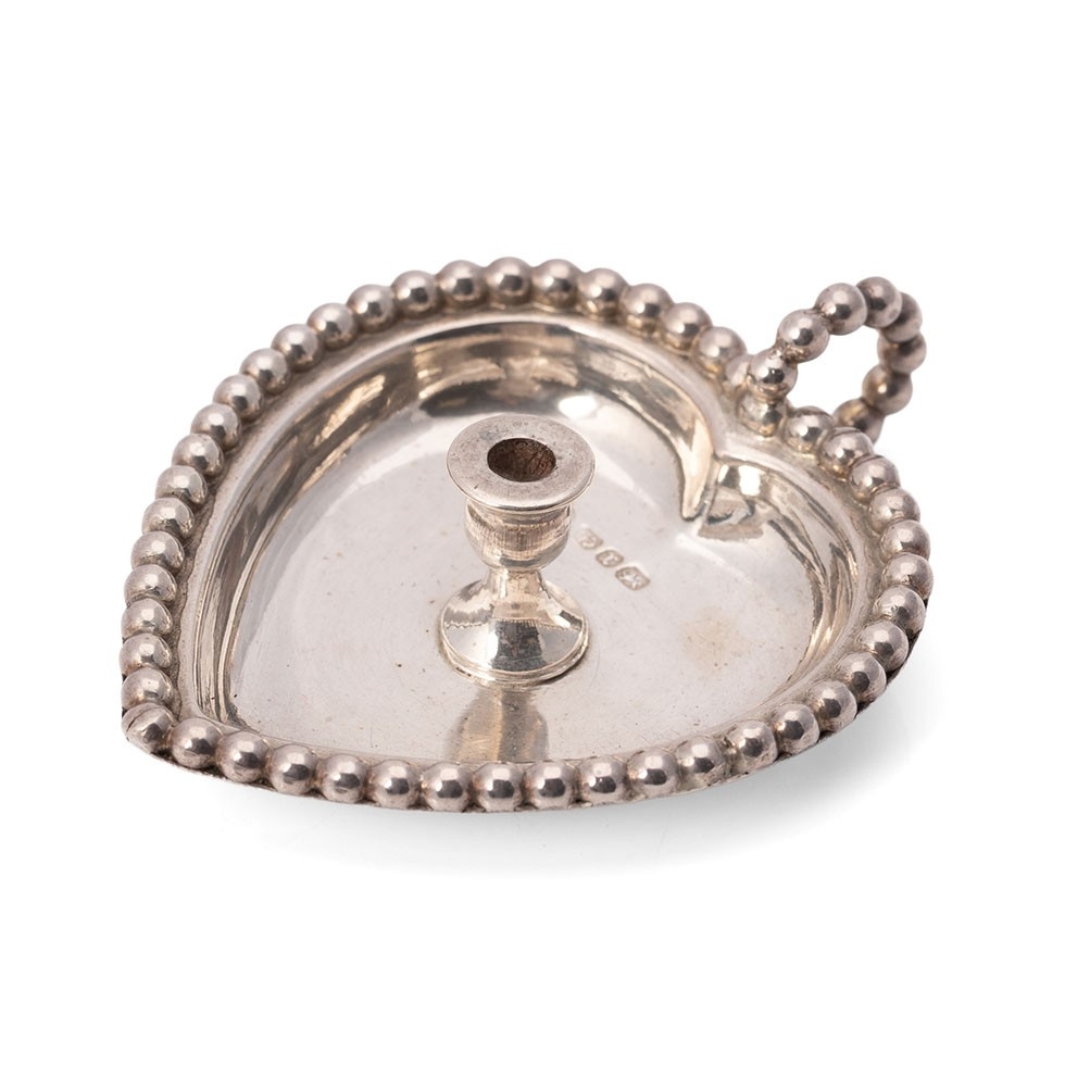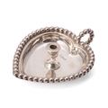 A silver miniature 'Go To Bed' heart shaped chamber stick, large enough for a taper, with beaded handle and rim, William Comyns and Sons Ltd, Birmingham 1891, 63 by 49mm, 0.81toz, 25.3g.