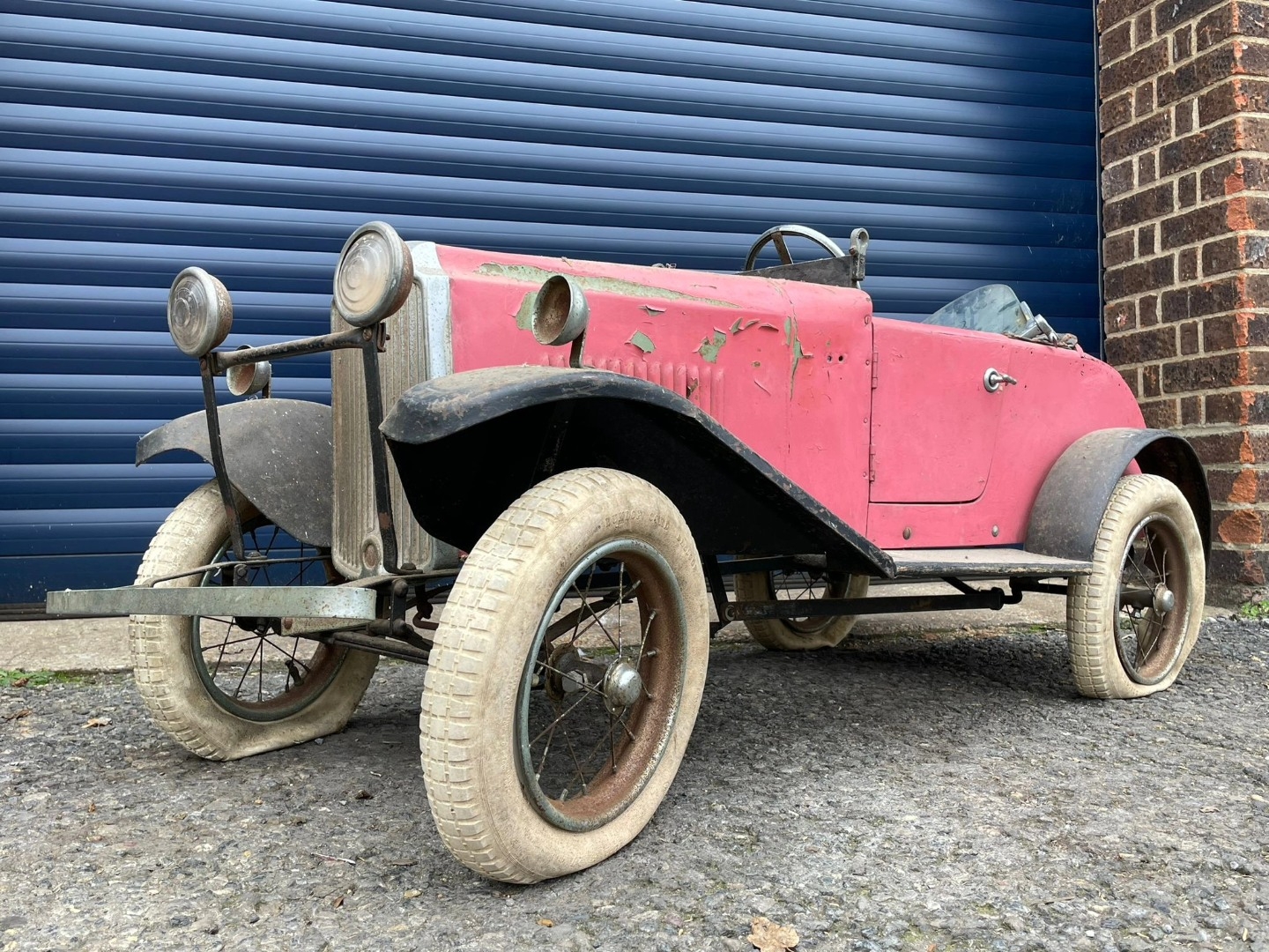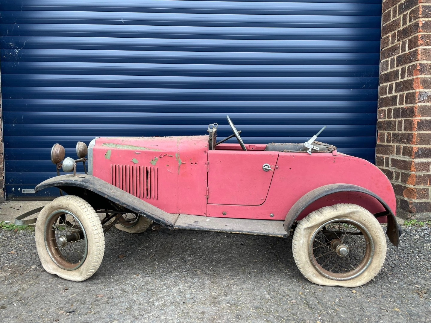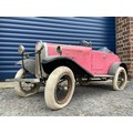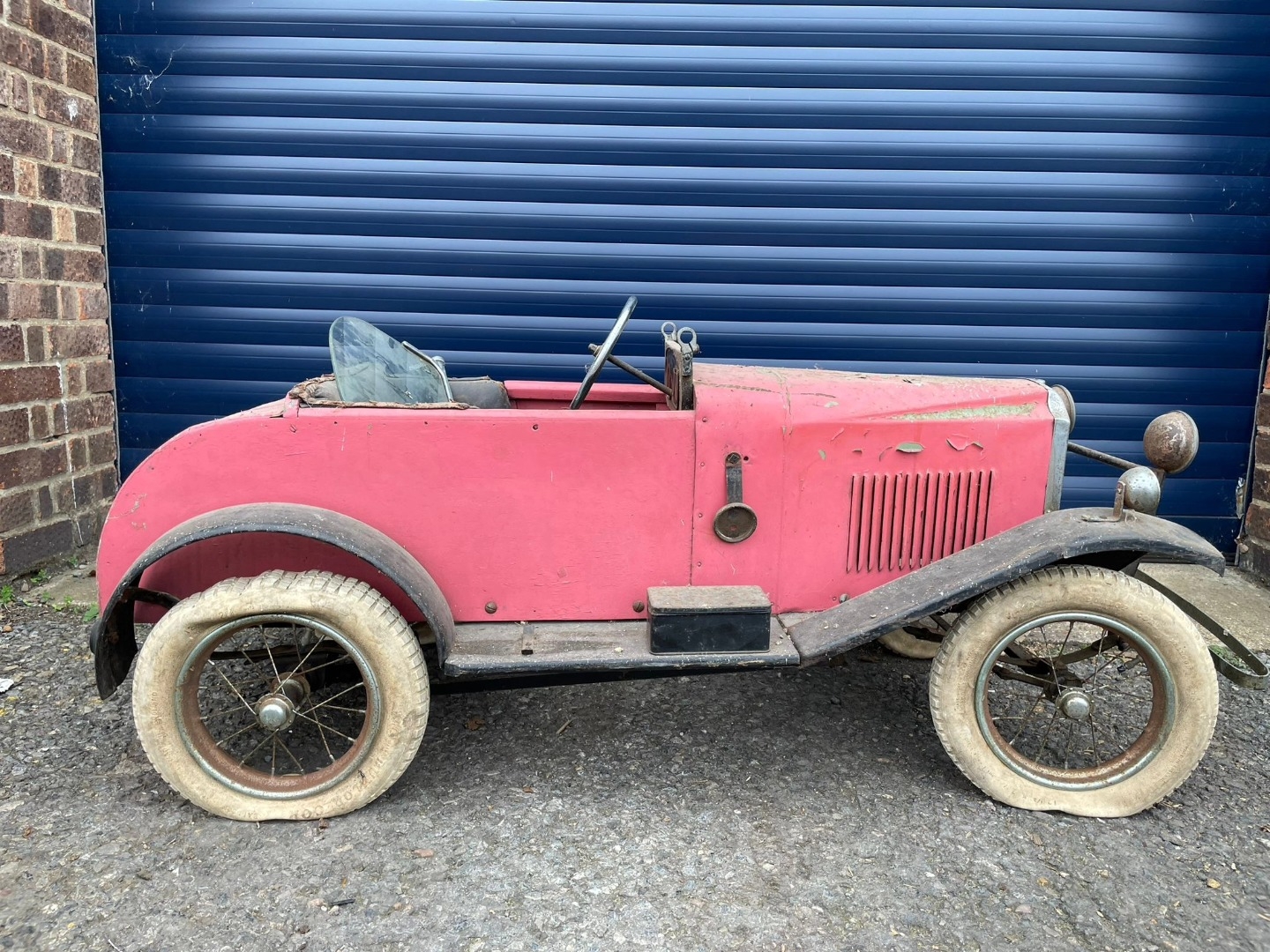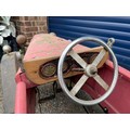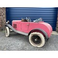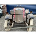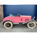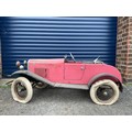 Lines Bros Vauxhall Pedal Car. Ex long term storage, and mostly complete. A spare windscreen is included in the lot but is unfitted. Pink colour is later overpainting of original pale grey. An excellent restoration project