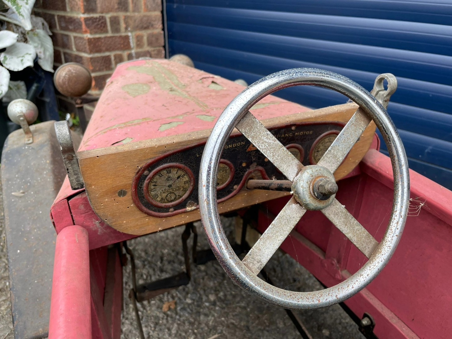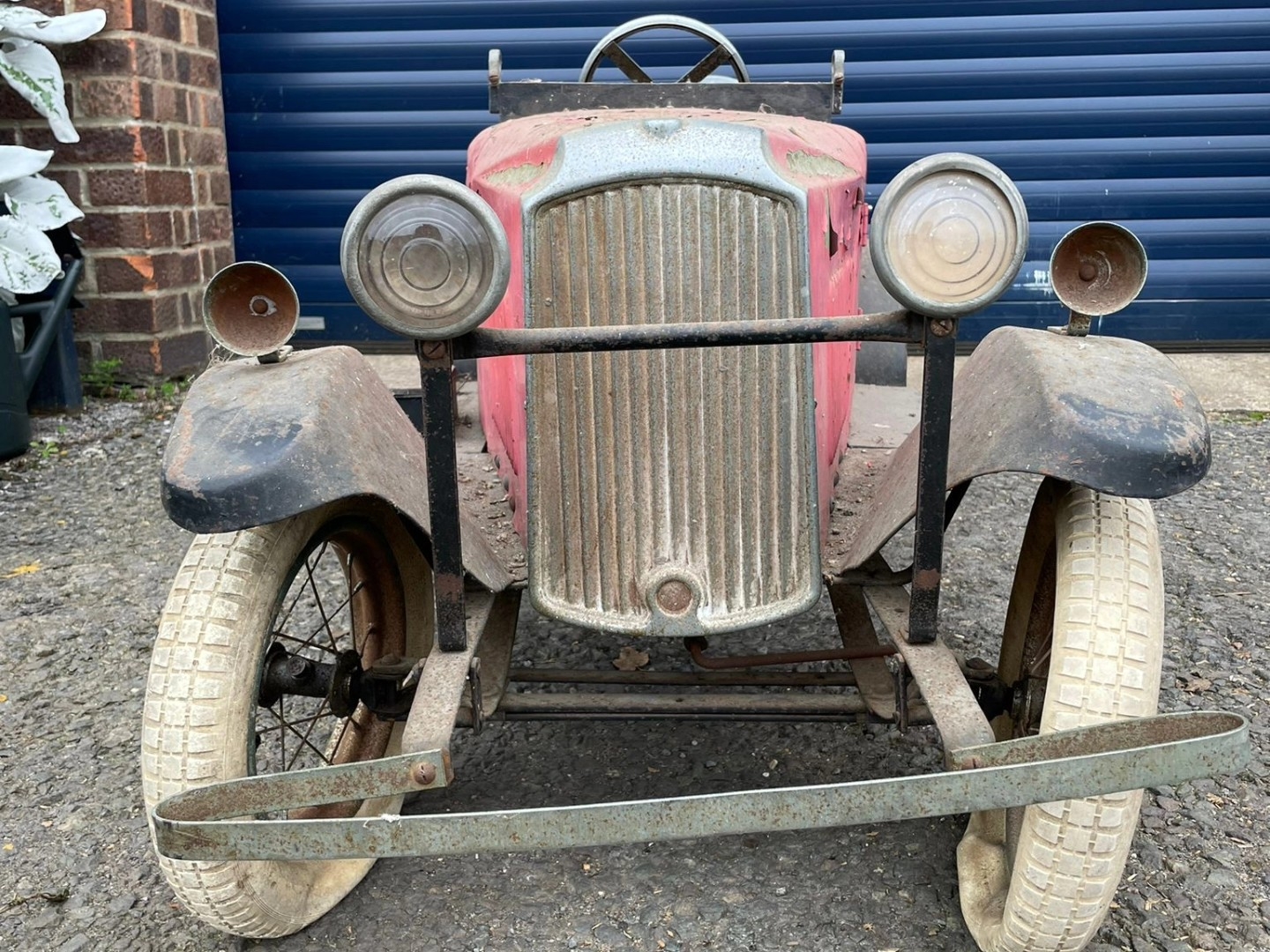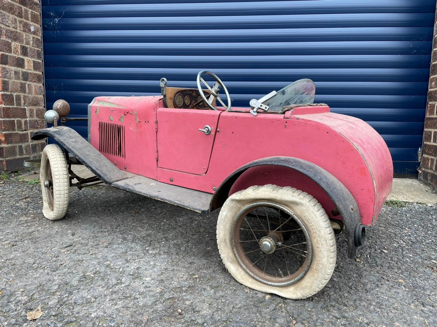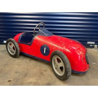 Lines Bros Vauxhall Pedal Car. Ex long term storage, and mostly complete. A spare windscreen is included in the lot but is unfitted. Pink colour is later overpainting of original pale grey. An excellent restoration project