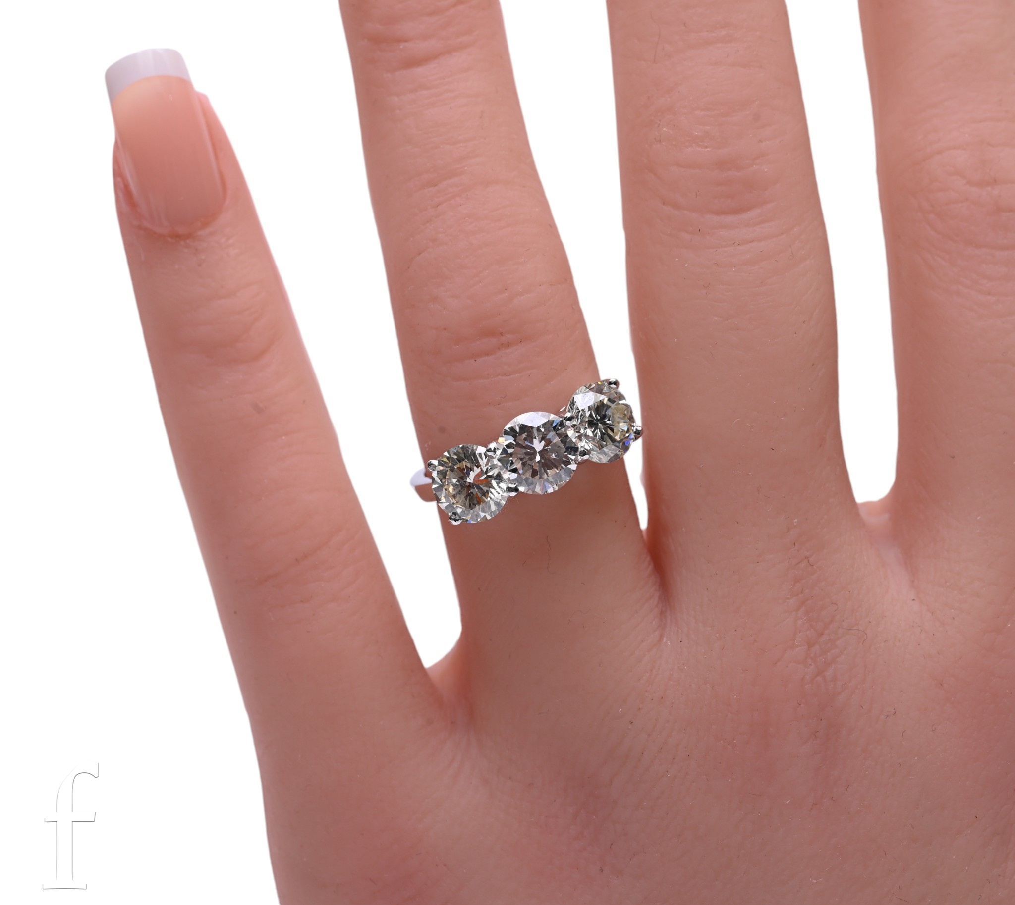 A three stone diamond ring, the three brilliant-cut diamonds four claw set within platinum mount, total weight of diamonds 3.74 carats, hallmarked, total weight 7g, ring size L.