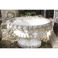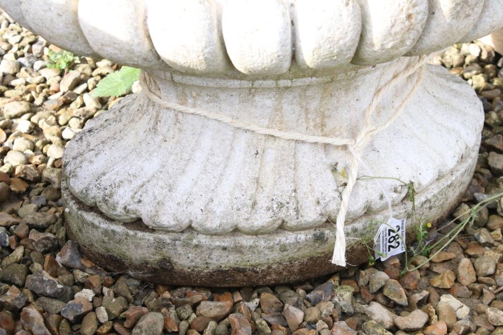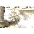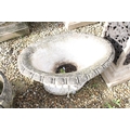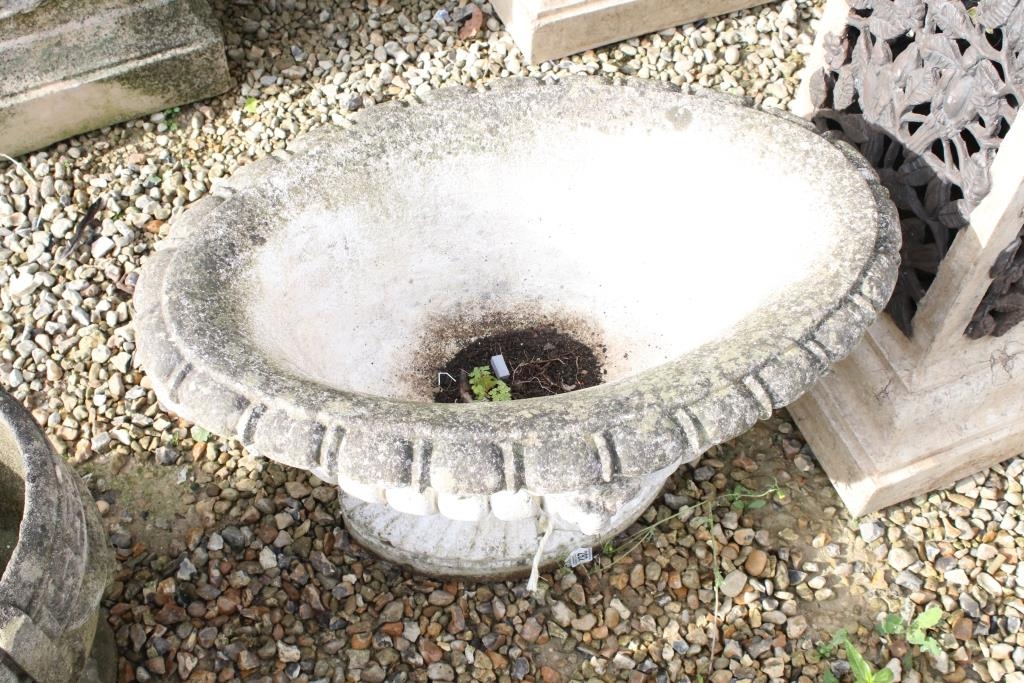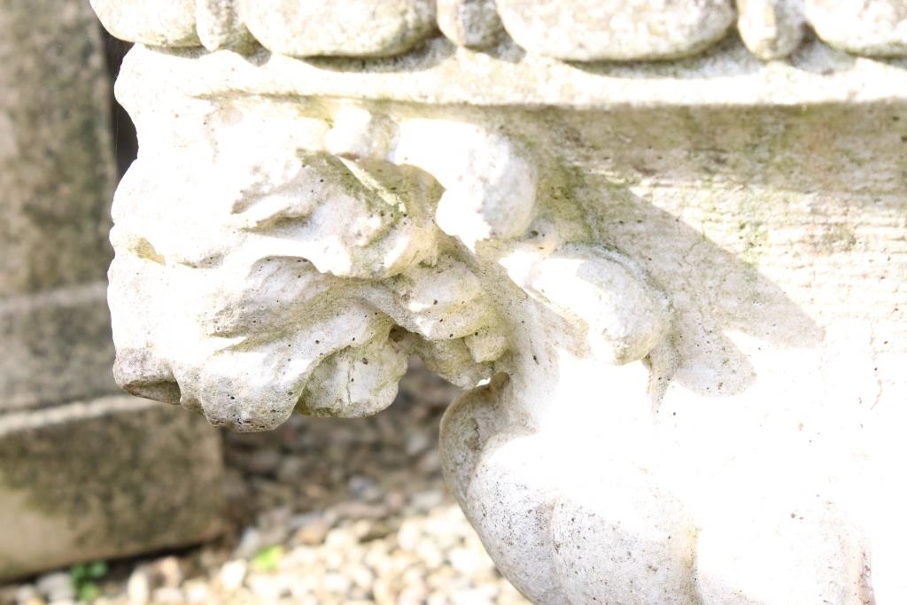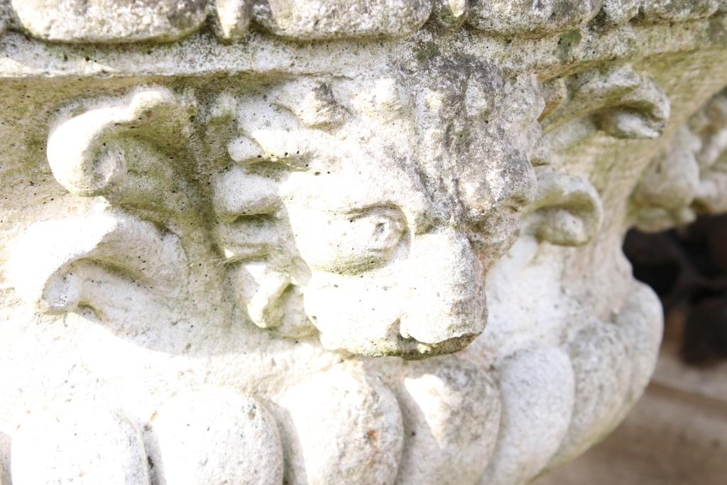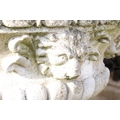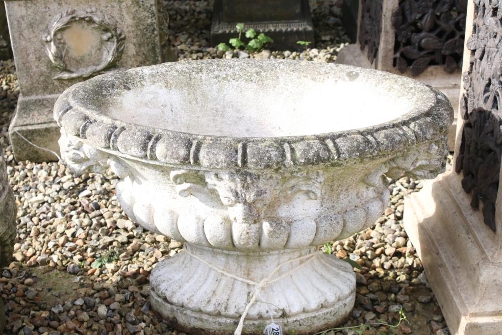 Reconstituted stone garden planter of oval form, with relief lion masks, raised on a fluted oval foot. (Measures approx 69cm W x 45cm H)