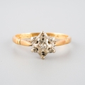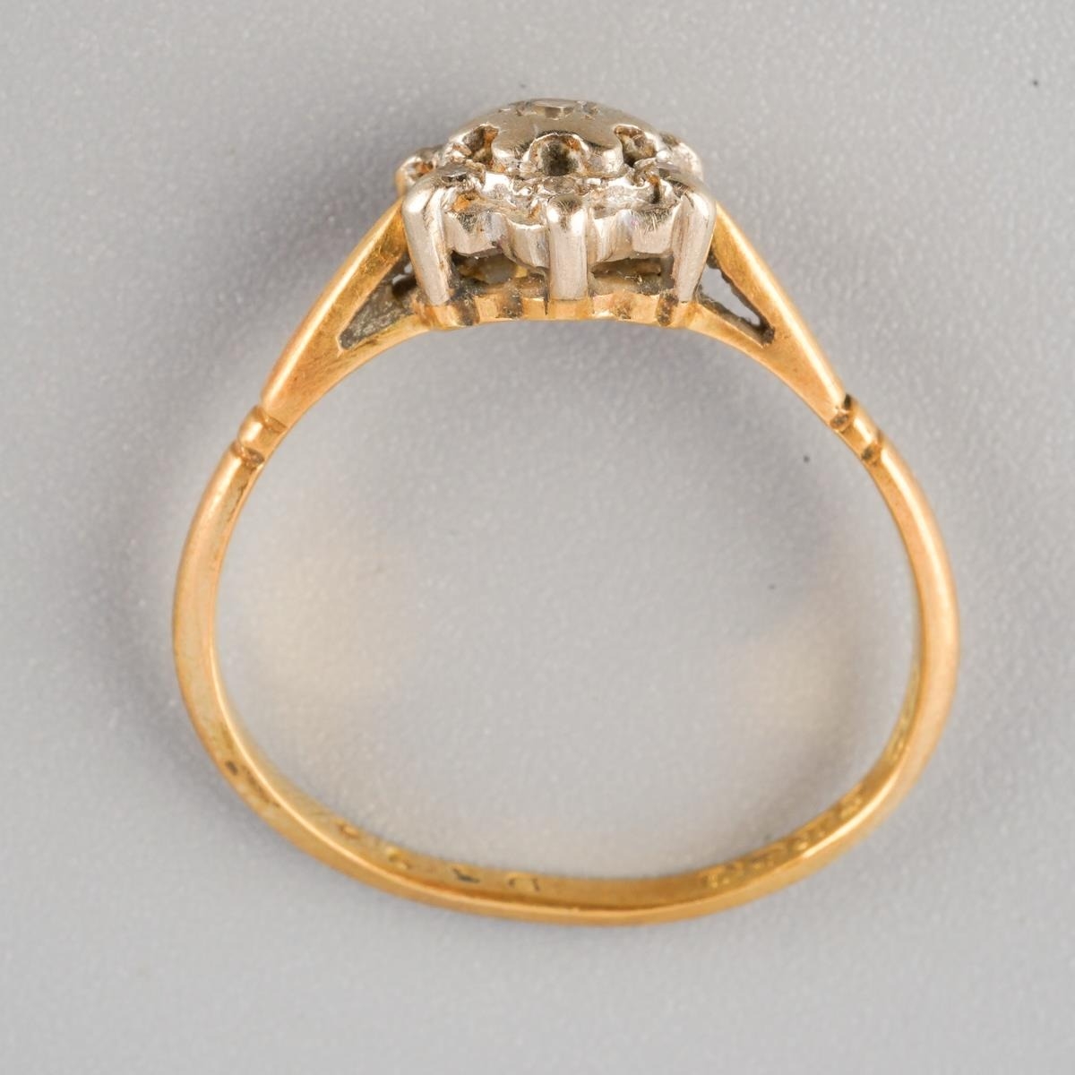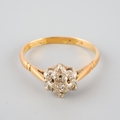 An 18ct gold diamond cluster ring. Hallmarked 18ct gold, approx ring size I (shank bent out of shape), approx gross weight 2.3 grams.