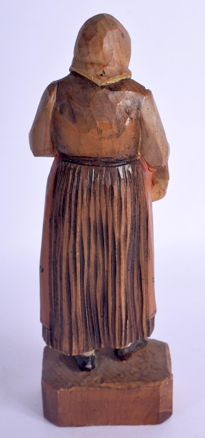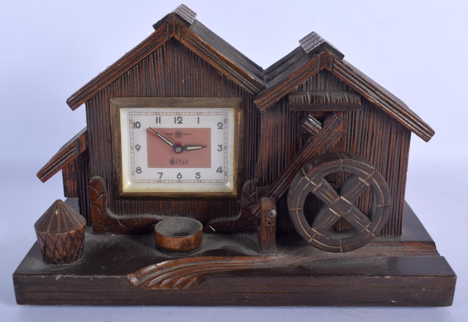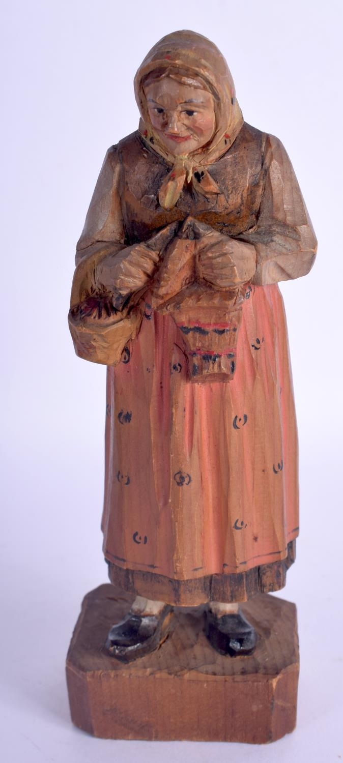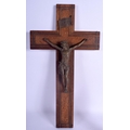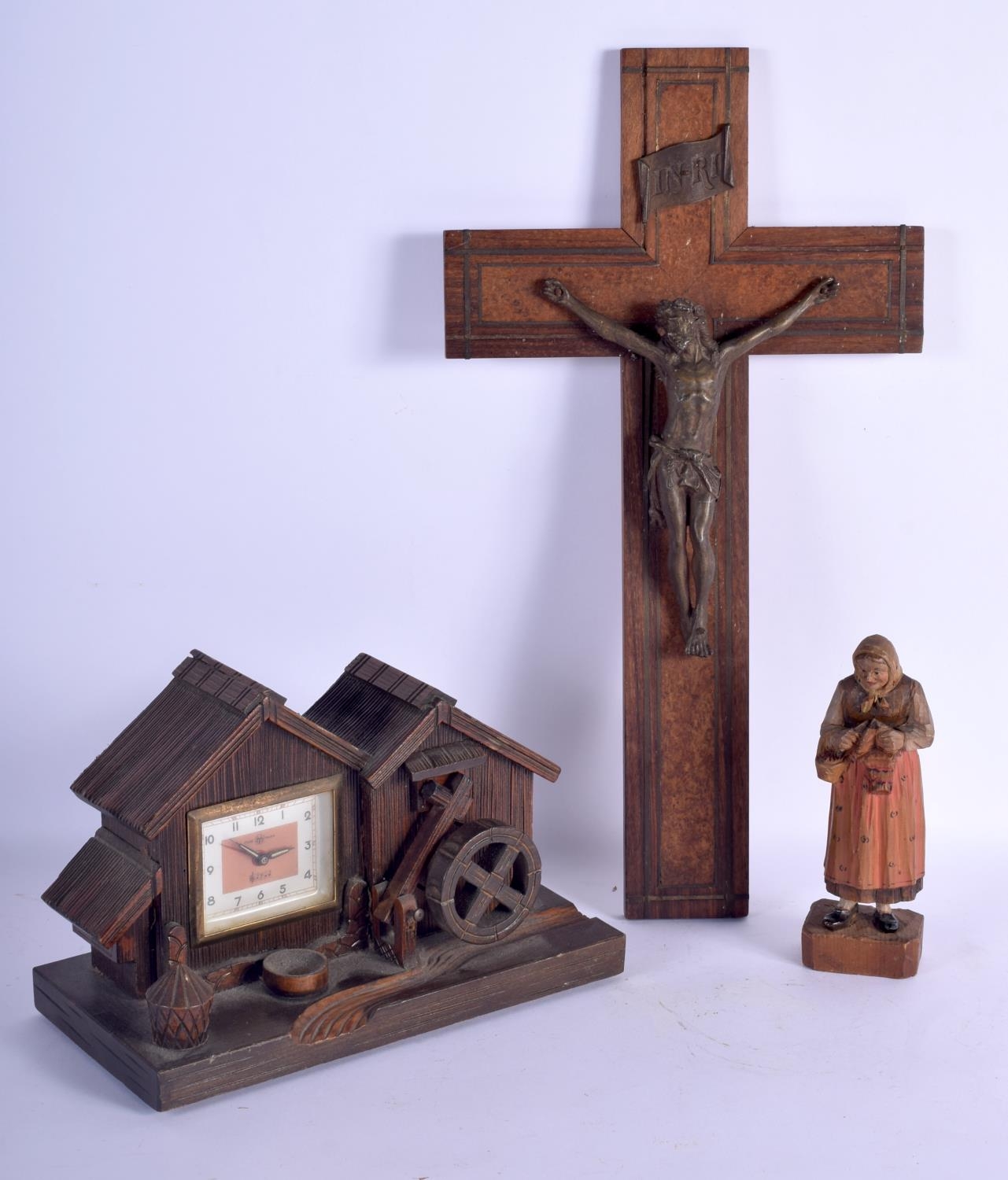A VINTAGE BLACK FOREST MUSICAL CLOCK together with a Bavarian figure & a corpus christi. Largest 40 cm x 22 cm. (3)