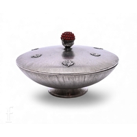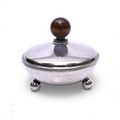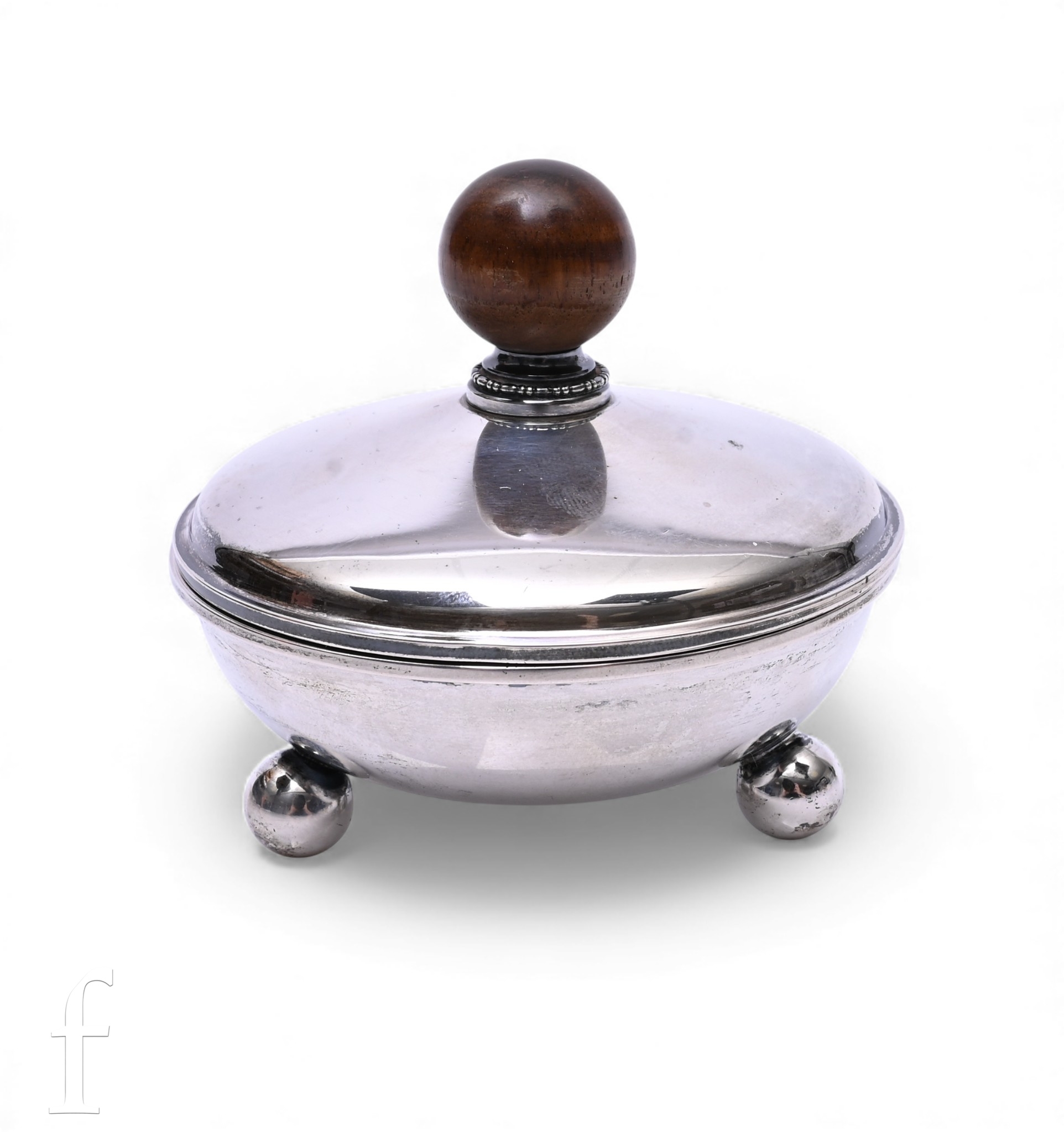 An Art Deco German silver bowl and cover, Julius Kaeser & Alfred Uhlmann, of circular form, the cover with embossed collar and turned wooden finial, the base on three ball feet, impressed 835 marks, diameter 8cm, total weight 2.52ozt.