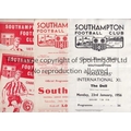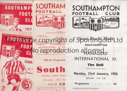 SOUTHAMPTON Fourteen home programmes including v QPR FA Cup 4th Round 26/1/46, folded, Grazer Sportklub 9/2/55, slightly marked, tape on one edge and slightly creased, Managers International XI including Joe Mercer, Raich Carter and Tommy Lawton, and Southend 24/3/56. Also 10 home programmes from the early 60's. Fair to generally good