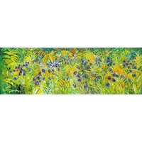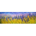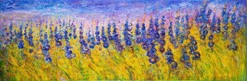 Carl Scanes [British, b. 1964] Twilight Delphiniums, 2004 signed lower left and inscribed to reverse oil on canvas 50 x 152cm (unframed)