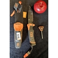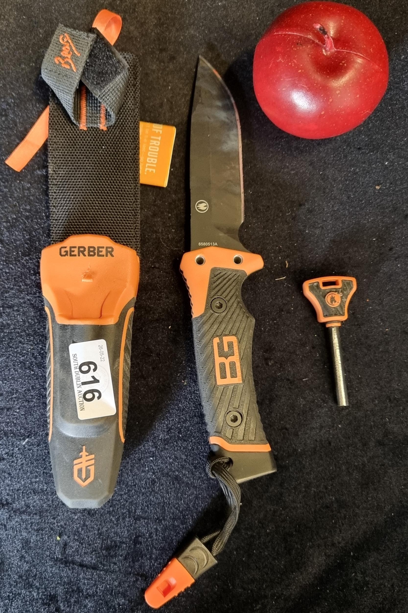 A Gerber Bear Grylls hunting knife with safety holster that has a built in knife sharpener. This comes with essential survival guide by the survivalist himself.