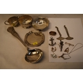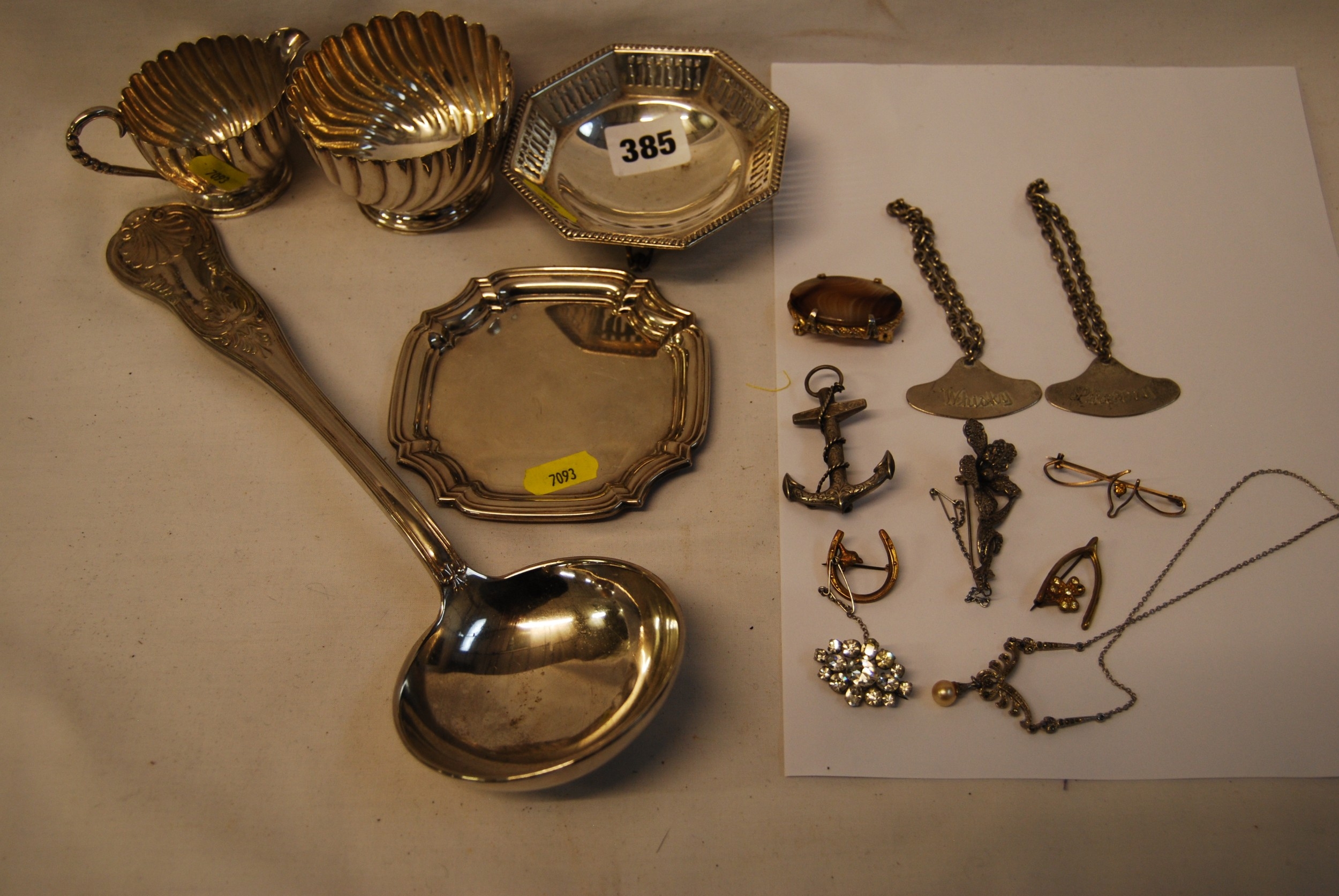 SILVER PLATED DISH STAMPED "TRIN COLL KITC 1932", KINGS PATTERN SILVER PLATED LADLE, SILVER PLATED JUG & SUGAR AND QUANTITY OF JEWELLERY