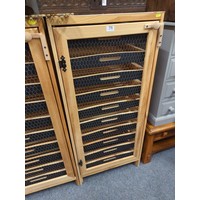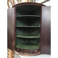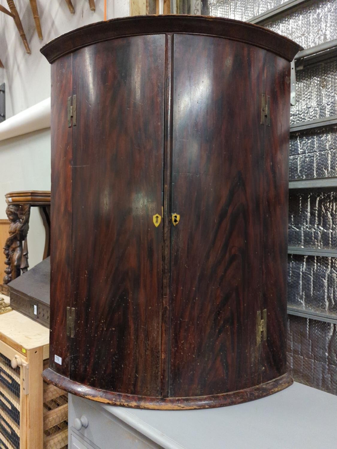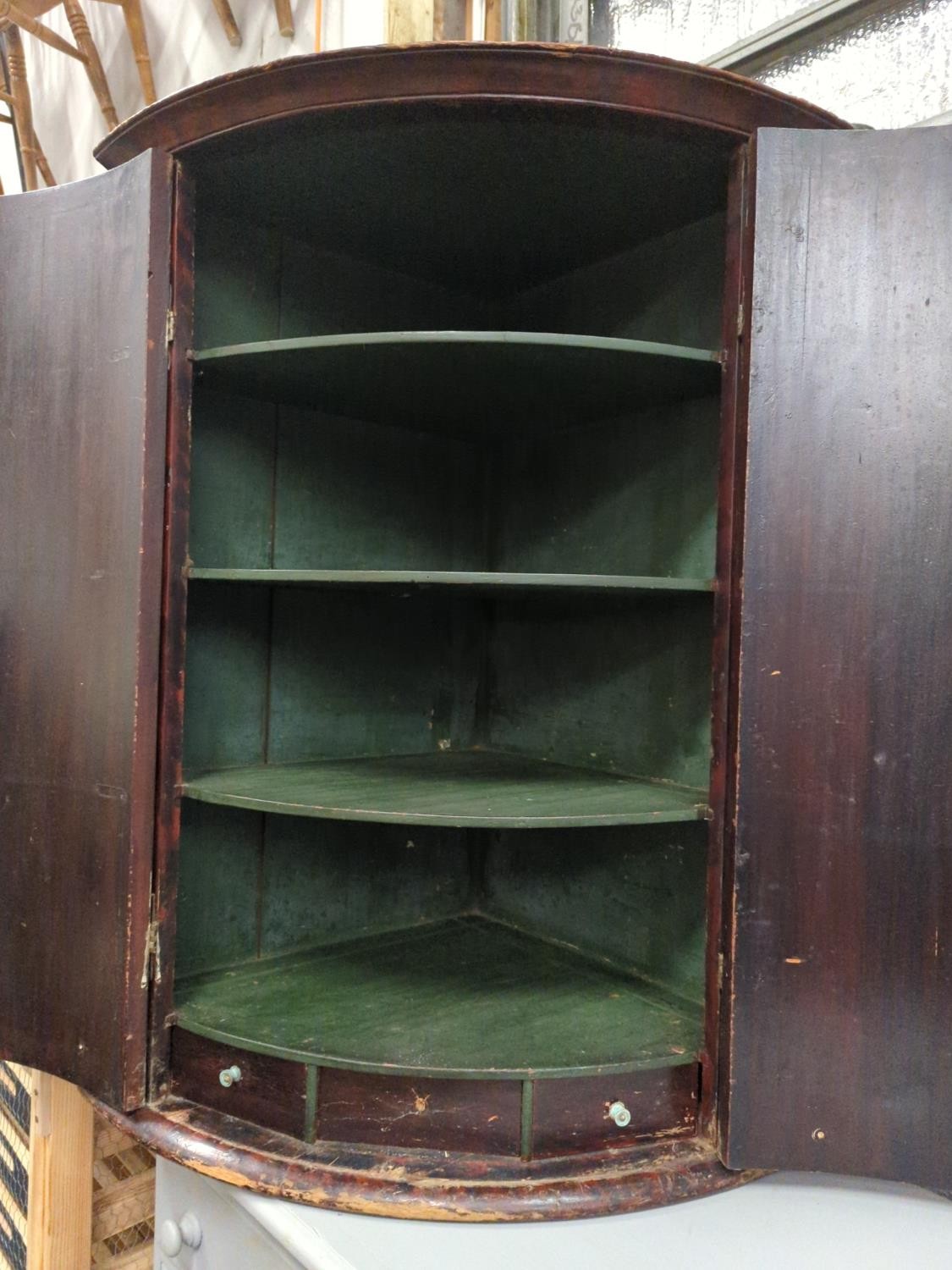 Georgian curved corner cupboard with internal drawers and shelves. With key. Height 101.5cm. Depth to corner 53cm.