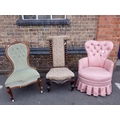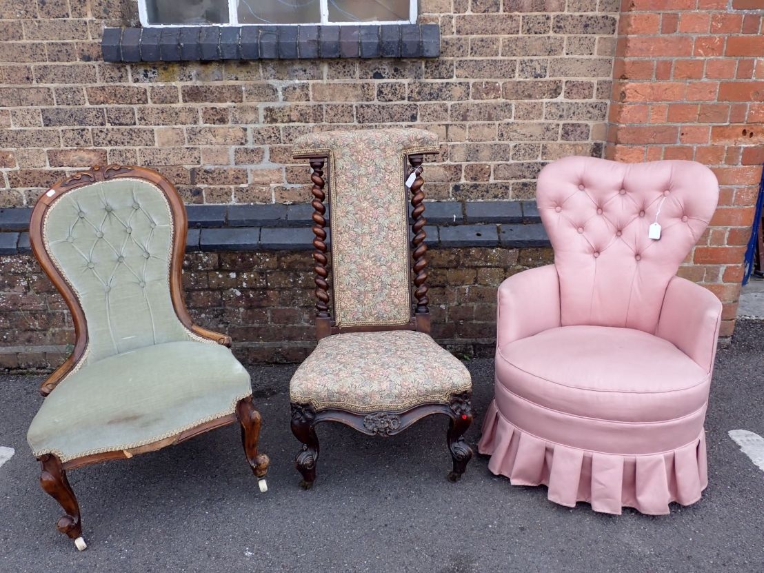 A HEART-SHAPED BACK ARMCHAIR with buttoned pink upholstery, and two Victorian chairs (the two latter a/f) (3)