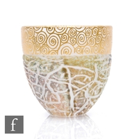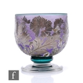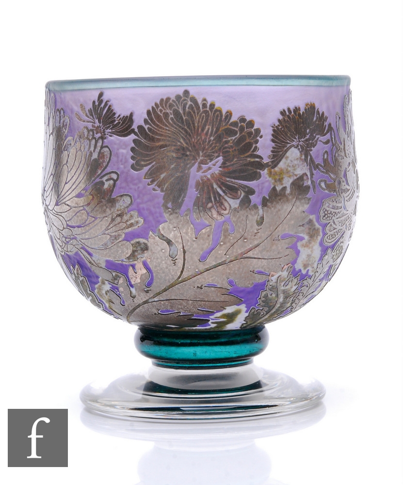 Timothy Harris - Ironbridge - A contemporary studio silver cameo cased glass Chrysanthemum bowl, of ovoid footed form, silvered flowerheads and leaves over mottled green and opal and amethyst ground, on emerald green knopped stem and clear glass circular foot, engraved signature, No.2/50, dated 2002, height 13cm.