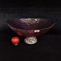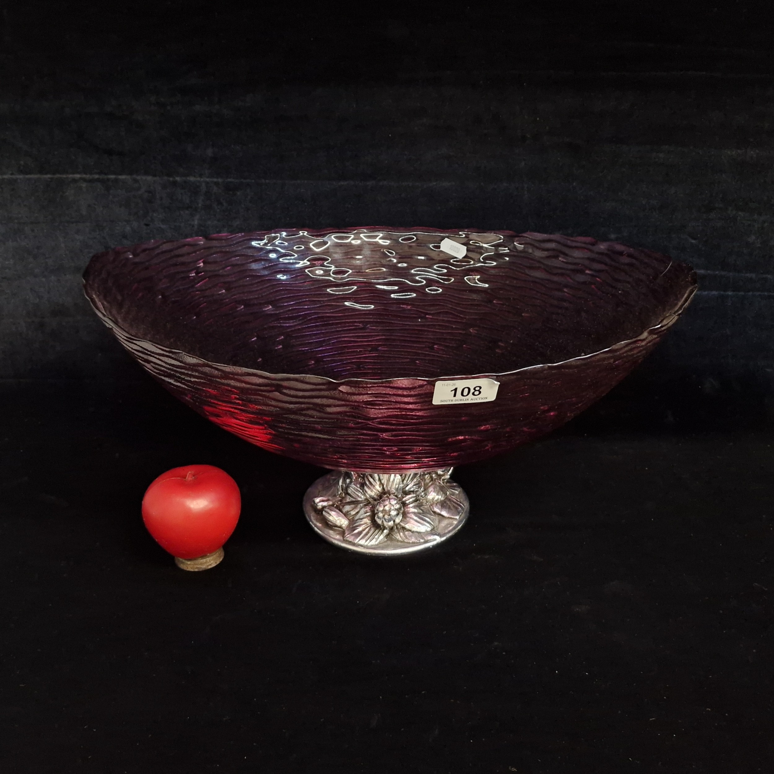 A very large and striking Cranberry glass centrepiece bowl with ribbed pattern body throughout and silver toned pedestal base with foliate and fruit motif. In excellent condition. Please note, the image of the modelled item was created by a new imaging/ staging software called showiton.ai. Upload a simple image of a piece of jewellery and the software stages it on a model for you. Paste the URL (showiton.ai) into your browser and try it for free. It’s a very simple, user-friendly platform.