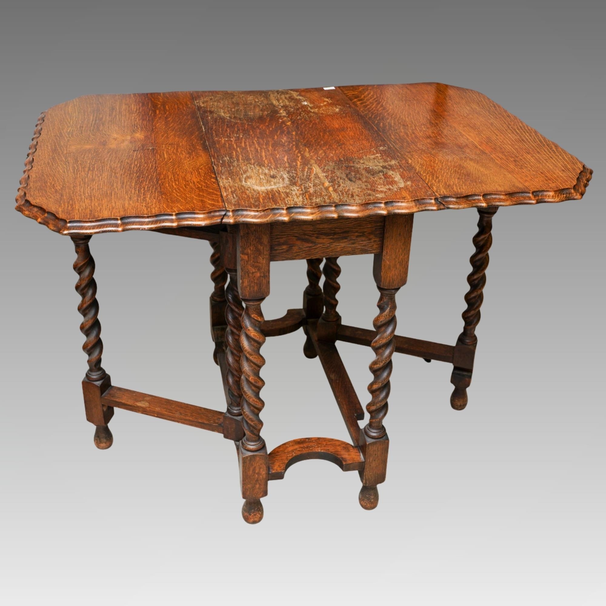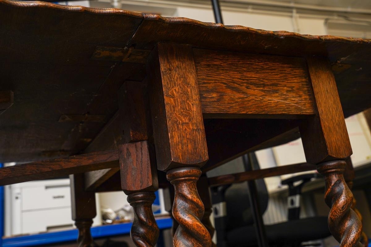 A Victorian style oak drop leaf gate leg table on barley twist supports, approx 76cm wide x 74cm high x 40cm wide unextended [1]