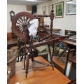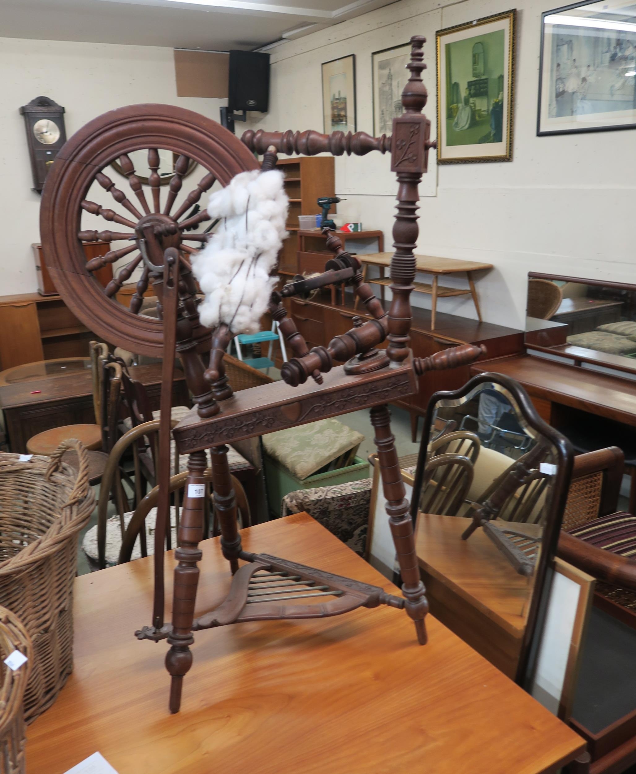 A 20th century stained teak spinning wheel, Mahogany framed wall mirror and a framed print (3)
