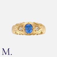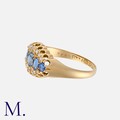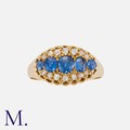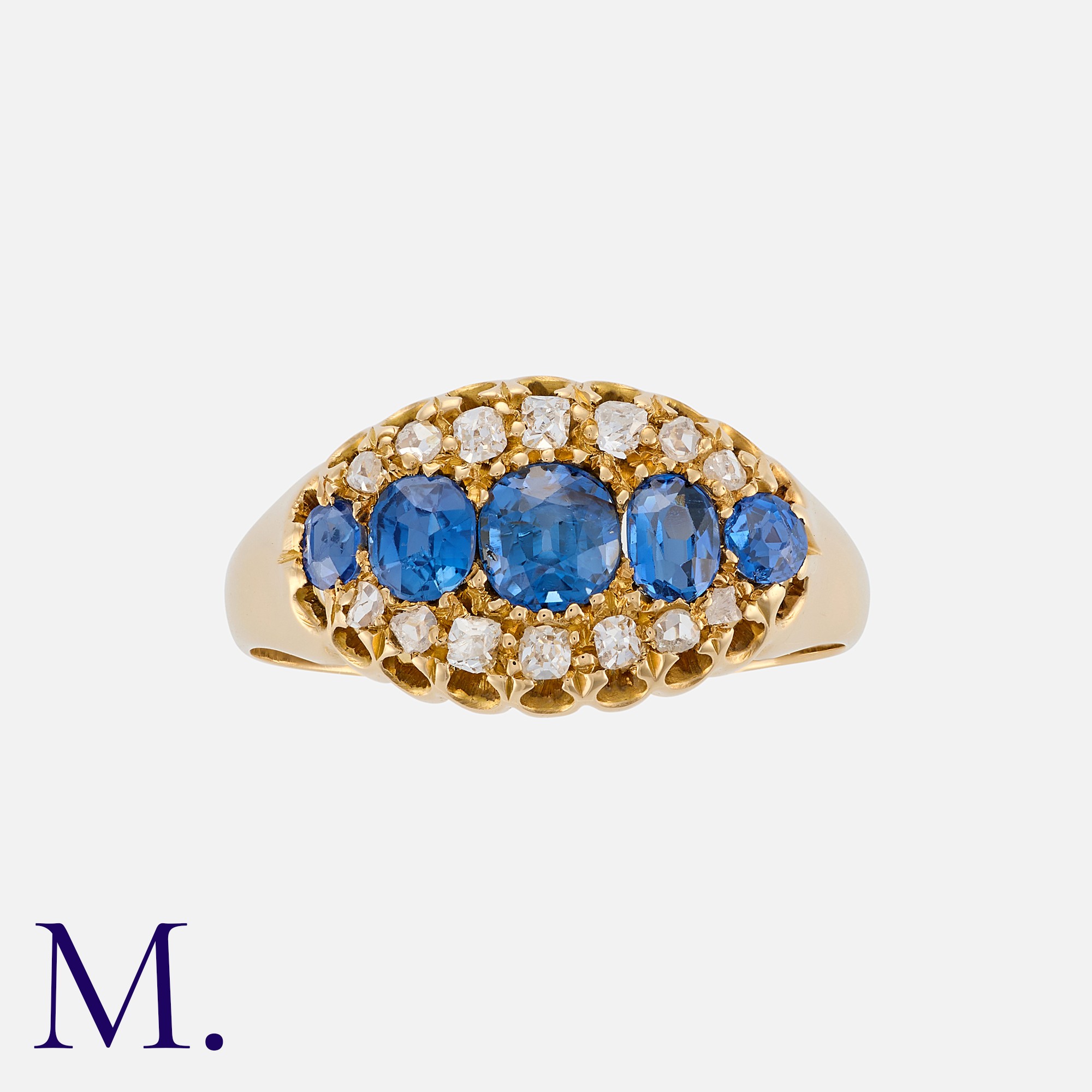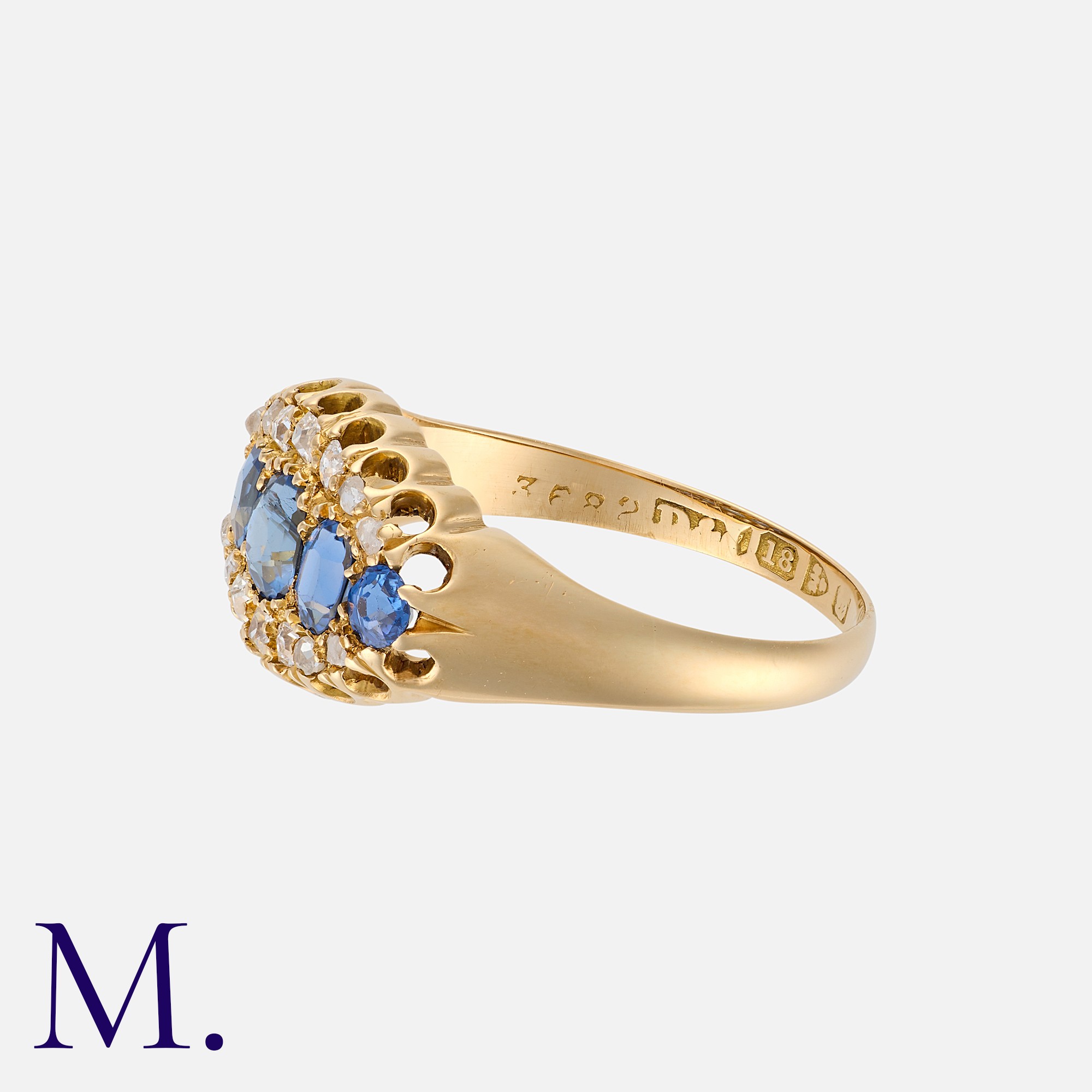 An Antique Sapphire and Diamond Ring in 18 carat yellow gold, set with a central row of blue sapphires, flanked top and bottom by a row of old and rose cut diamonds. Marked 18 for 18 carat gold.