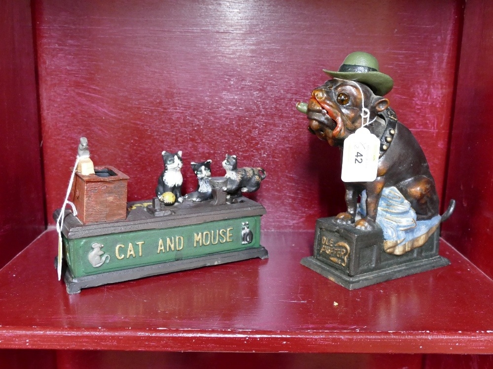 Two reproduction cast metal money boxes, cat and mouse and Ole Puffer