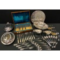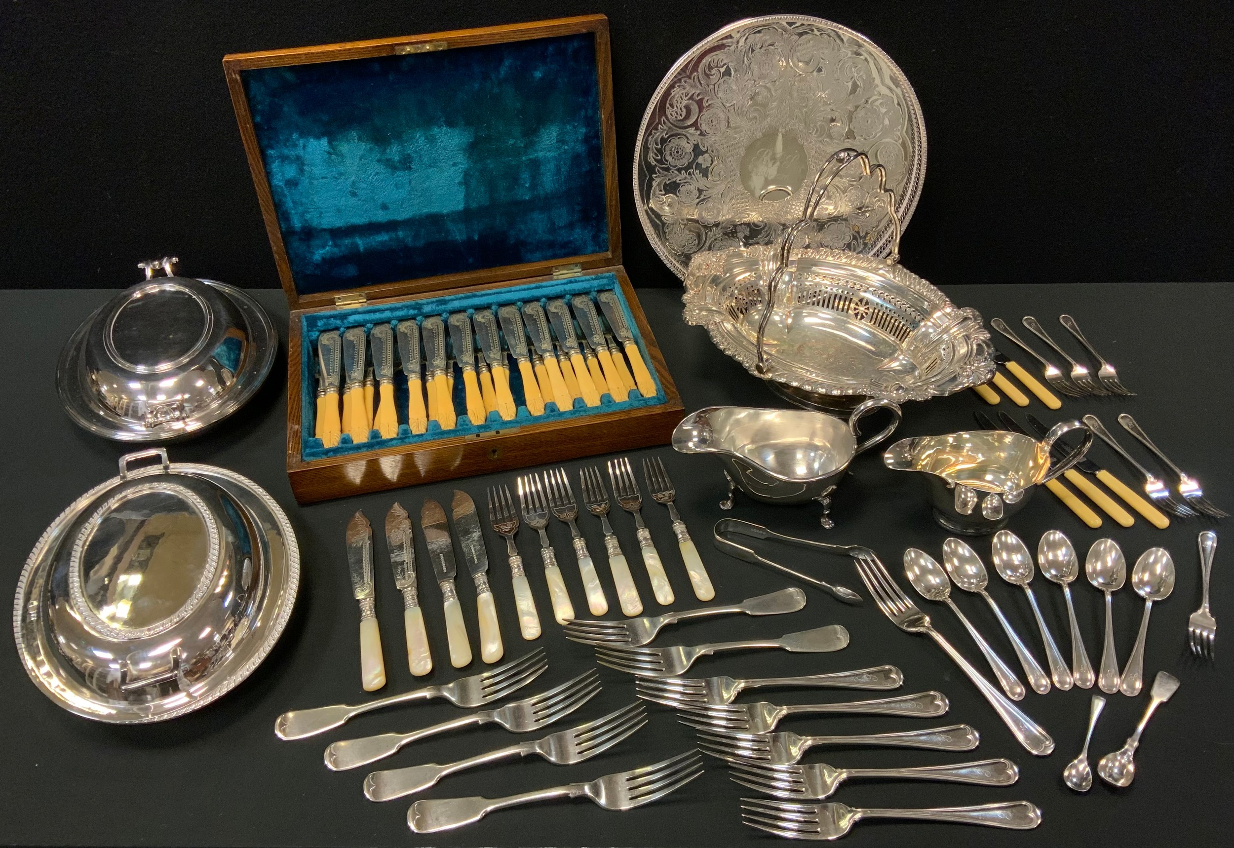 A Silver plated fish service for twelve, carved handles; two oval entree dishes; Victorian Swing handle basket etc