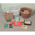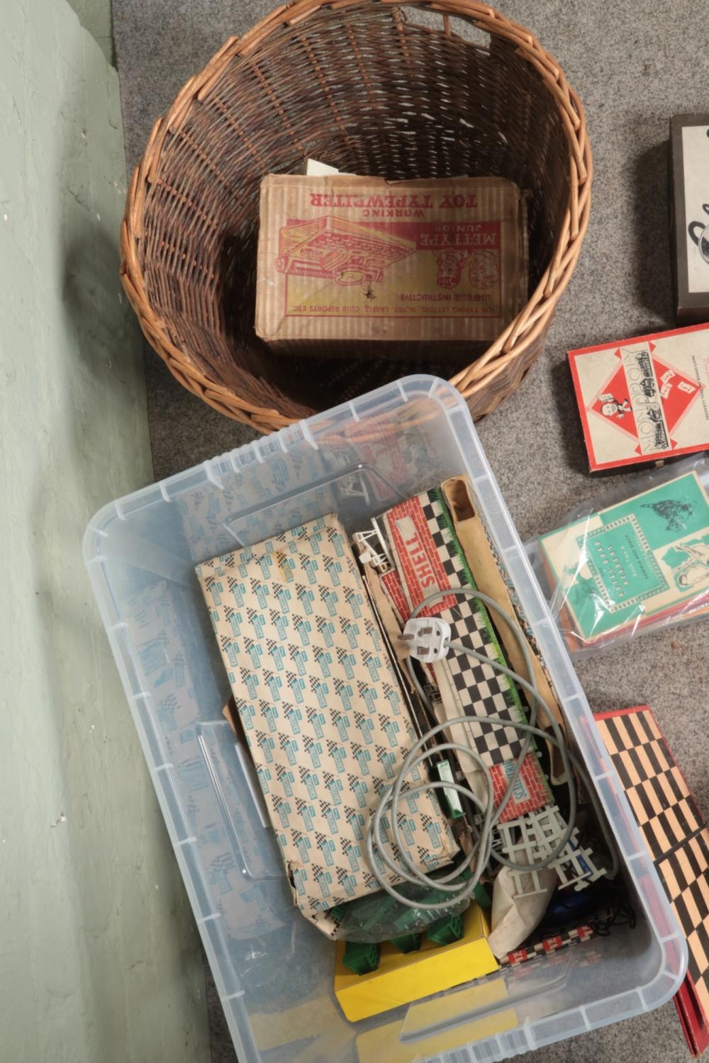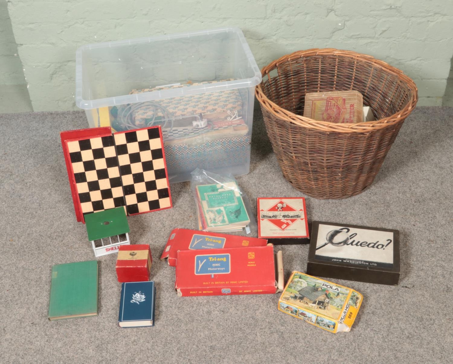 A box and wicker basket containing an assortment of children's toys and books to include Scalextric, Monoply, Cluedo, etc.