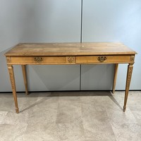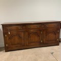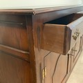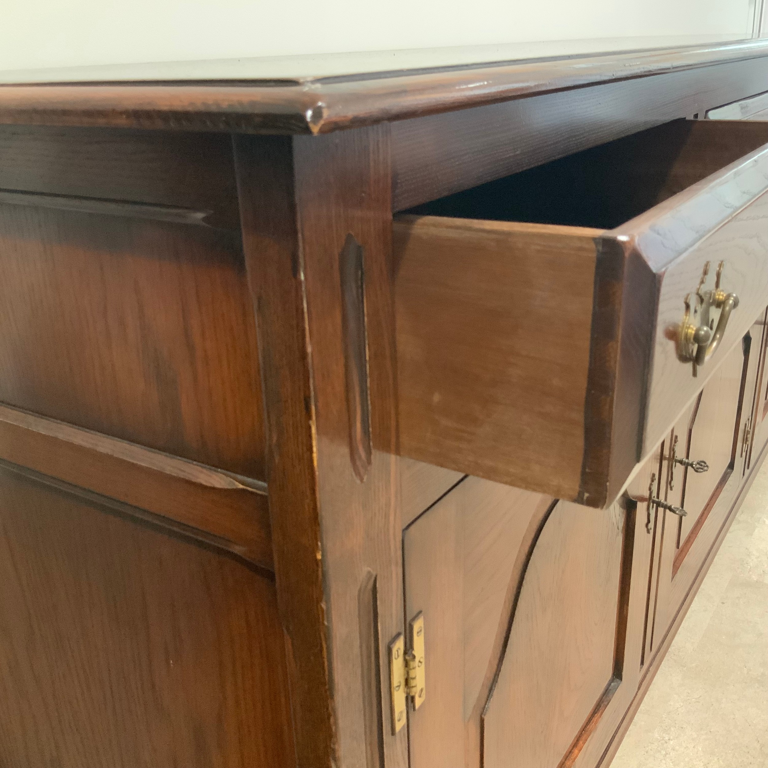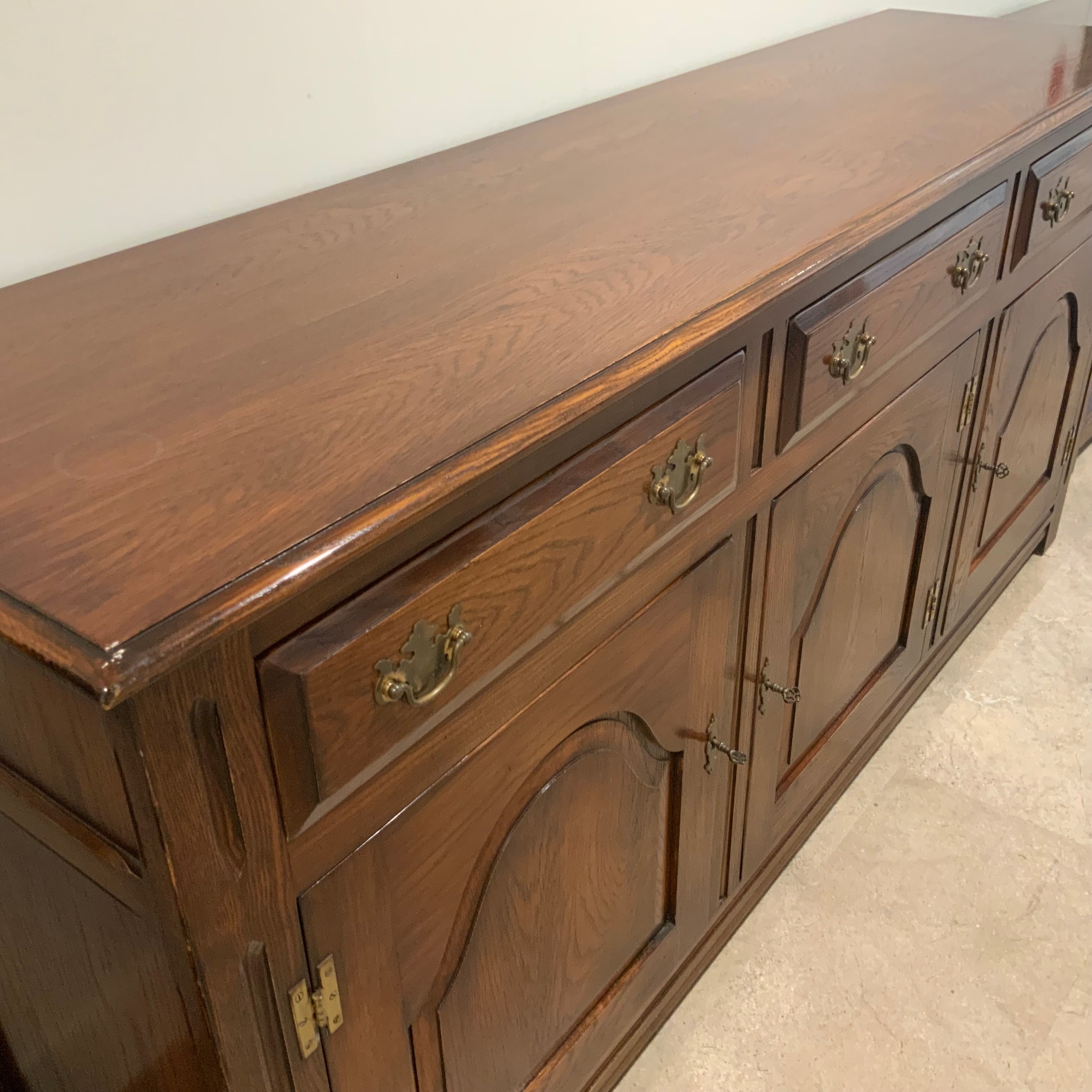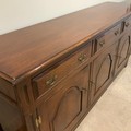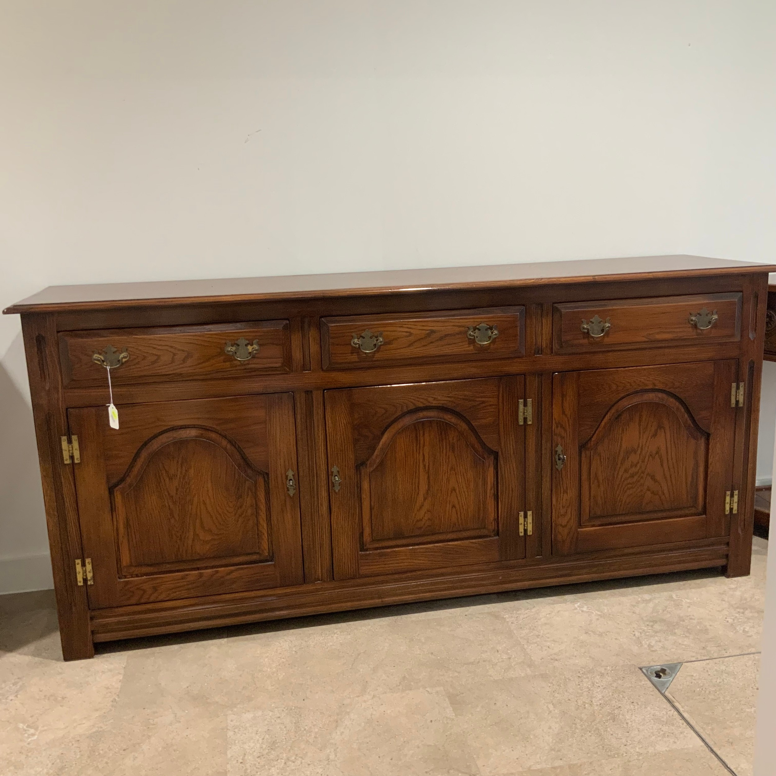 Batheaston oak sideboard, with finely grained top above three drawers with brass drop handles, above three cupboards, each panelled door enclosing a single internal shelf. H84cm x W182.5cm x D46.5cm.
