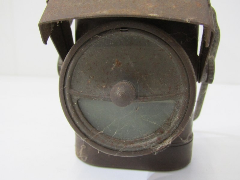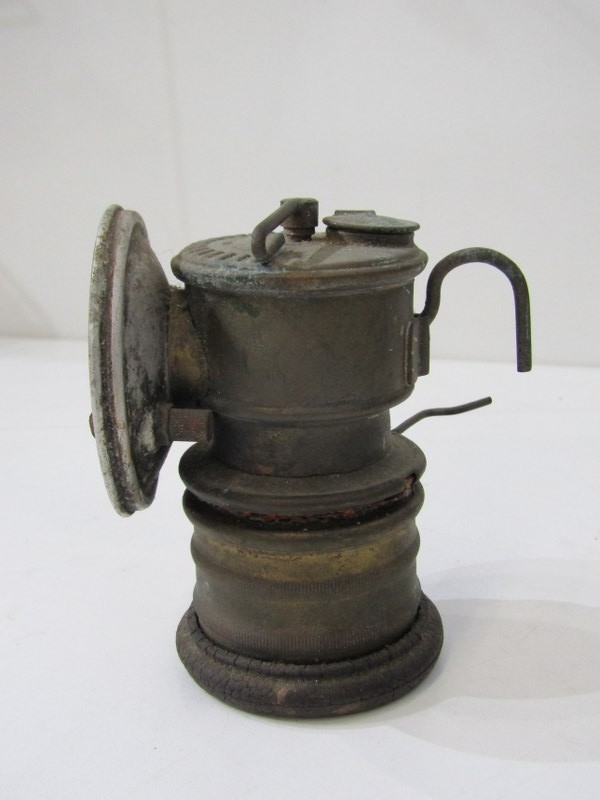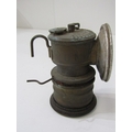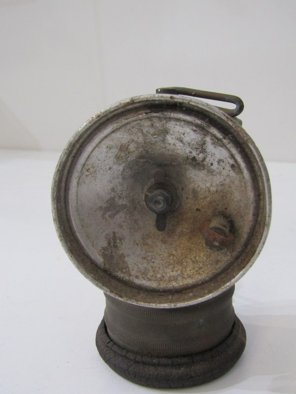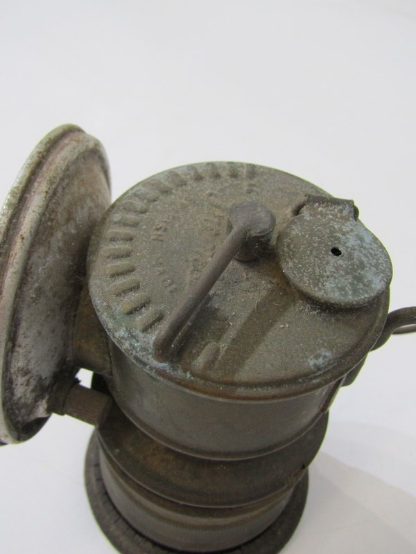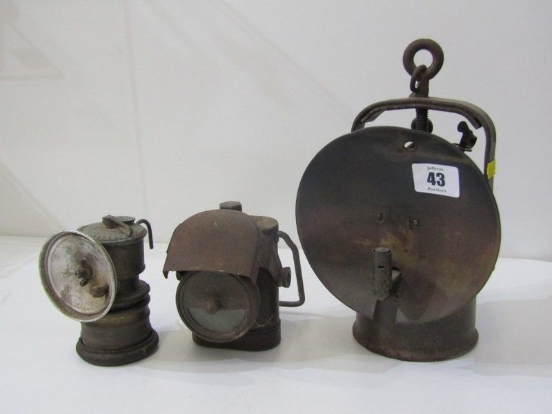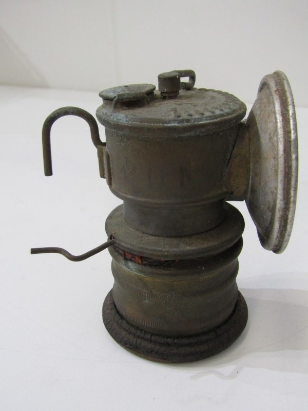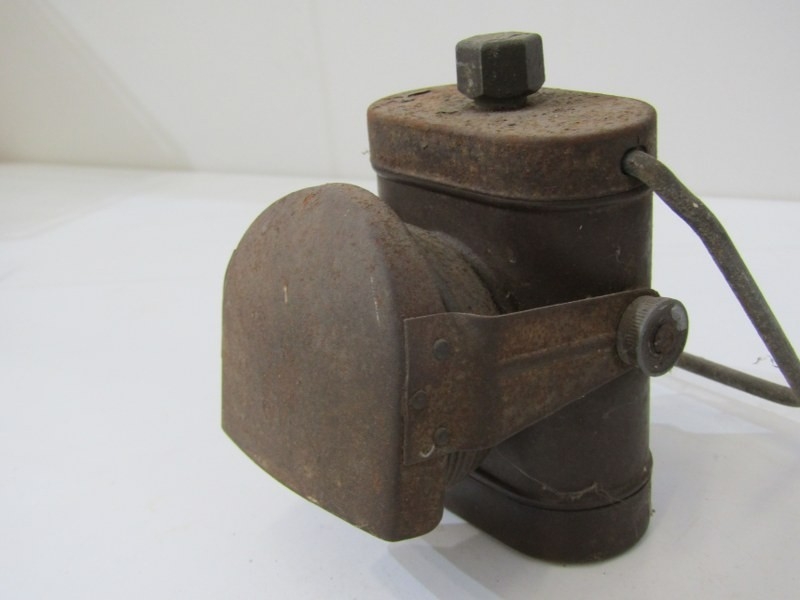TWO MINER'S CARBIDE LAMPS, one cap lamp and one hand lamp, together with a World War II blackout bicycle lamp